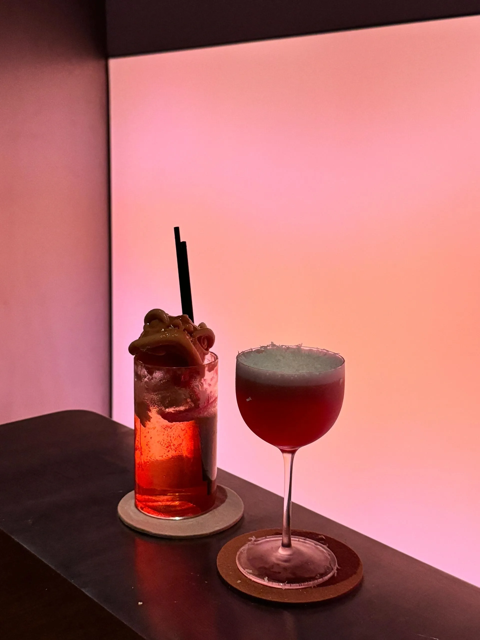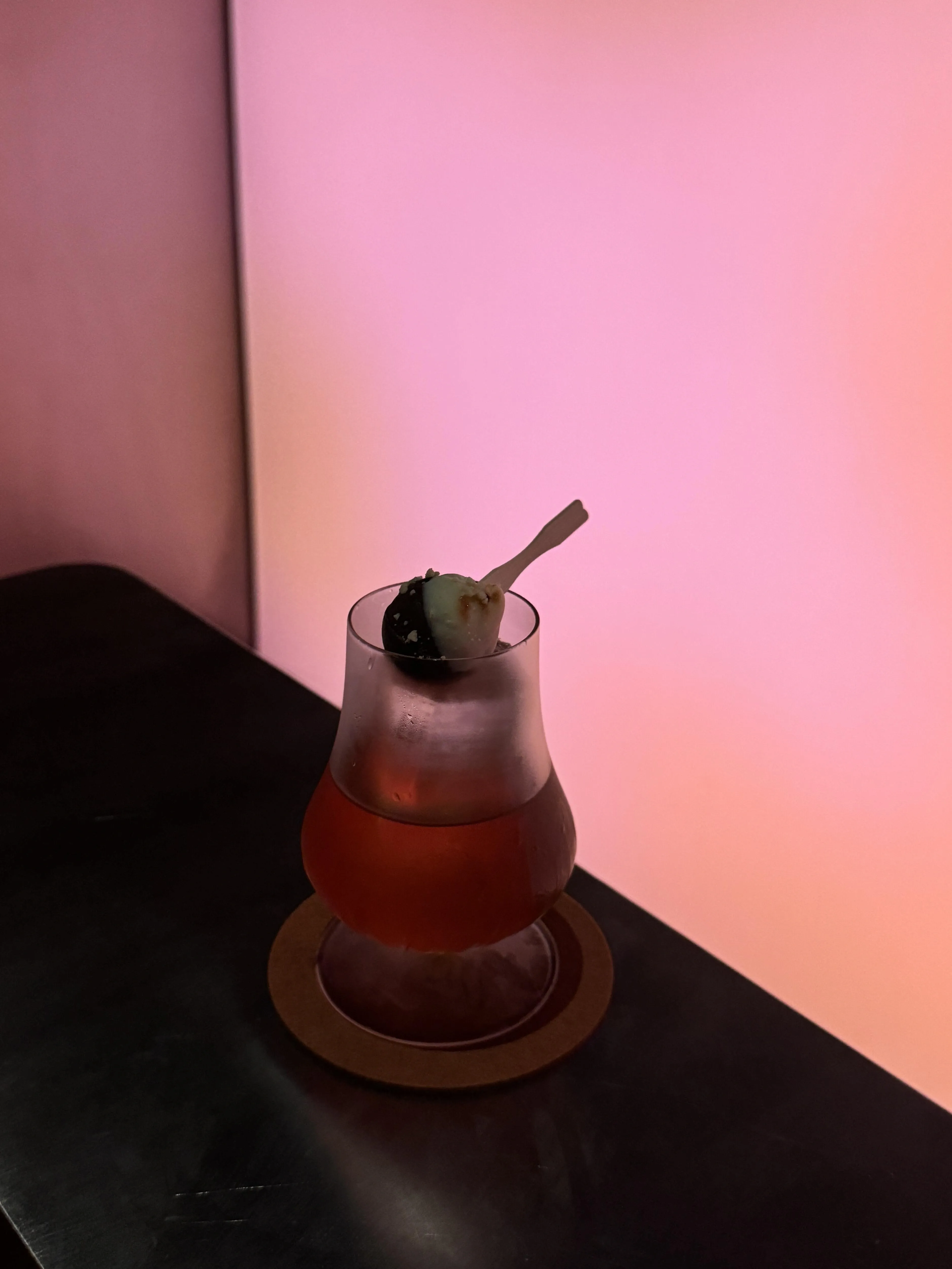“我在期待你起早的故事”是一款改良版的Negroni,融合了草莓、杏仁黄油和绿咖啡的味道,还加入了巴斯克蛋糕,比传统Negroni更具层次感。