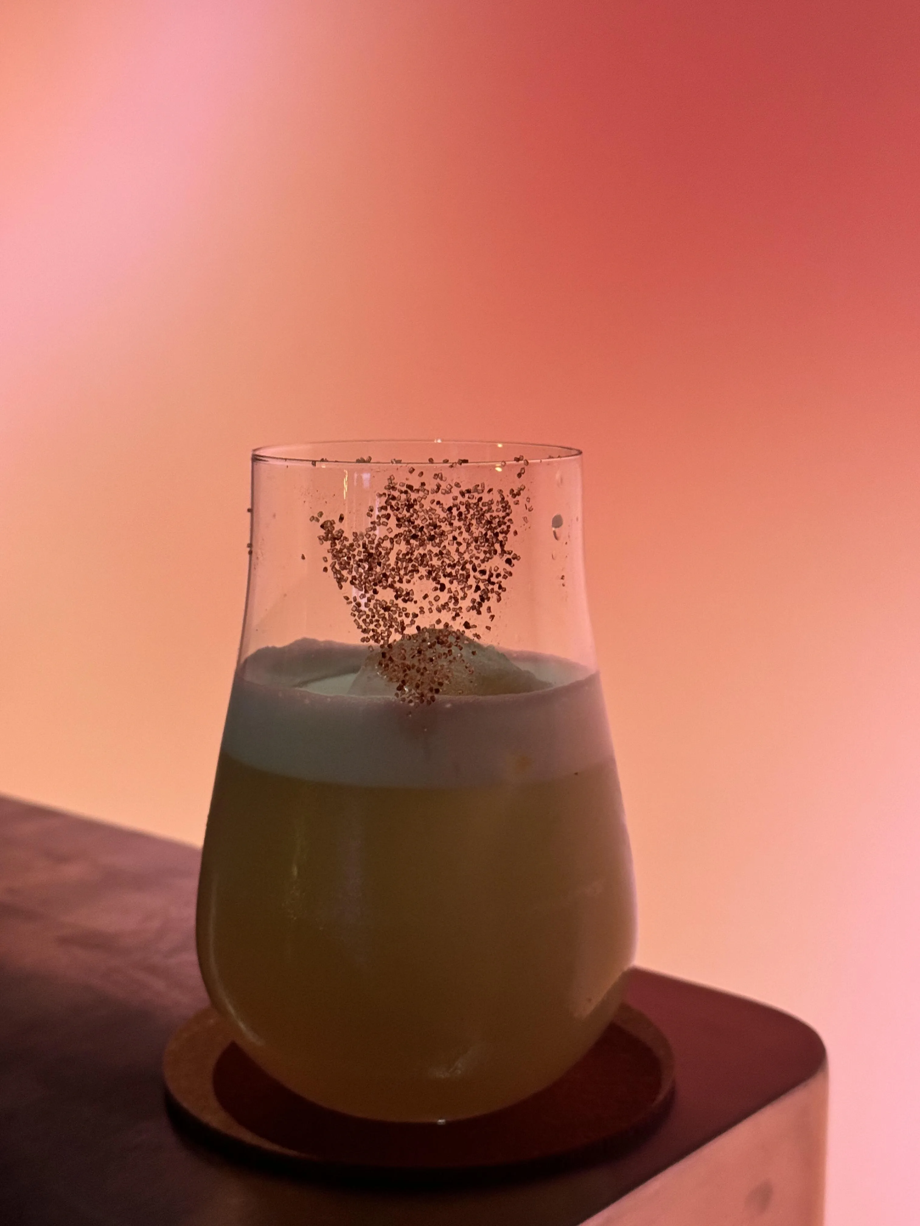 三叶草轶事是我最喜欢的一款。这是Clover Club的改编版,酒体融合了蜂蜜柚子的果香与黄油的奶香,上层的芝士则提供了咸香与独特的口感,层次非常丰富。