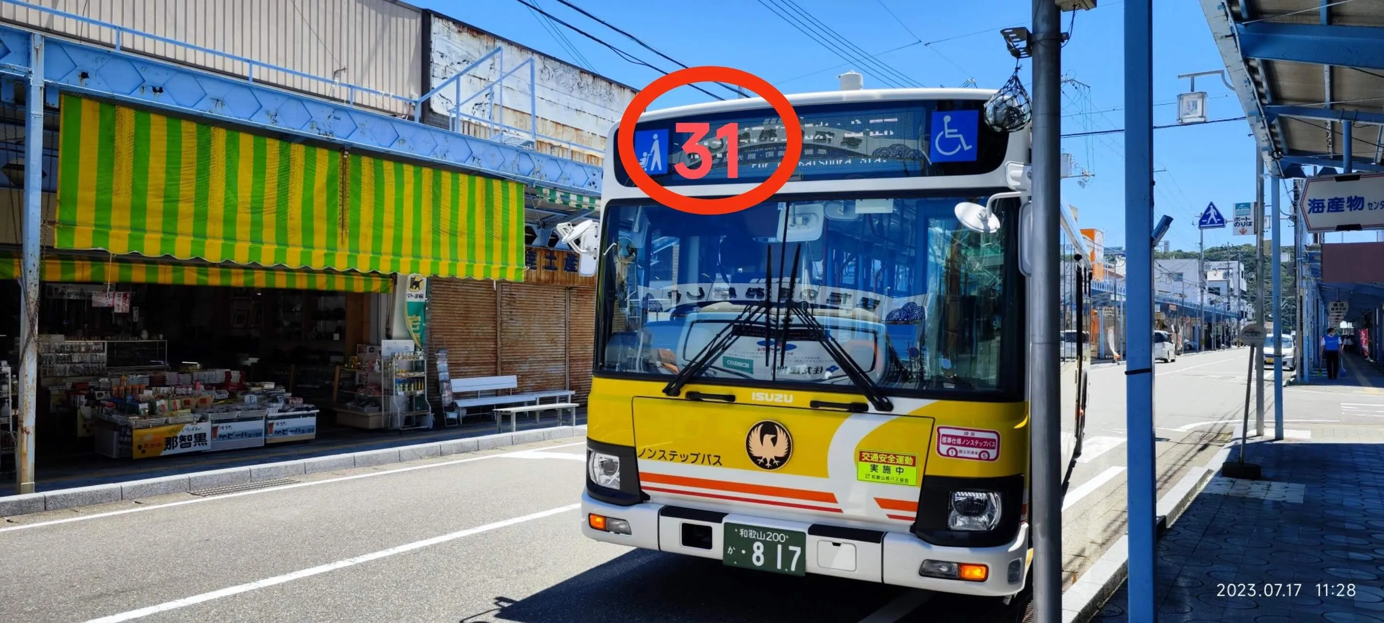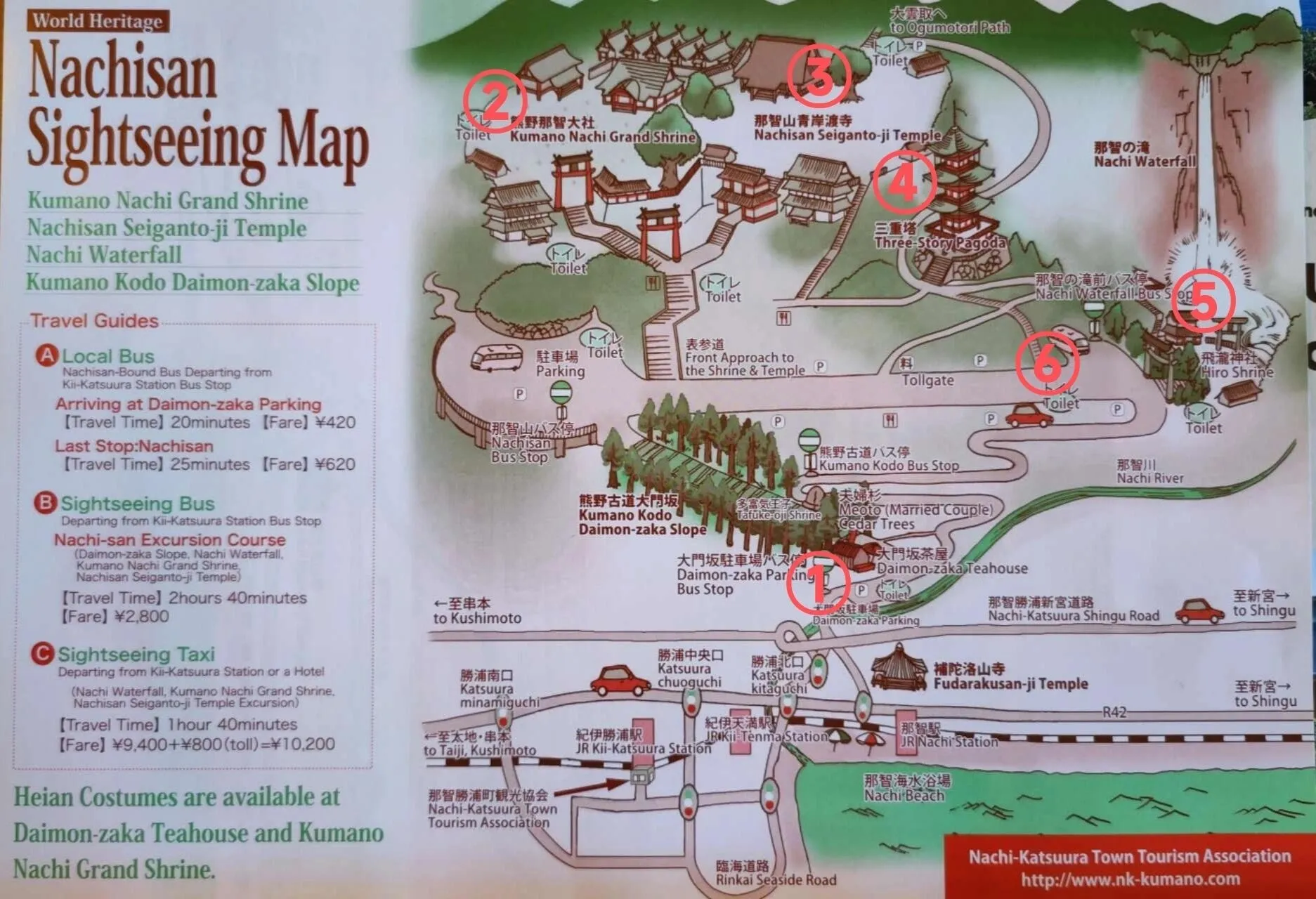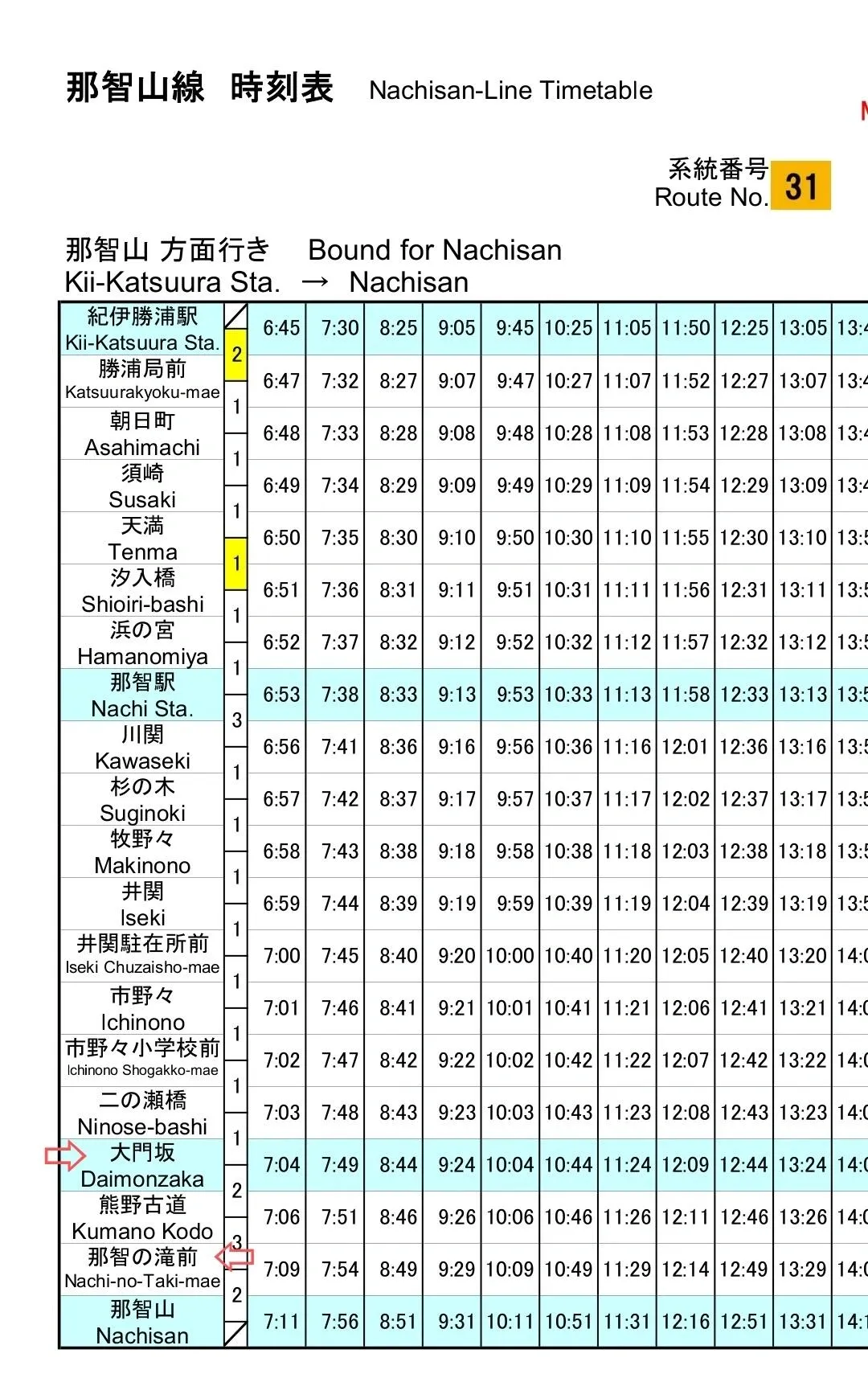 31路:从纪伊胜浦站或那智站上车,到大门板站下车。可以游览熊野古道、熊野那智大社、那智山清岸渡寺、三重塔和那智之滝。