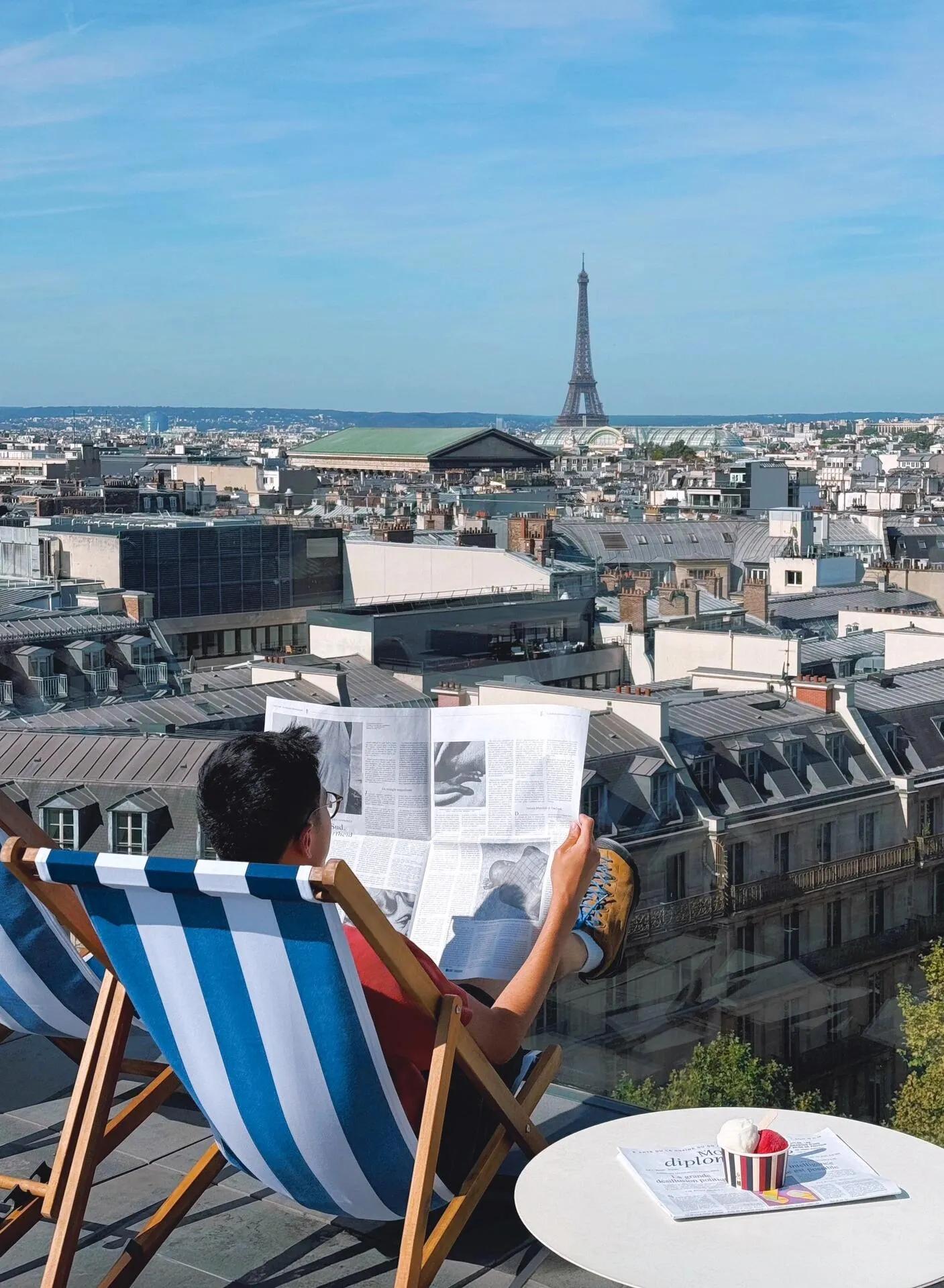 老佛爷百货顶楼 :悠闲地看报纸,俯瞰巴黎美景。