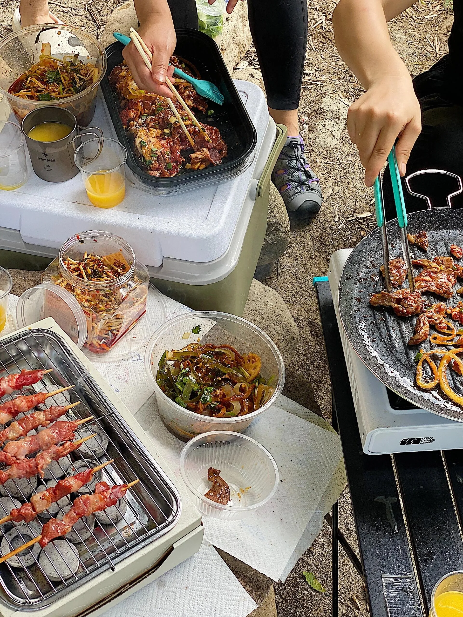 到了目的地才发现忘记带天幕,不过没关系,那边有个大桥可以避凉。我们就地取材,搬了些石头当桌椅,很有野趣。