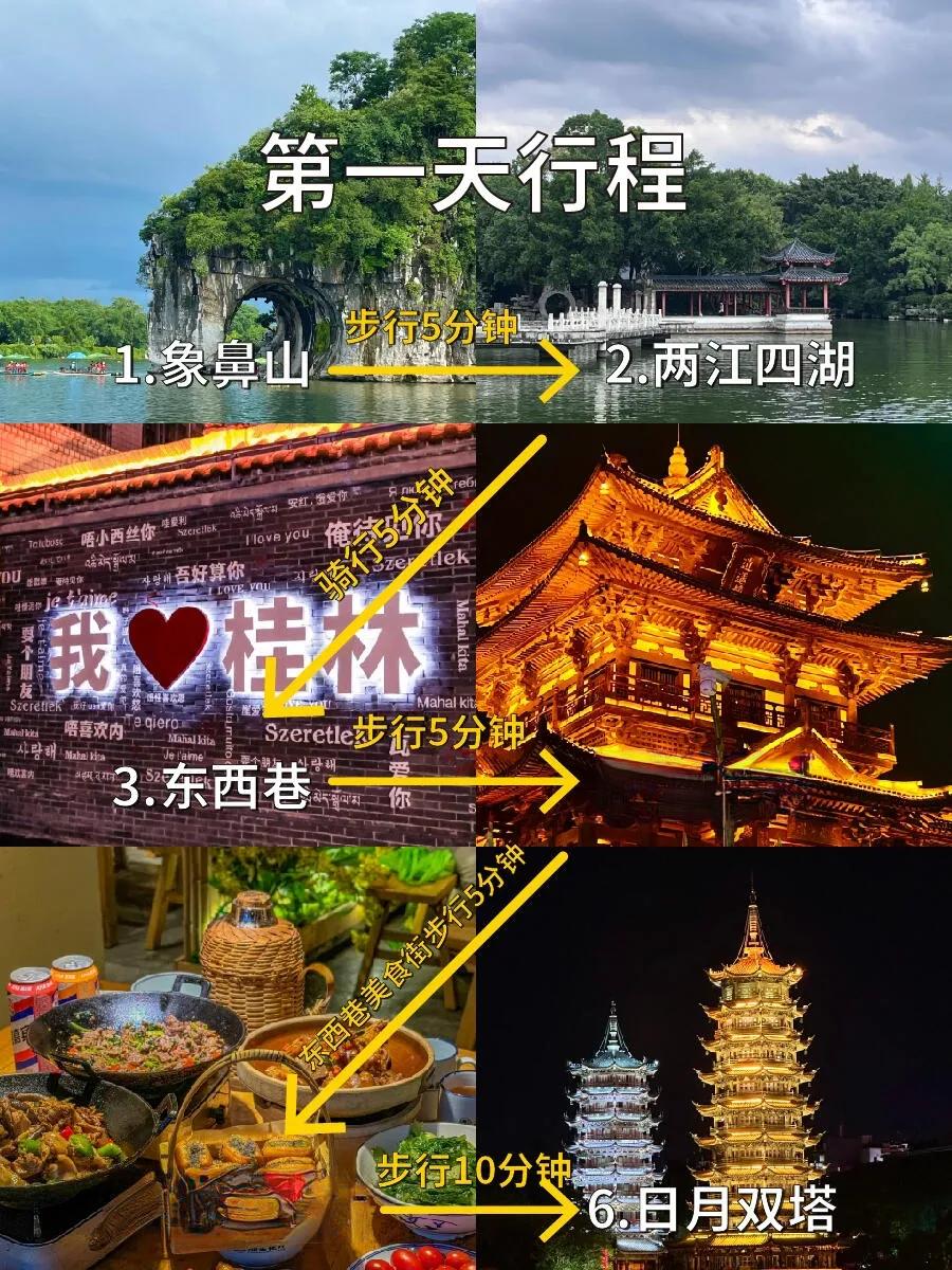第一天:抵达后游览象鼻山、东西巷、逍遥楼和两江四湖。