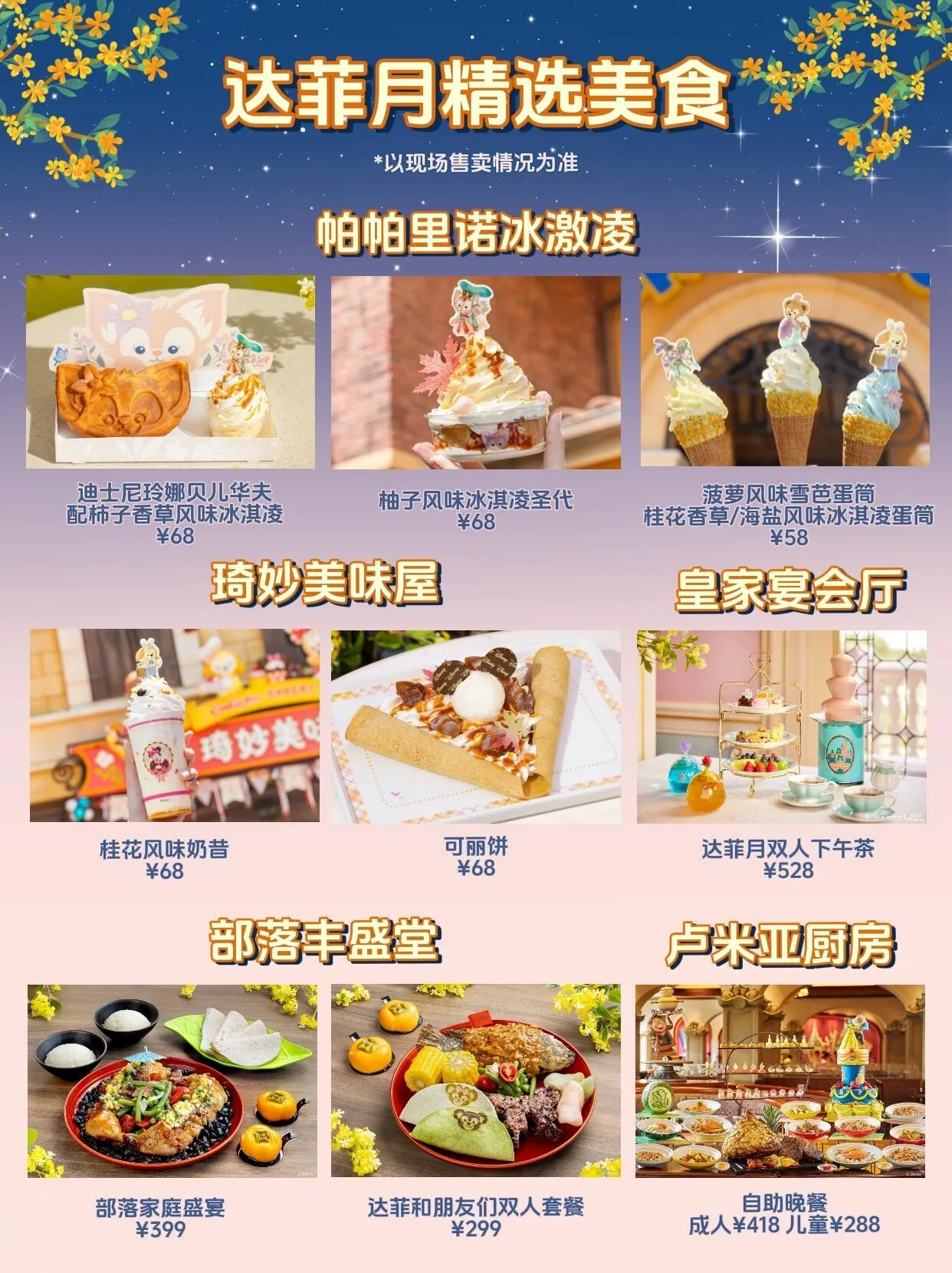 多个餐厅推出特色美食,包括帕帕里诺冰激凌的精选冰淇淋和华夫,琦妙美味屋的柿子和柚子主题美食,皇家宴会厅的双人下午茶/早午餐,卢米亚厨房的自助晚餐,以及爆米花车上的达菲和朋友们主题爆米花包。