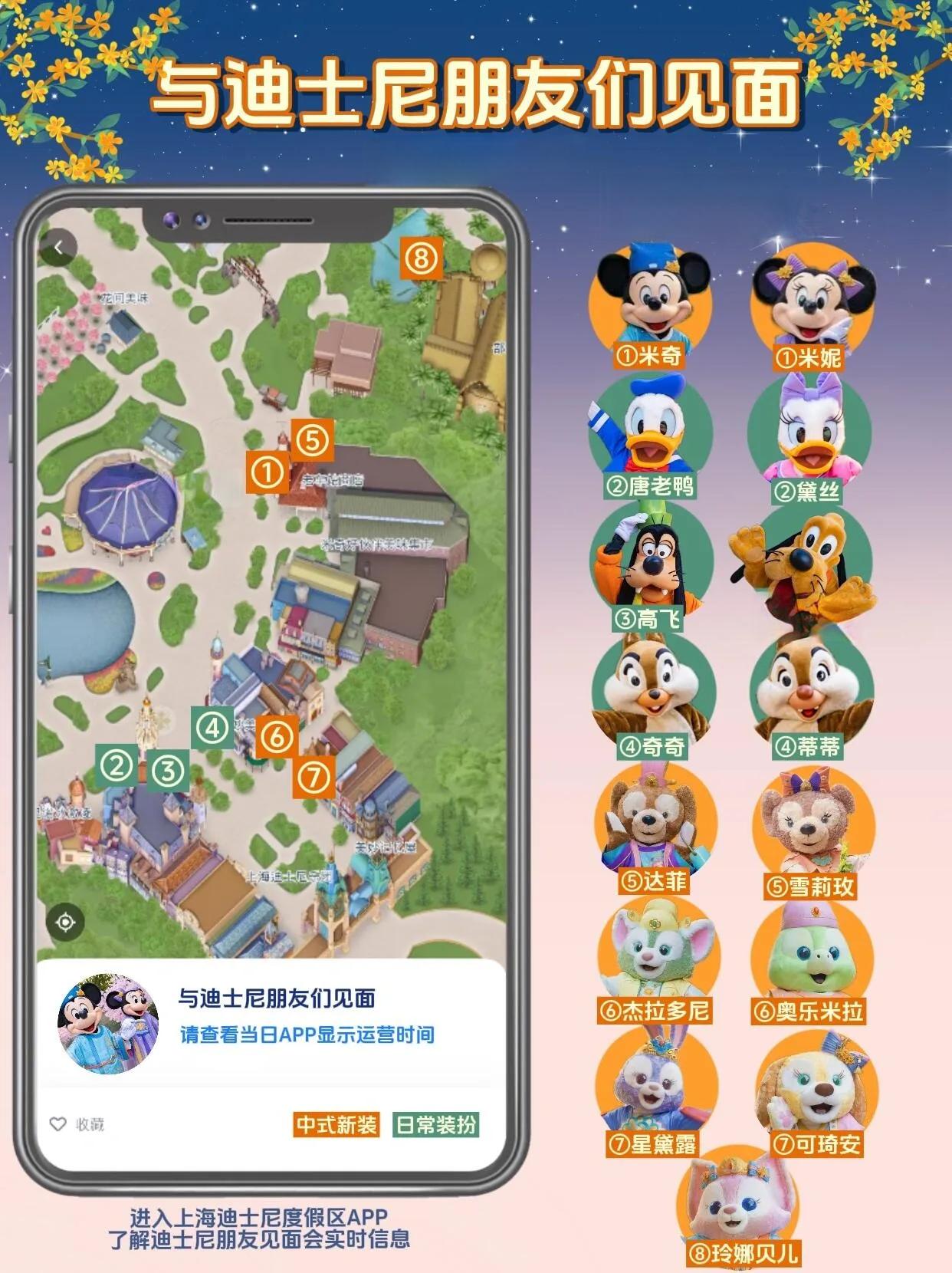 米奇、米妮、达菲、雪莉玫、杰拉多尼、奥乐米拉、星黛露和可琦安都穿上了特别的中式服饰,与游客共度佳节。其他角色如唐老鸭、黛丝、高飞、布鲁托、奇奇和蒂蒂也将在园区与游客见面。