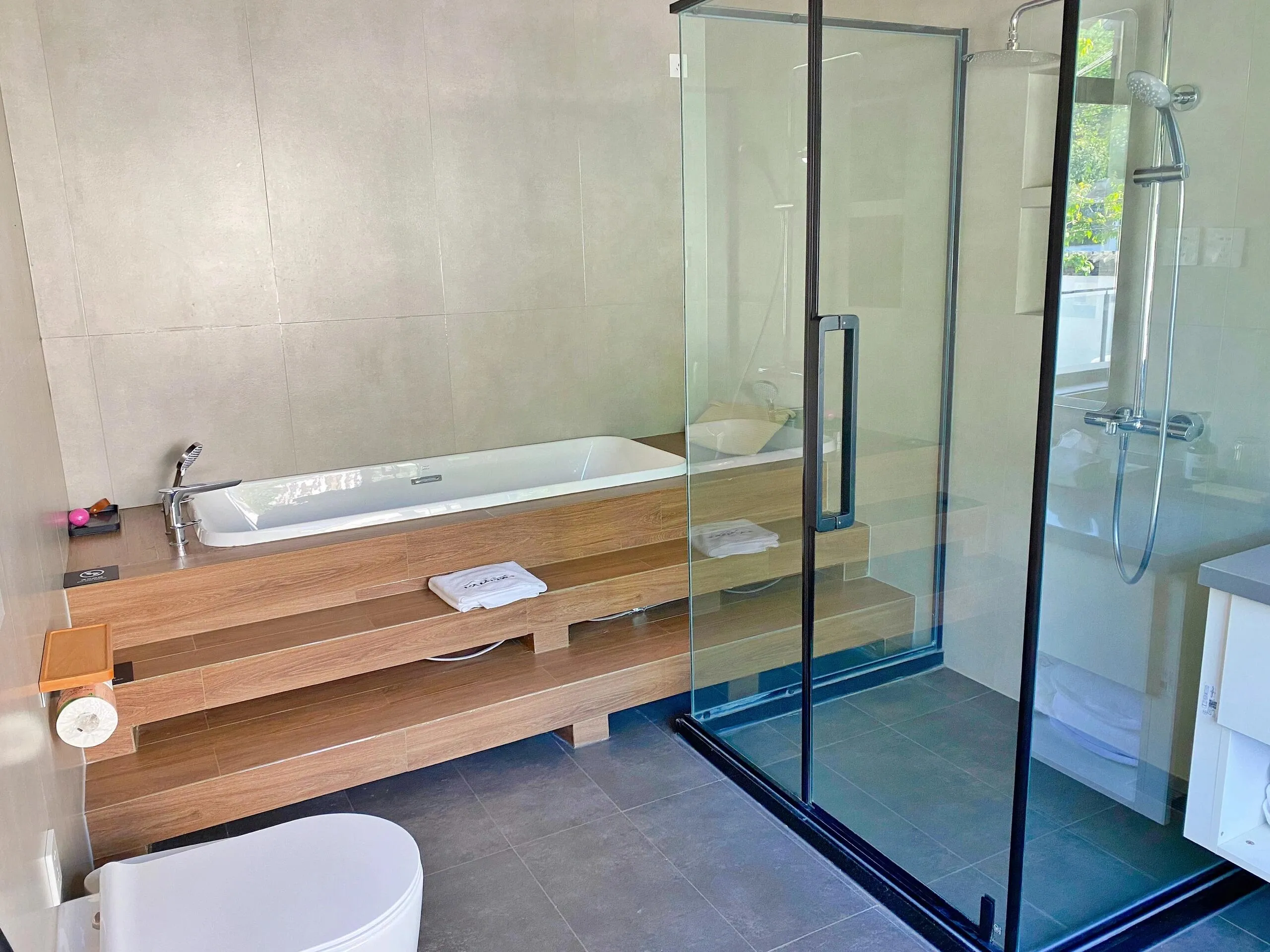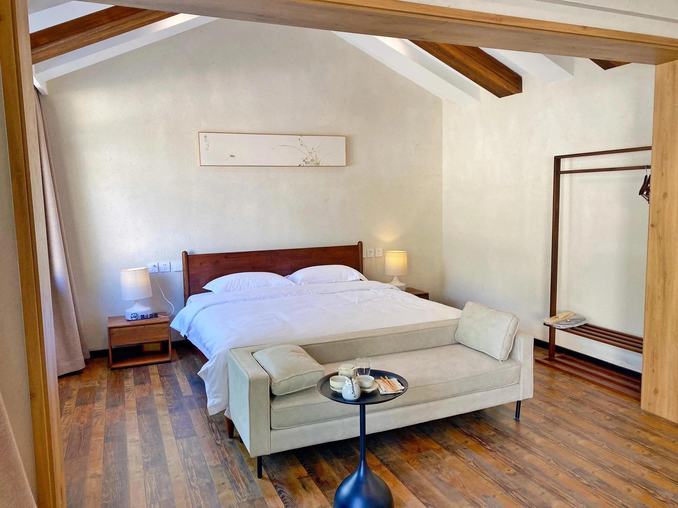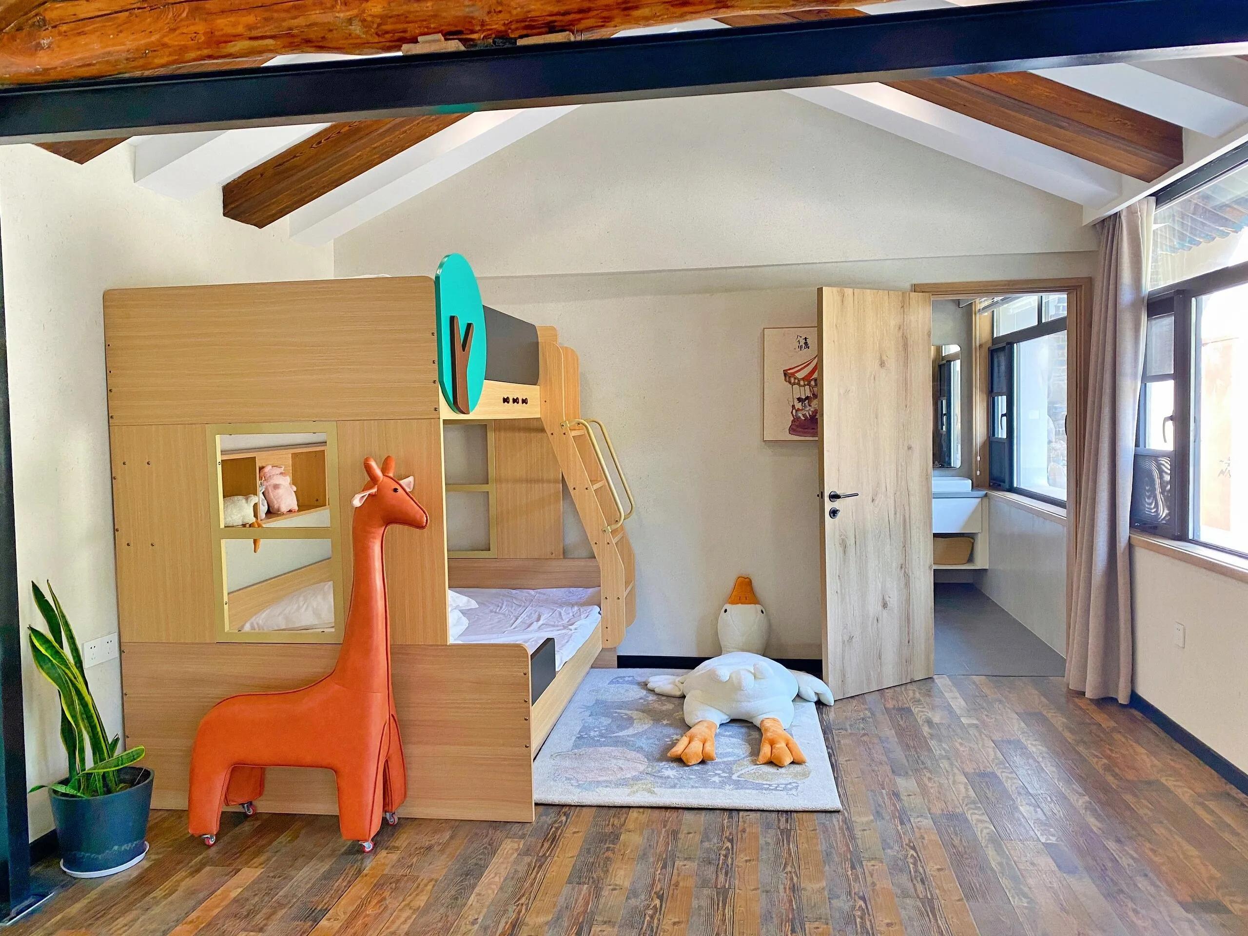 民宿共有6间不同功能的客房,包括景观房、亲子房、双床房、榻榻米房和庭院景观房。每间房都有其独特的风景,采用全实木装修,古朴中透着轻奢。以2号亲子房为例,50平米以上的空间配备了一张1.8米大床和一个1.5米高低床,轻松容纳两大两小。高支床品保证了极佳的舒适度,而配备的浴缸更是让泡澡成为一种享受,伴随着青蛙和昆虫的自然交响乐。