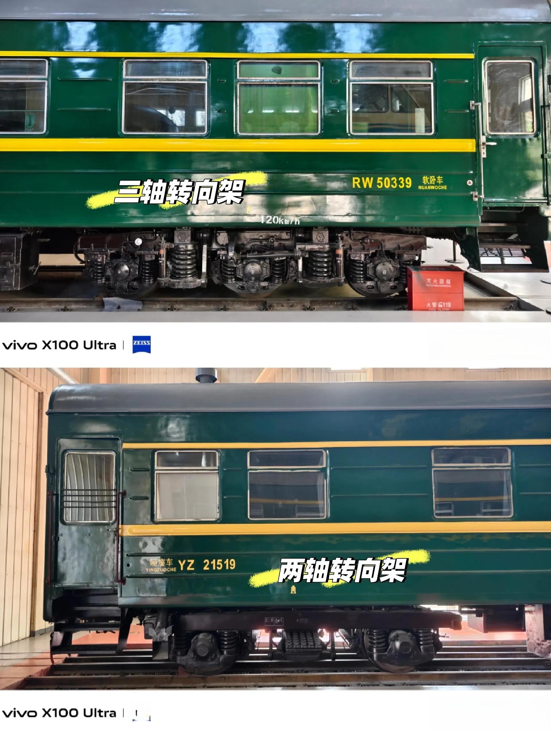 今天我们来聊聊主展厅角落里那些特殊的车厢。你可能会注意到,有些车厢每组轮子(转向架)有三对,而不是普通客车的两对。仔细看侧面的数据, 这些车厢普遍重70-80吨 ,比普通的客车车厢重了几十吨。