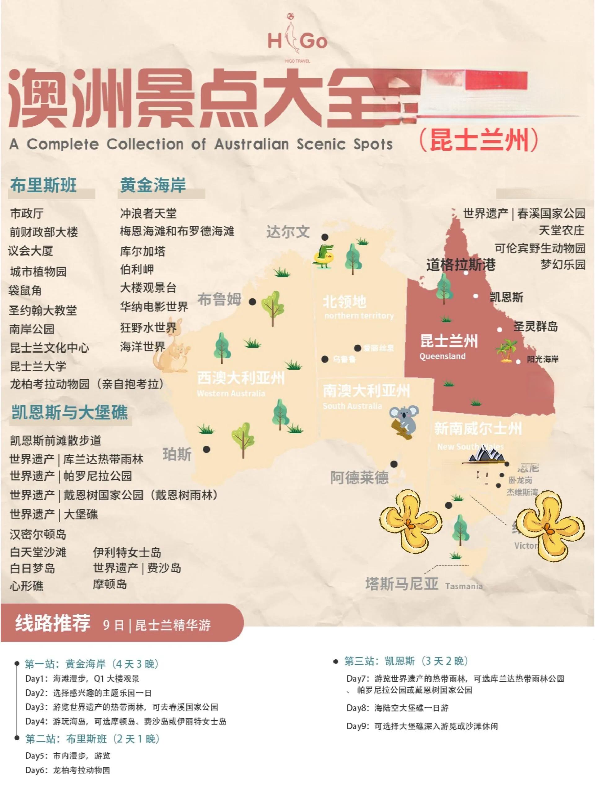 这份行程涵盖了澳大利亚的主要城市和景点,让你在短短9天内领略澳洲的自然风光和城市魅力。记得在旅行前办理好签证,祝你旅途愉快!