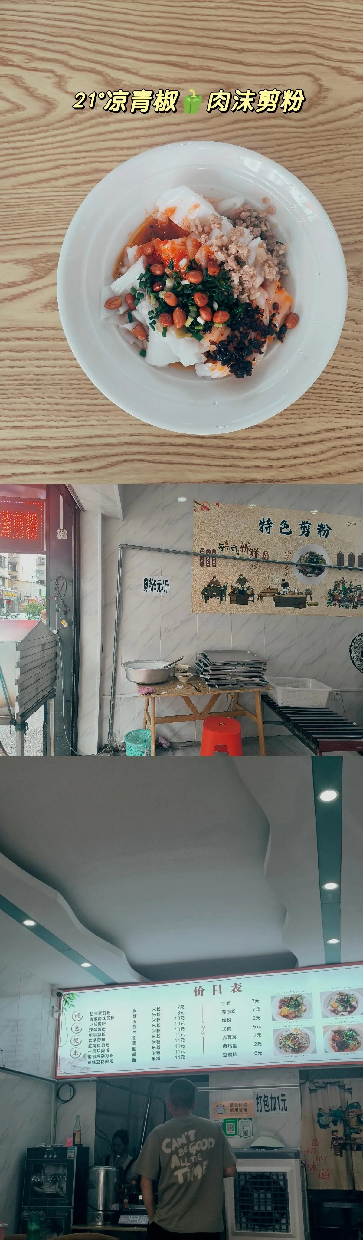 卢记超薄剪粉是当地著名小吃 ,现蒸现煎现拌,口感爽滑又有韧性。青椒肉沫口味深受当地人喜爱。