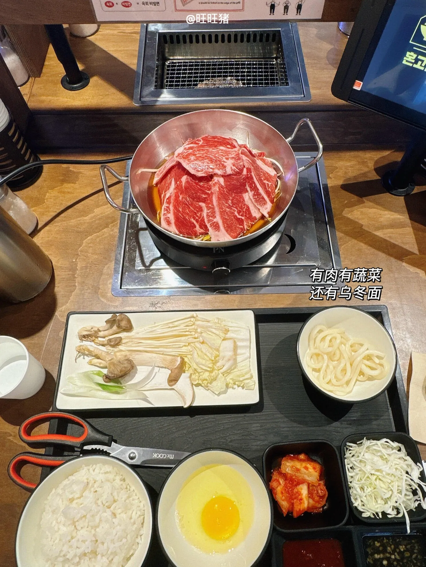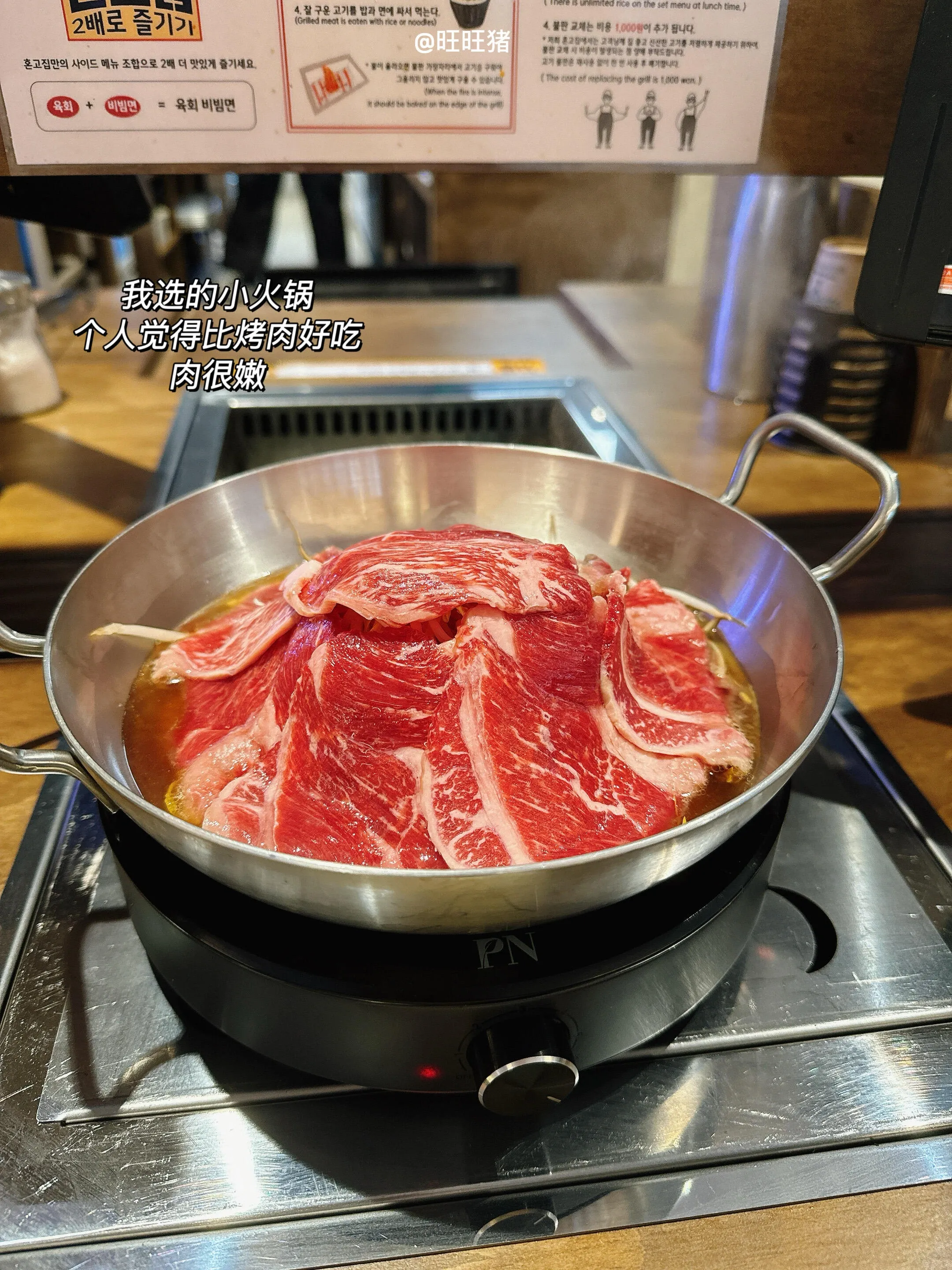 店里的设计很贴心,每个人都有自己的锅和烤盘,既可以吃烤肉也可以吃火锅。我们两个人都觉得火锅比烤肉更好吃一些,肉更嫩,价格也更便宜。