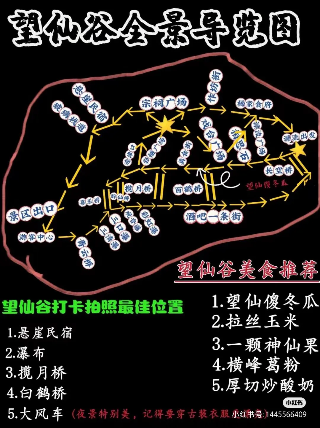推荐的游玩路线从游客中心出发,经过青云桥、寻仙路、三清瀑等多个景点,最终到达朝鹤楼。沿途的拍照打卡点包括揽月桥、百舸桥、福家小院对面的观景台、朝鹤楼、小吃美食街、灵光街和岩铺老茶茶馆等。每个地点都有其独特的拍摄角度和氛围,能捕捉到不同风格的美景。