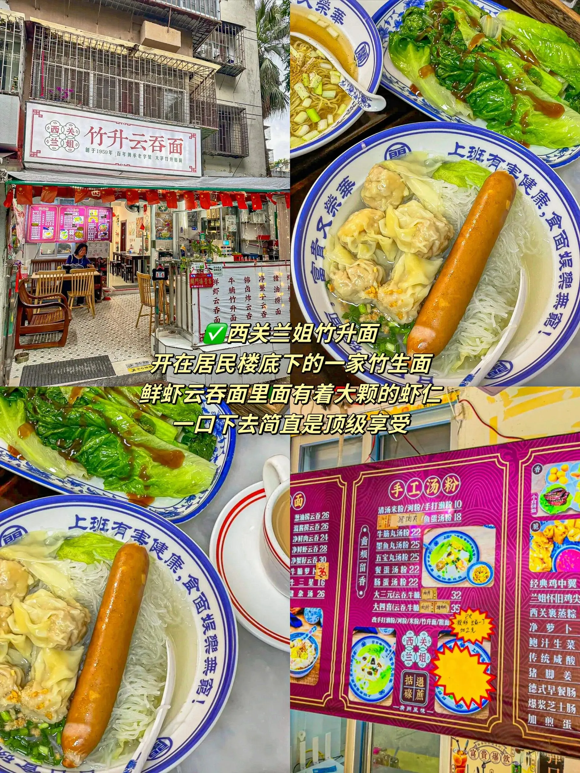 西关兰姐竹升面:位于居民楼底部的面馆,其鲜虾云吞面中的大颗虾仁让人印象深刻。