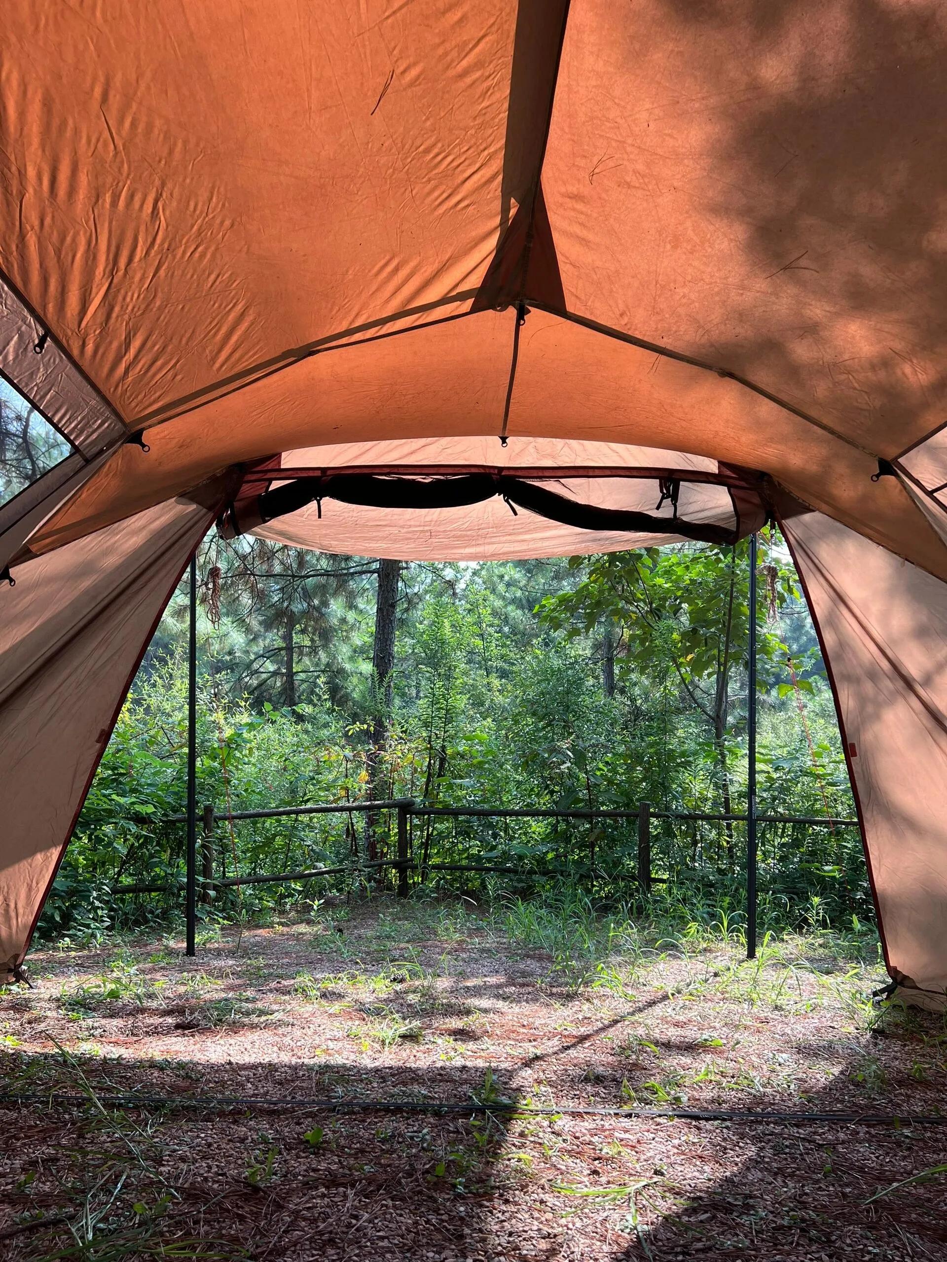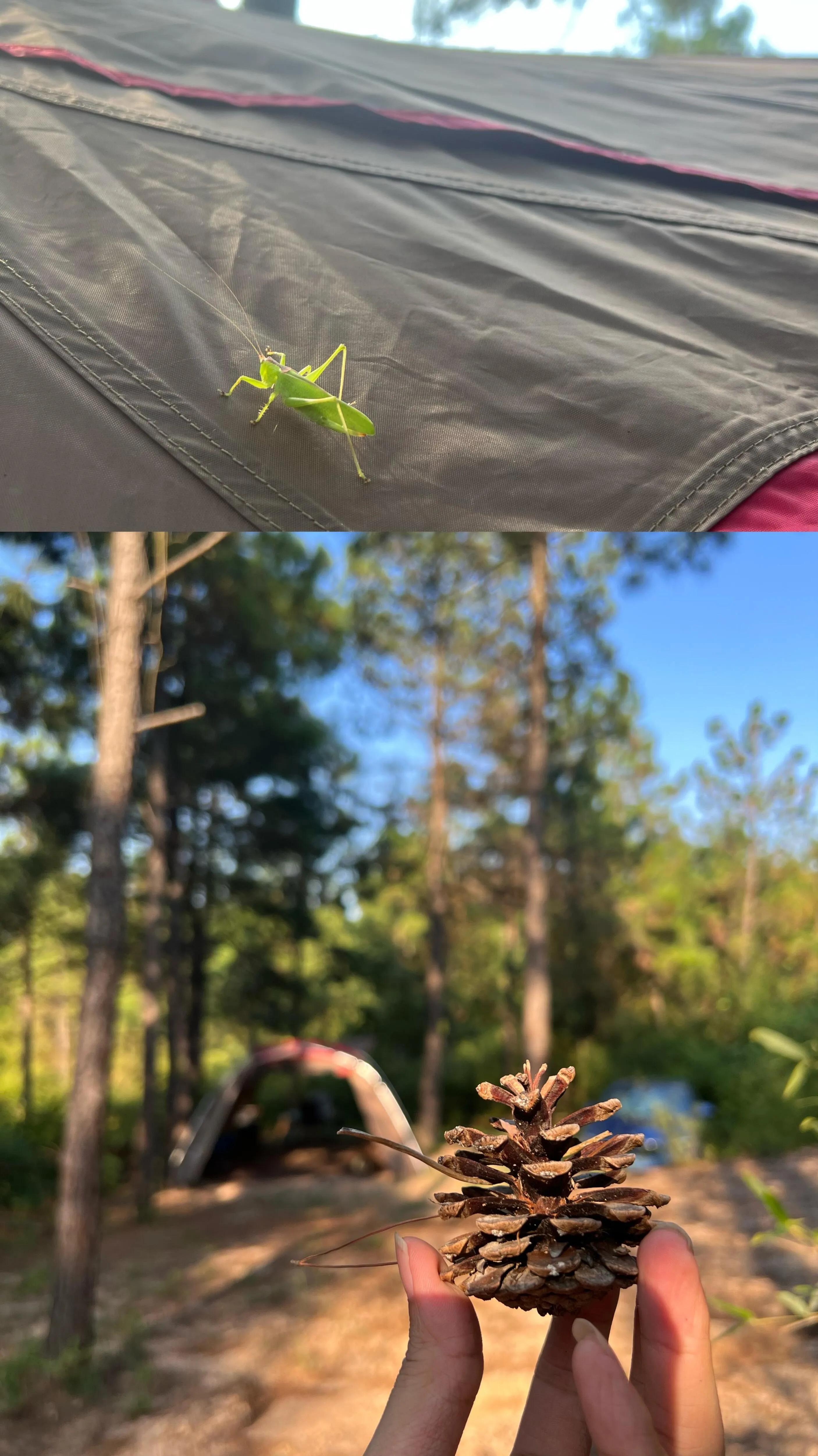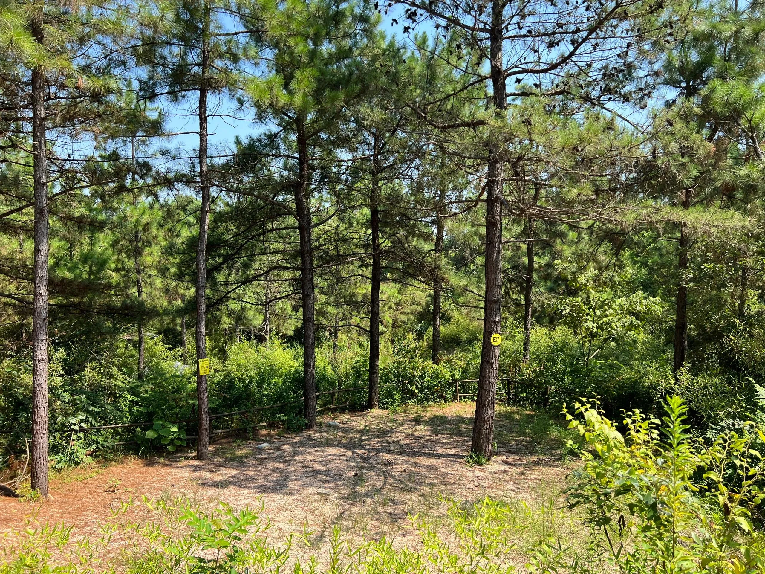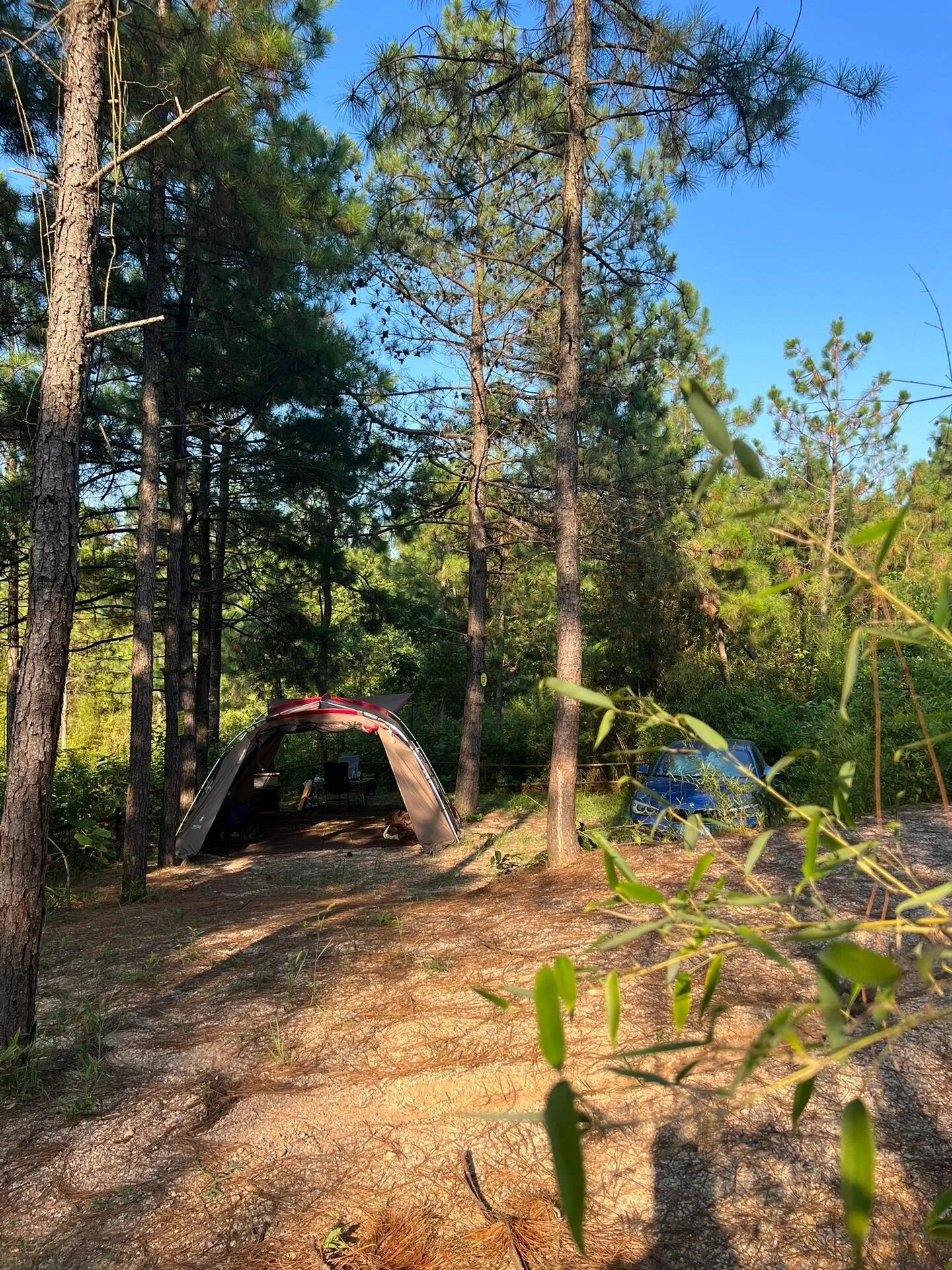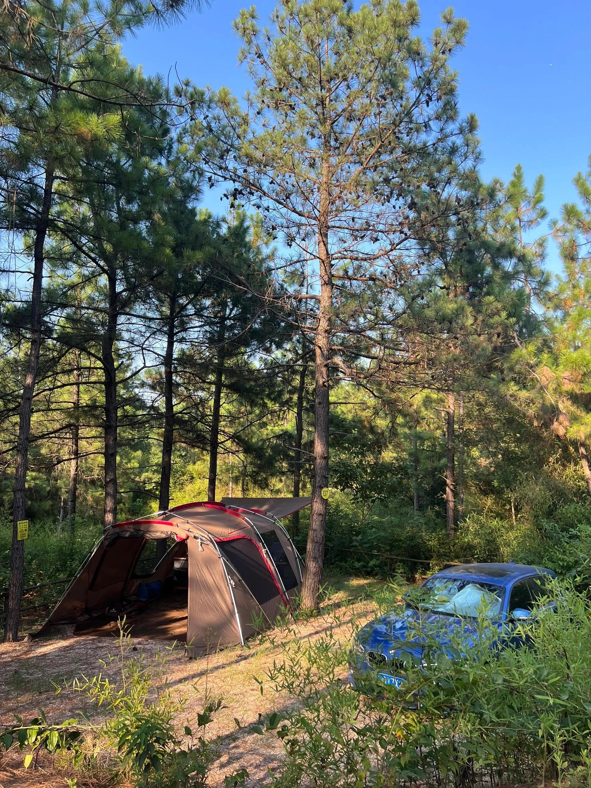 营地空间宽敞,足以容纳一顿大帐篷(如雪峰671)和一辆车。步行2-3分钟即可到达公共卫浴设施。值得一提的是, E区目前没有接电设施,充分保留了大自然的原始气息。 地面上随处可见的松塔更增添了几分野趣。