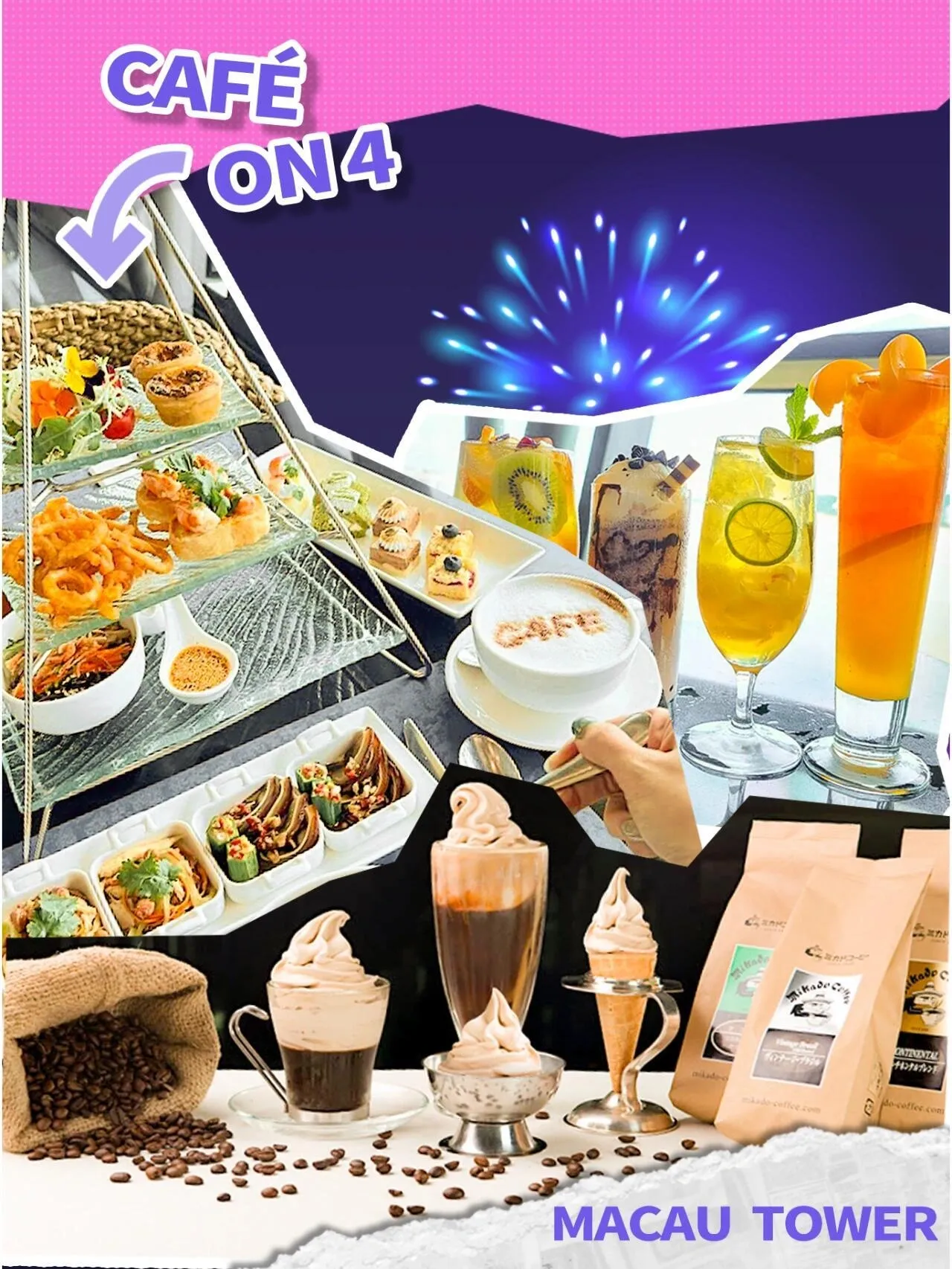 Café on 4则为观众准备了精致下午茶 ,包括多款小蛋糕、咸脆小吃和特色咖啡雪糕特饮。此外,餐厅还推出了烟花节特色自助晚餐,菜品丰富多样,包括香辣吞拿鱼卷和香煎杂锦香肠等。