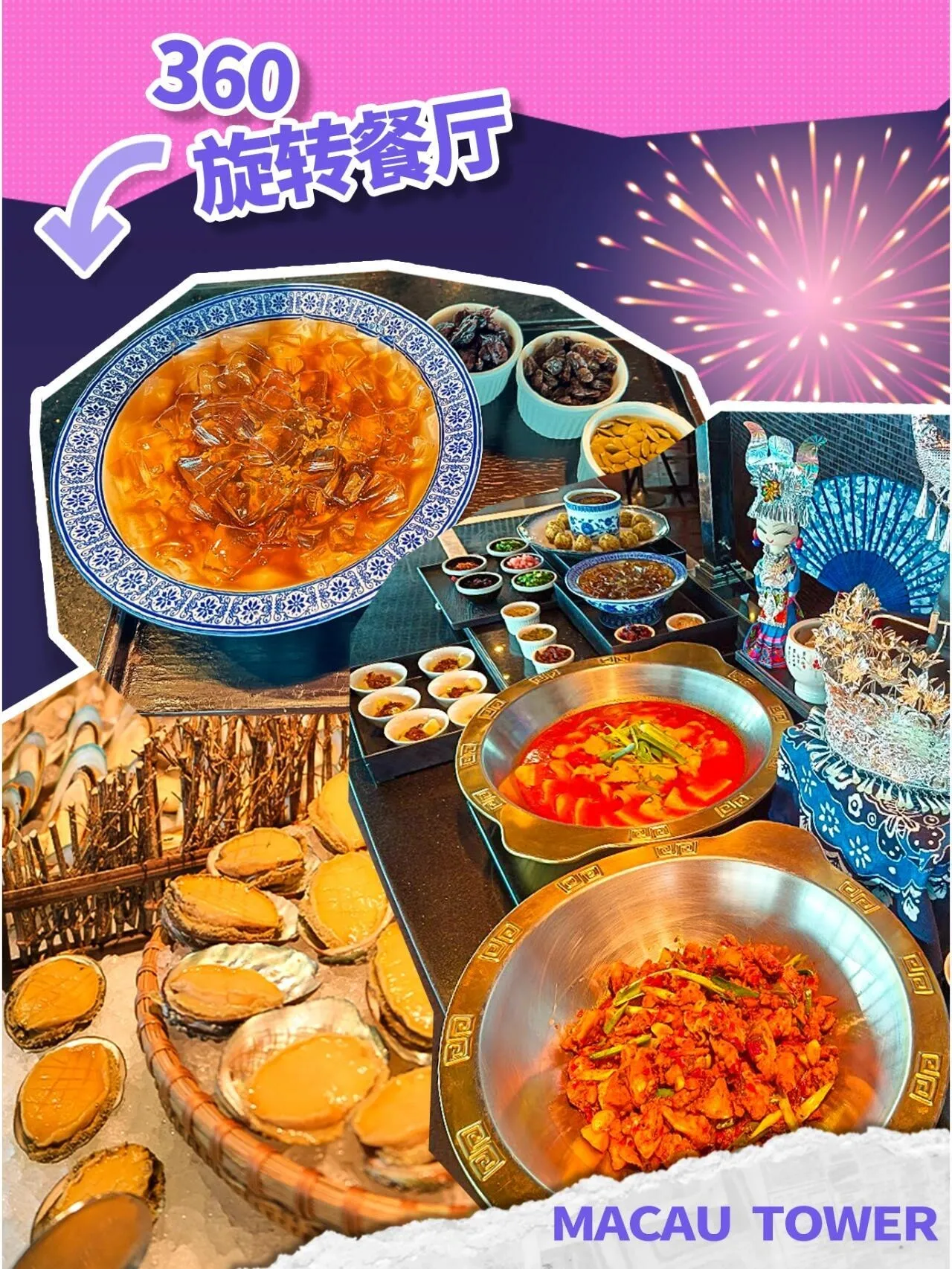 澳门旅游塔无疑是观赏烟花的最佳地点之一。塔内的360旋转餐厅提供了绝佳的观赏体验,透过全景玻璃窗,食客可以一边品尝精致美食,一边欣赏绚丽的烟花表演。餐厅菜单包括半壳青口、香草煎羊架、吉列百花芝士球等美味佳肴,还新增了贵州风味美食,如凯里酸汤鱼、米豆腐和桂花红糖冰粉。