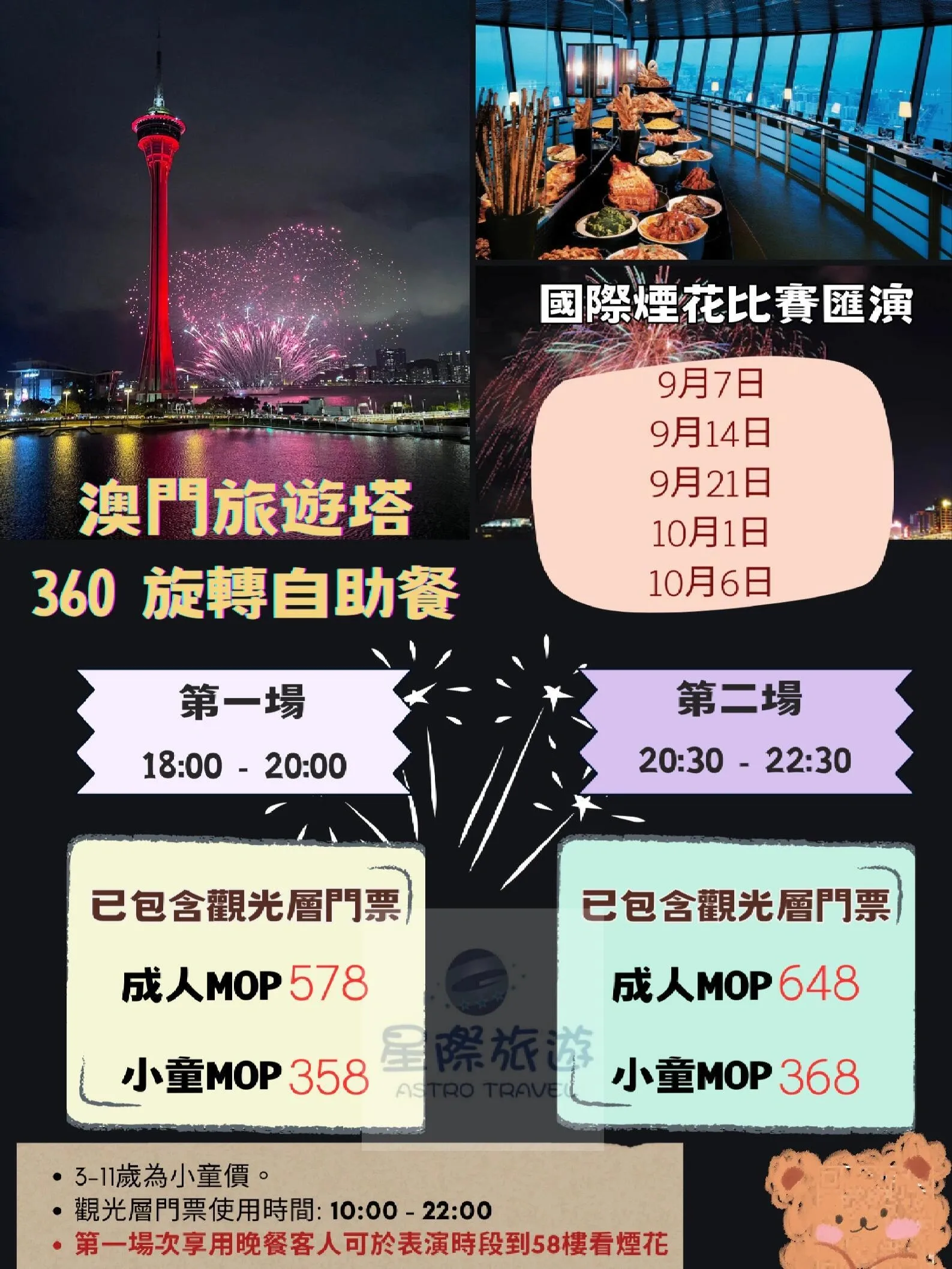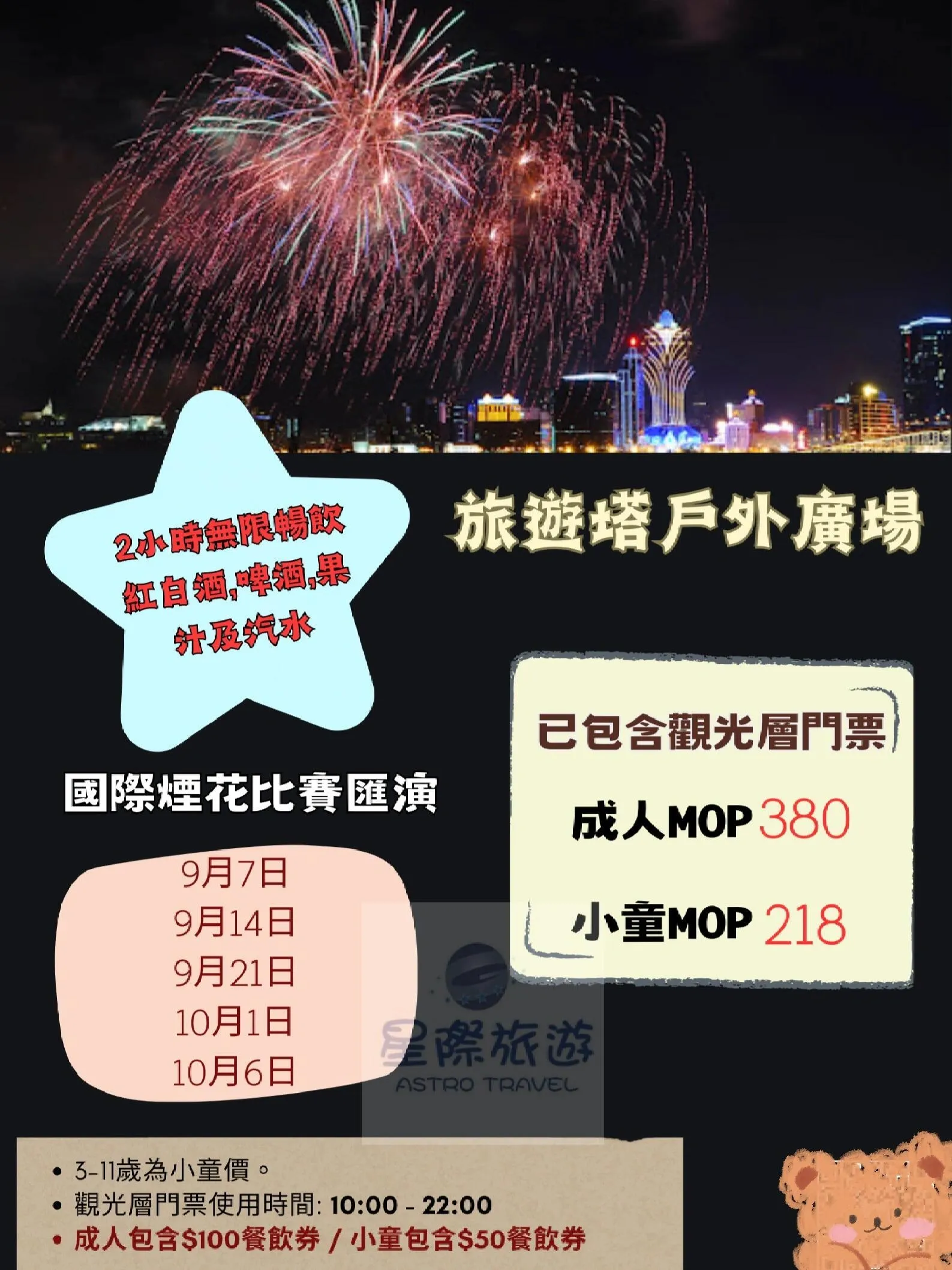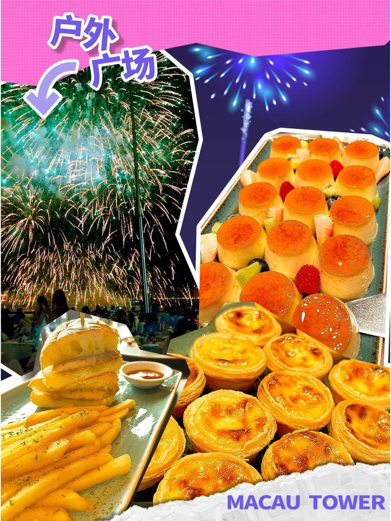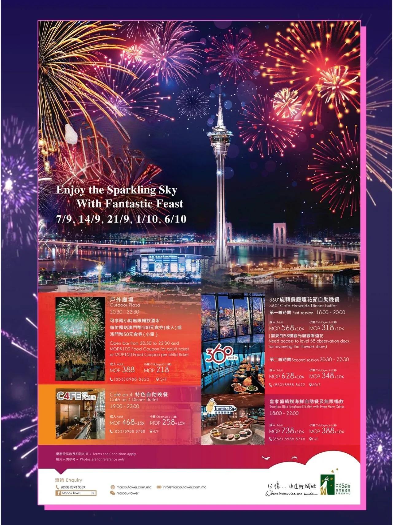 旅游塔户外广场也是观赏烟花的理想选择 。活动当晚,凭入场门票可享两小时无限畅饮,成人还可获得100澳门元的食券,小童则为50澳门元。广场上提供多种小食,如木糠布甸、猪扒包和葡式蛋挞等,让观众在欣赏烟花的同时享受美食。