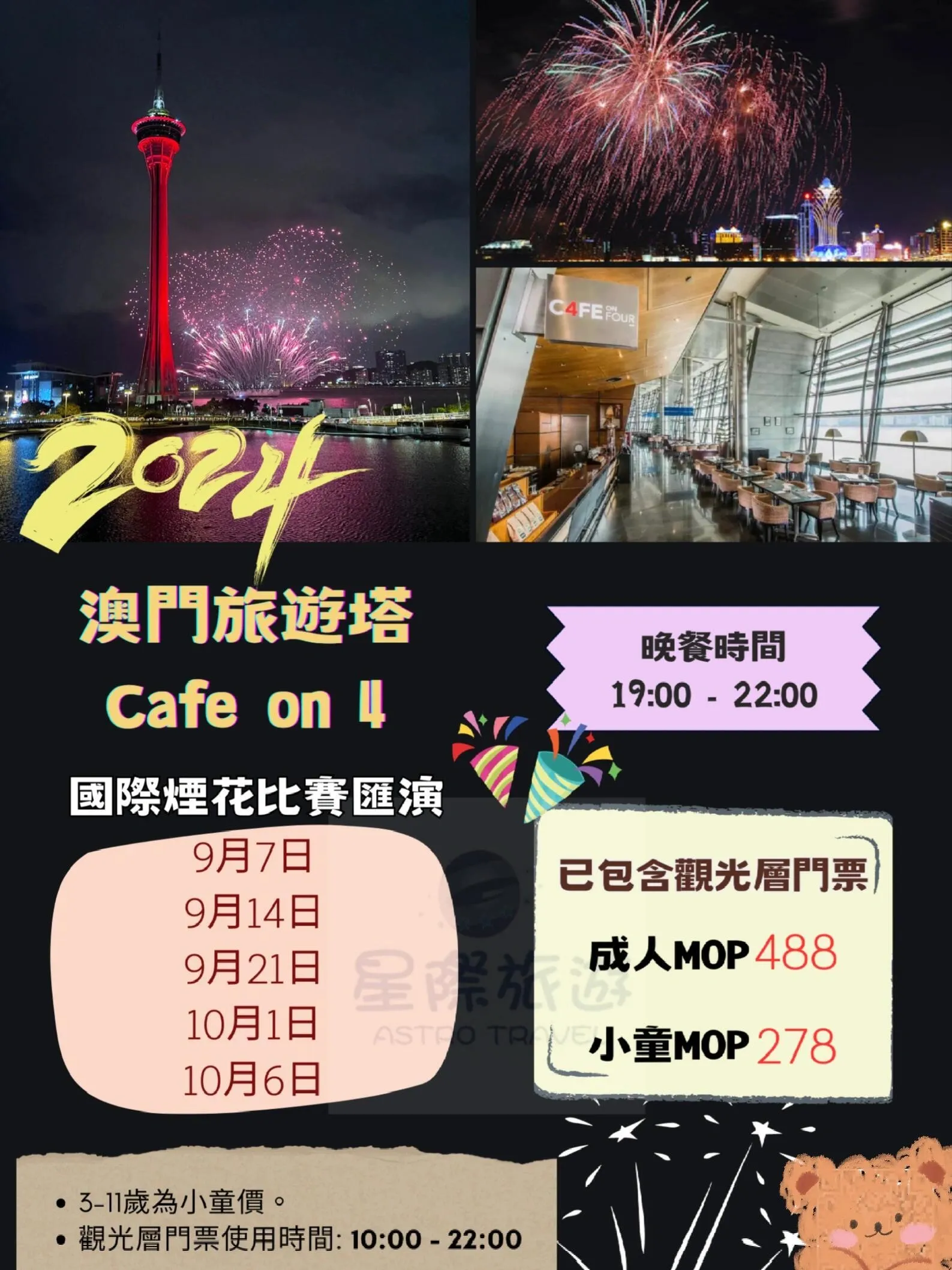 澳门国际烟花比赛汇演即将在2024年9月和10月举行 ,为期五天的盛大活动将在澳门旅游塔对出海面上演。 烟花表演将于每晚21:00和21:40分两场进行 ,参赛队伍来自世界各地,包括俄罗斯、法国、加拿大、泰国、西班牙、菲律宾、中国、意大利、日本和葡萄牙。