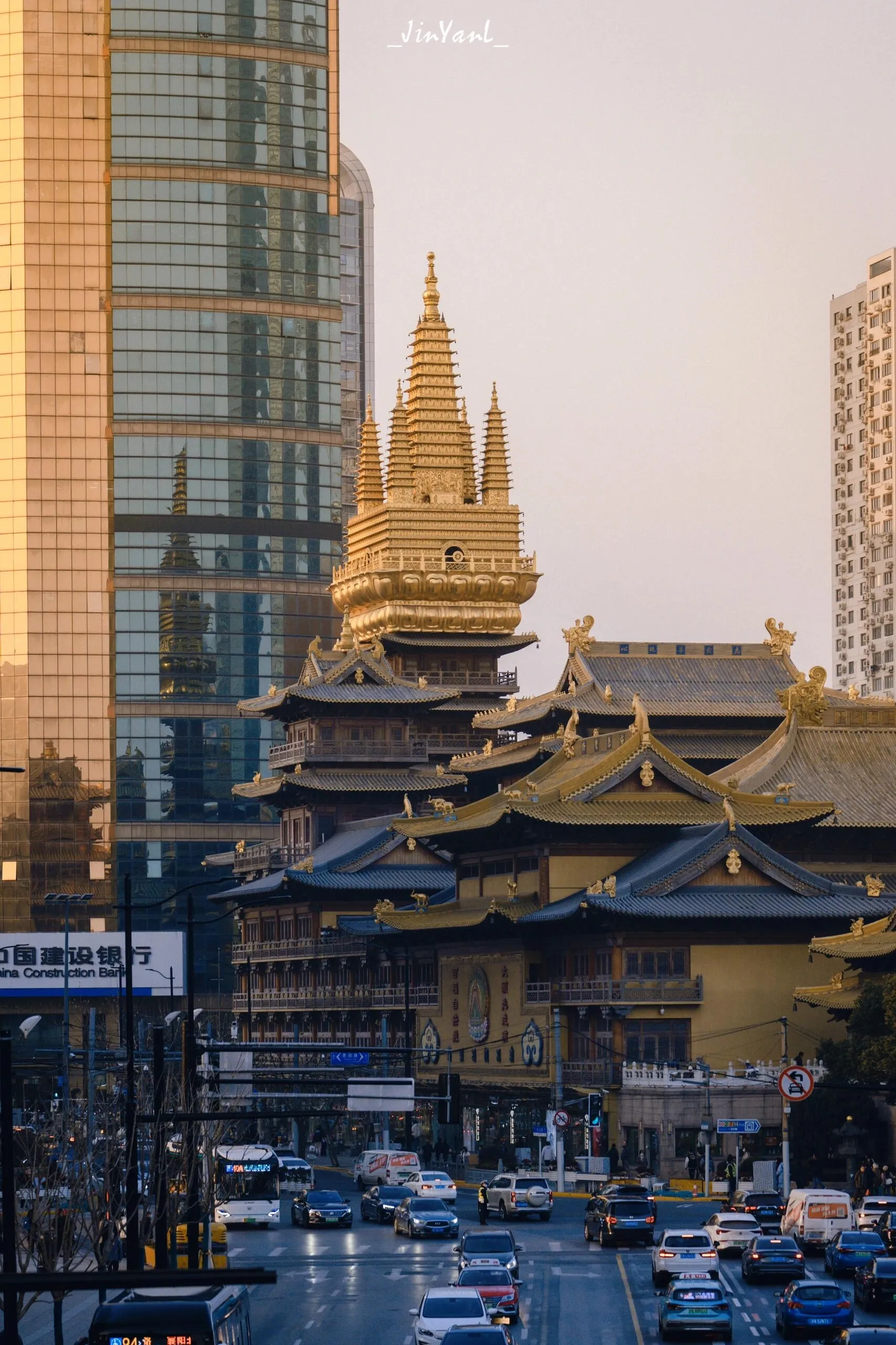 站在延安西路的天桥上拍摄,这座在闹市中伫立了一千多年的寺庙堪称全国最贵。等到车灯亮起后,拍摄穿梭在寺庙前的车流,效果会很棒。