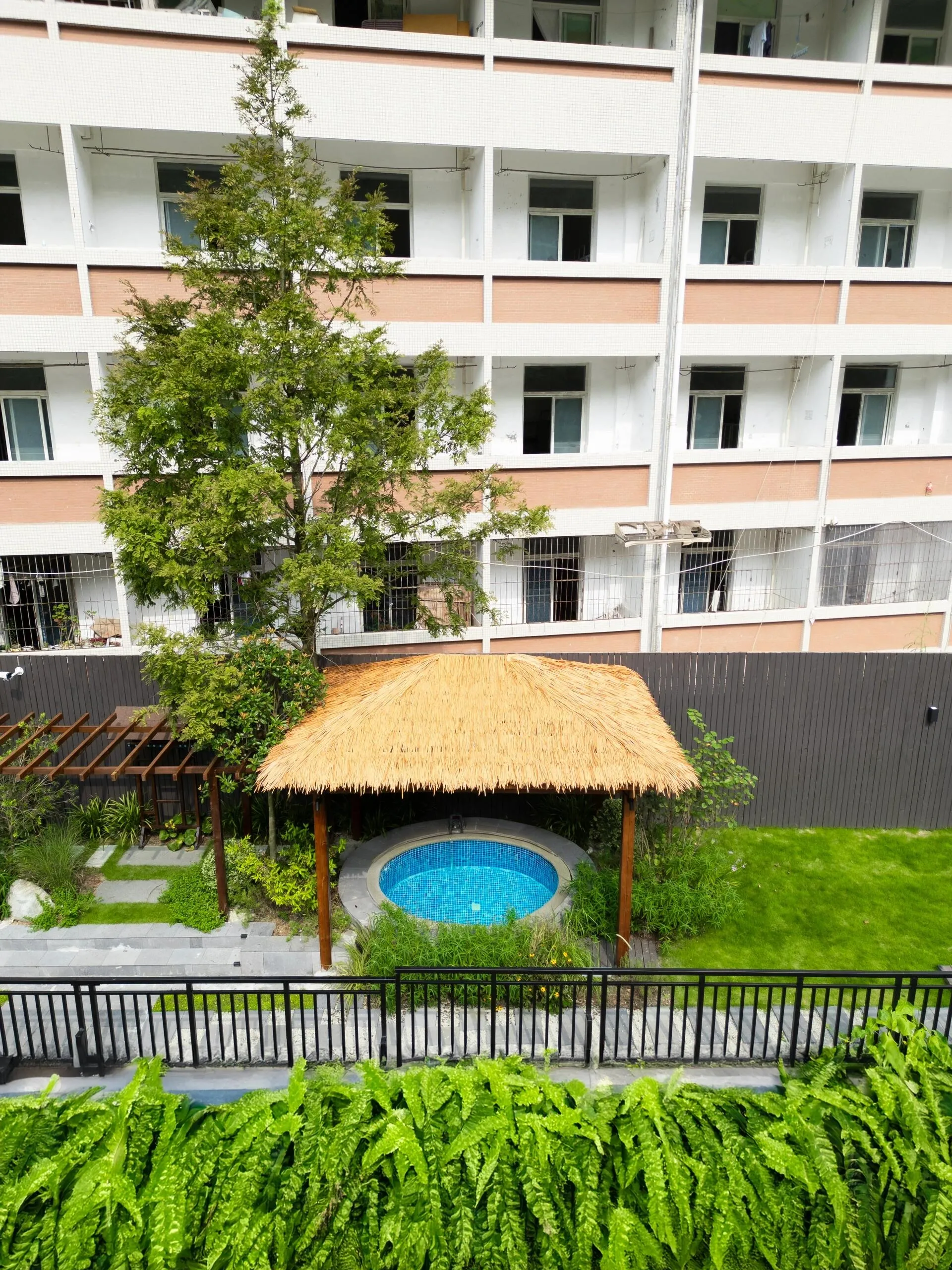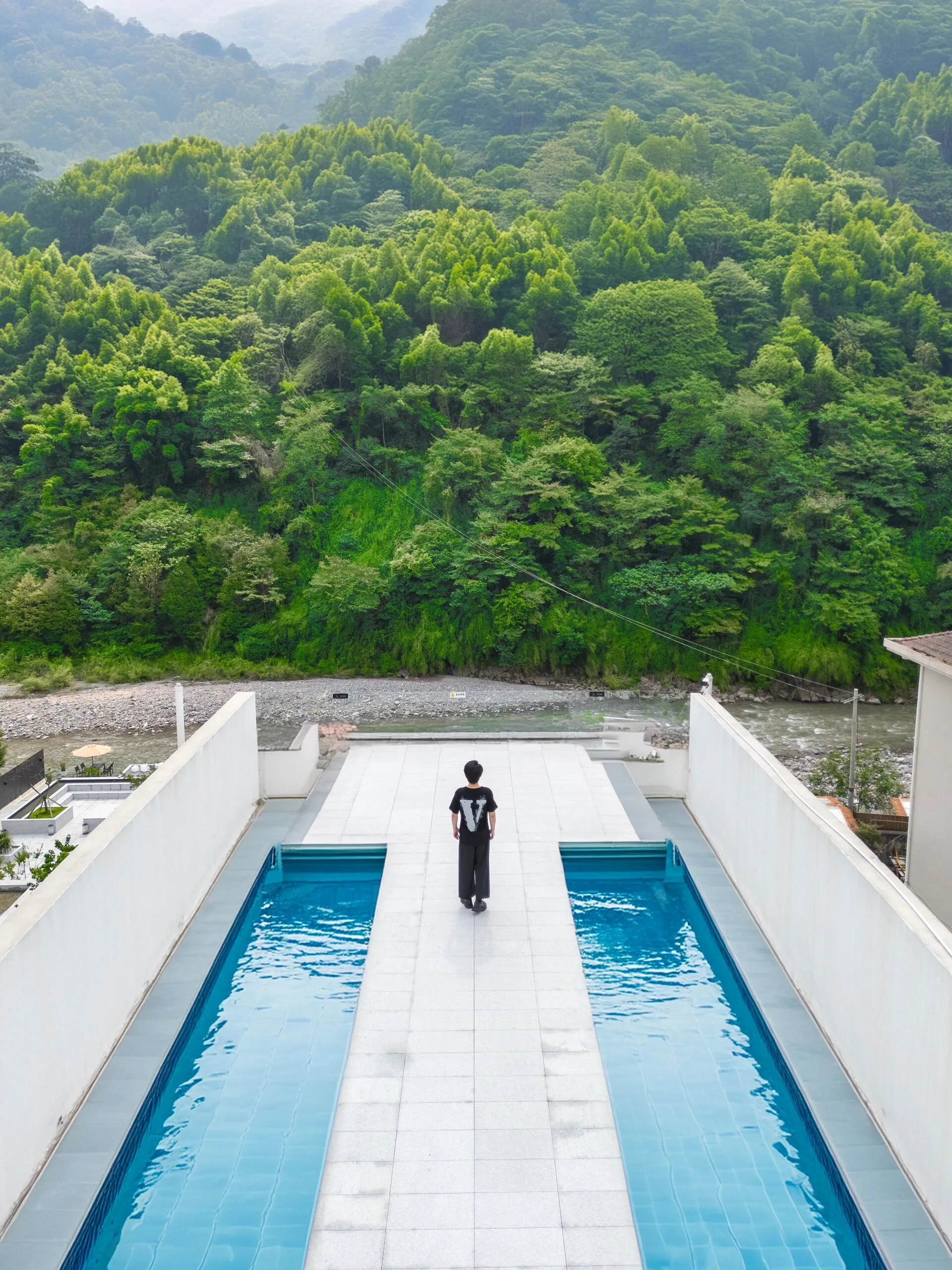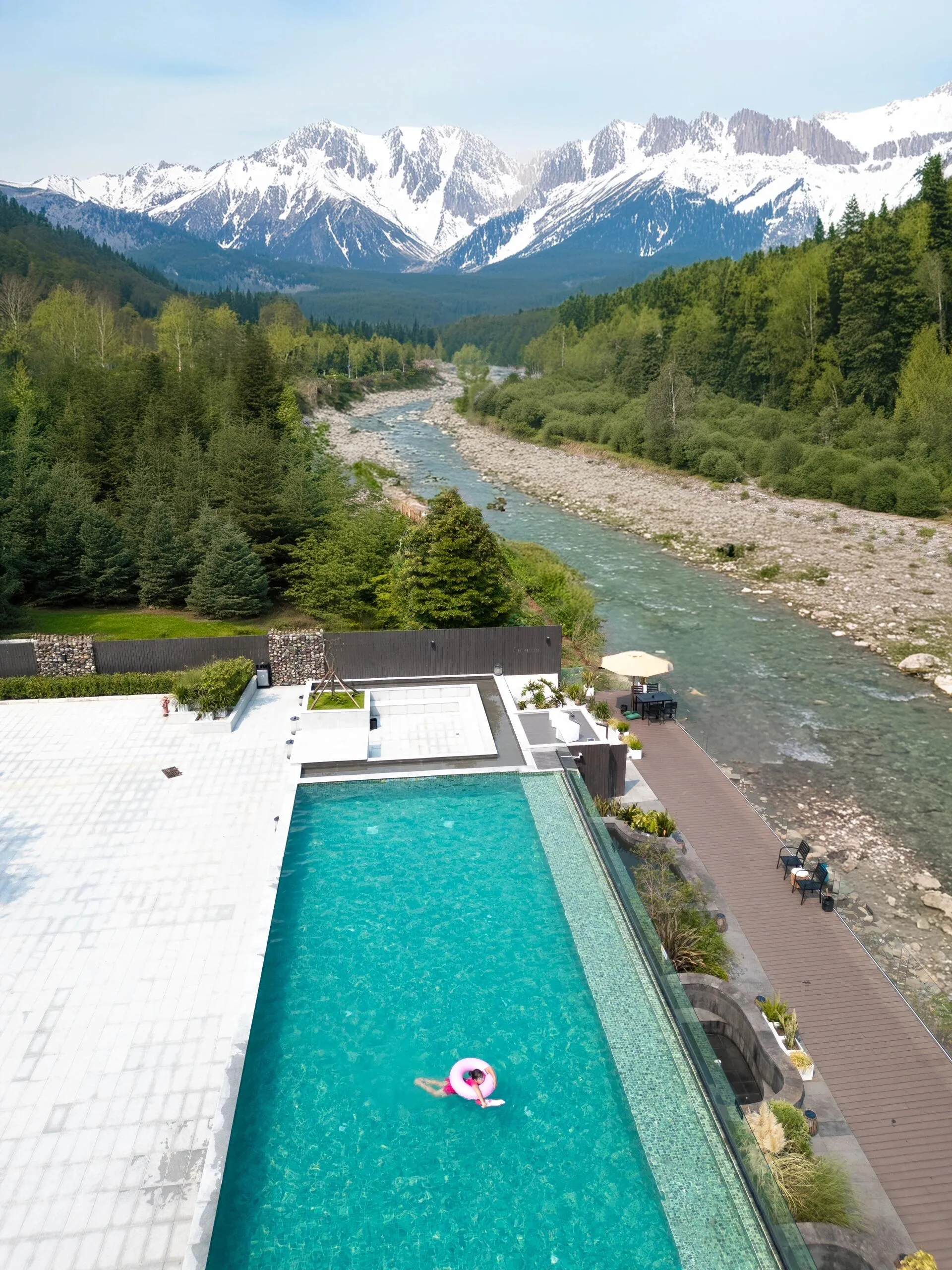 庄园内最引人注目的是一个临溪泳池, 泳池下方是清澈的天然小溪,周围绿植环绕。 游客不仅可以在此畅游,还能体验摸鱼抓虾抓螃蟹的乐趣。有时,泳池旁还会放置泡泡,增添几分童趣。