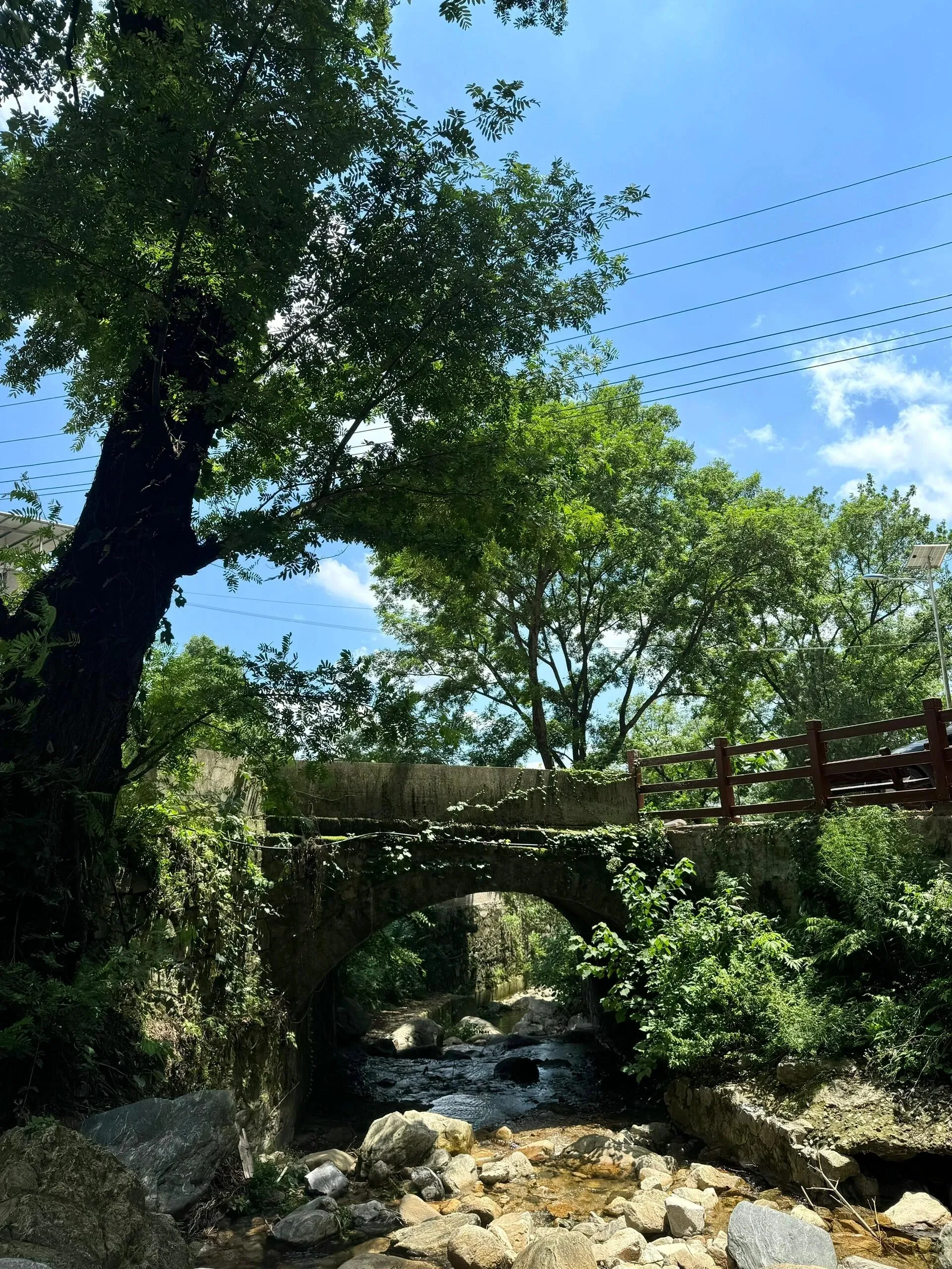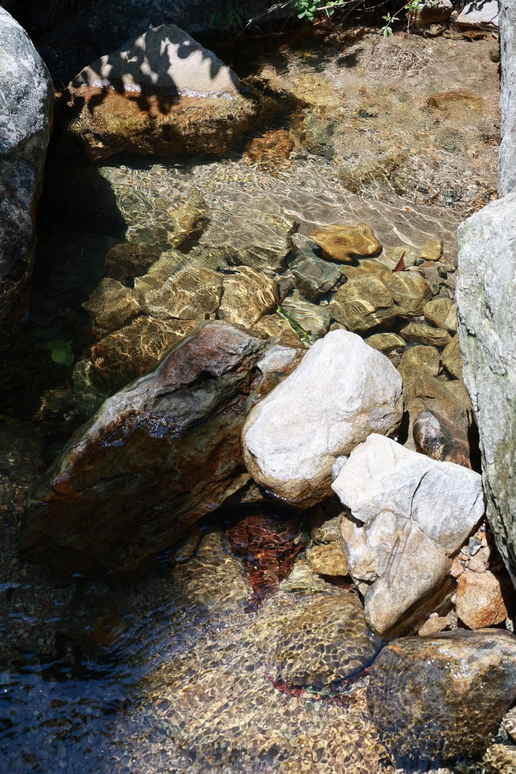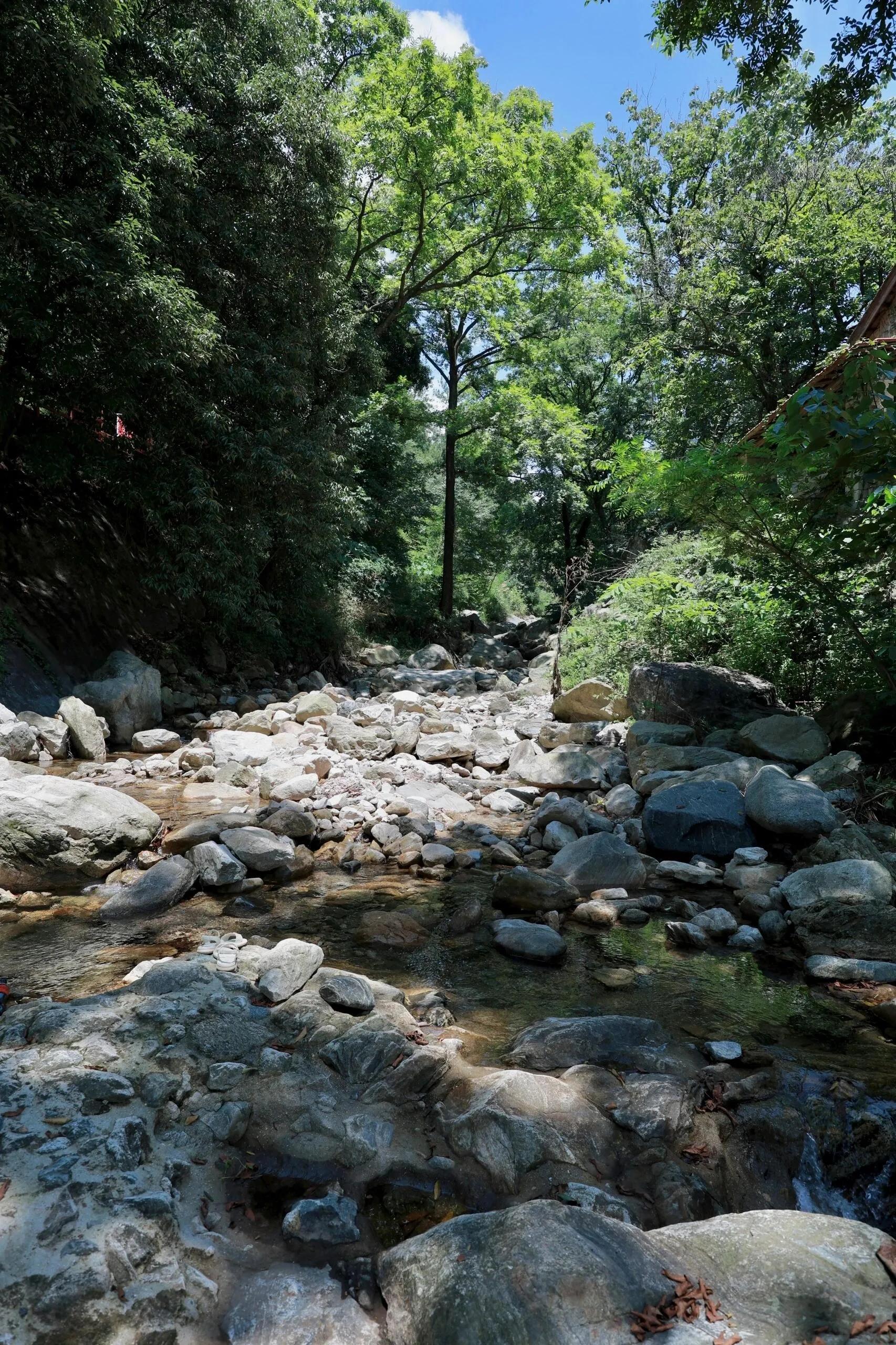 这个溯溪点相对冷门,人少清净。溪水虽然不深,但非常清澈,能看到小蝌蚪和小鱼在水中游动。流动的溪水既干净又冰凉,在炎炎夏日里格外舒爽。周围的树木高大茂密,遮阳效果极佳,完全不用担心被晒到。最贴心的是,附近还有厕所,所以即使待上一整天也不会有后顾之忧。