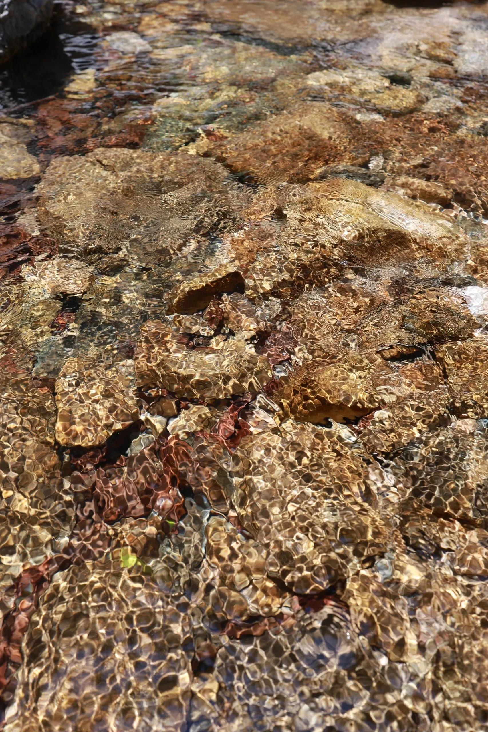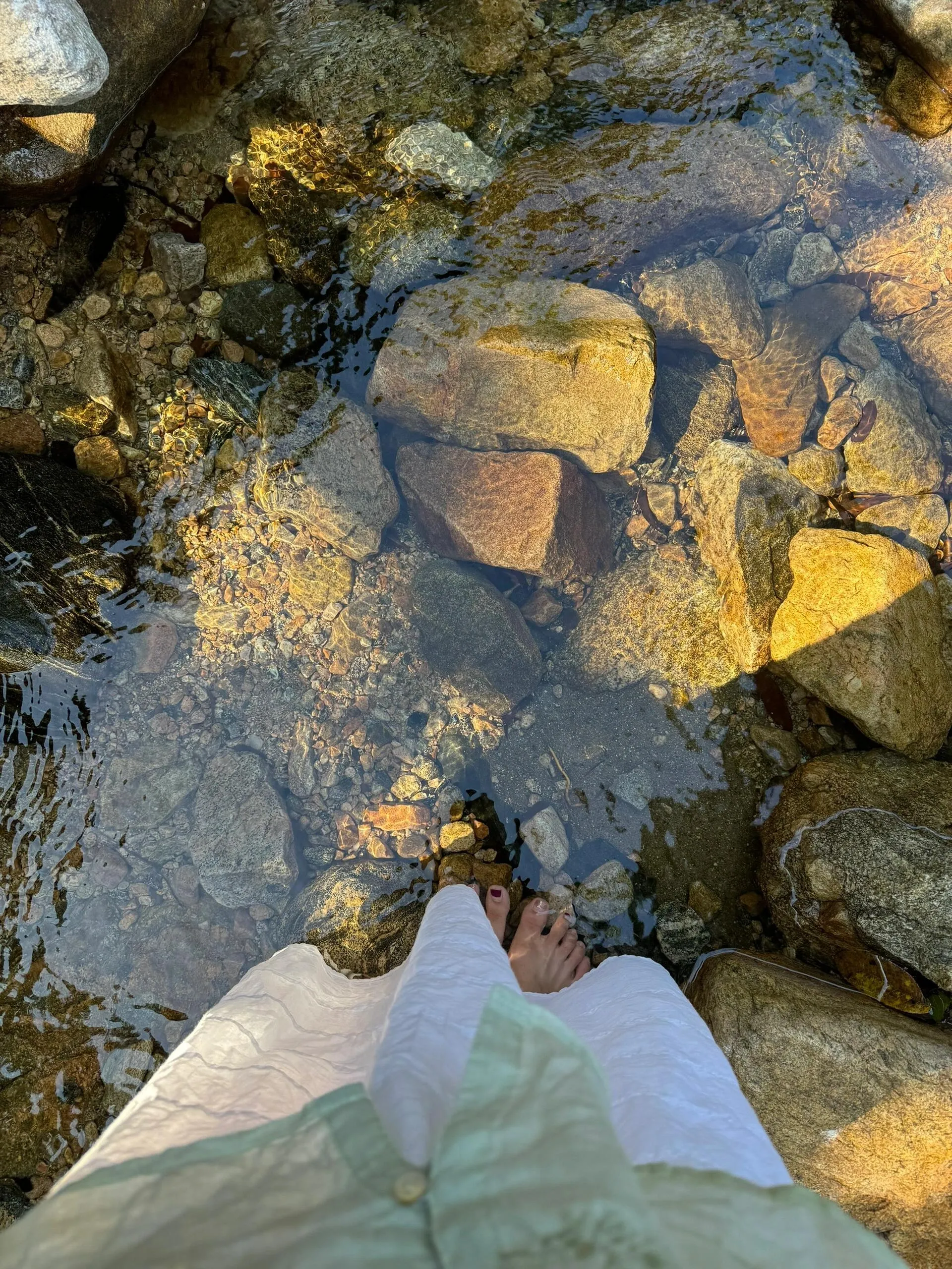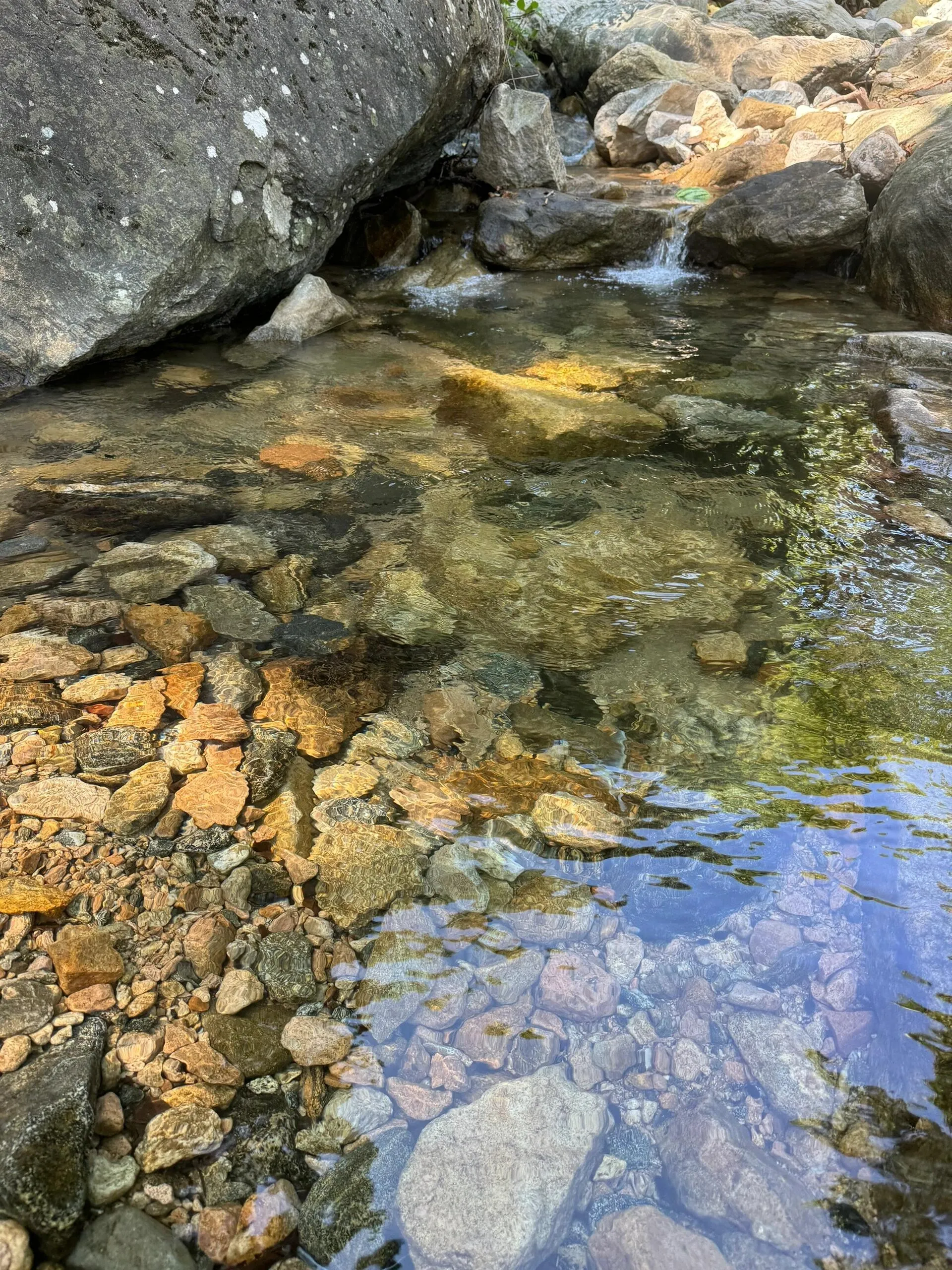 这个溯溪点相对冷门,人少清净。溪水虽然不深,但非常清澈,能看到小蝌蚪和小鱼在水中游动。流动的溪水既干净又冰凉,在炎炎夏日里格外舒爽。周围的树木高大茂密,遮阳效果极佳,完全不用担心被晒到。最贴心的是,附近还有厕所,所以即使待上一整天也不会有后顾之忧。