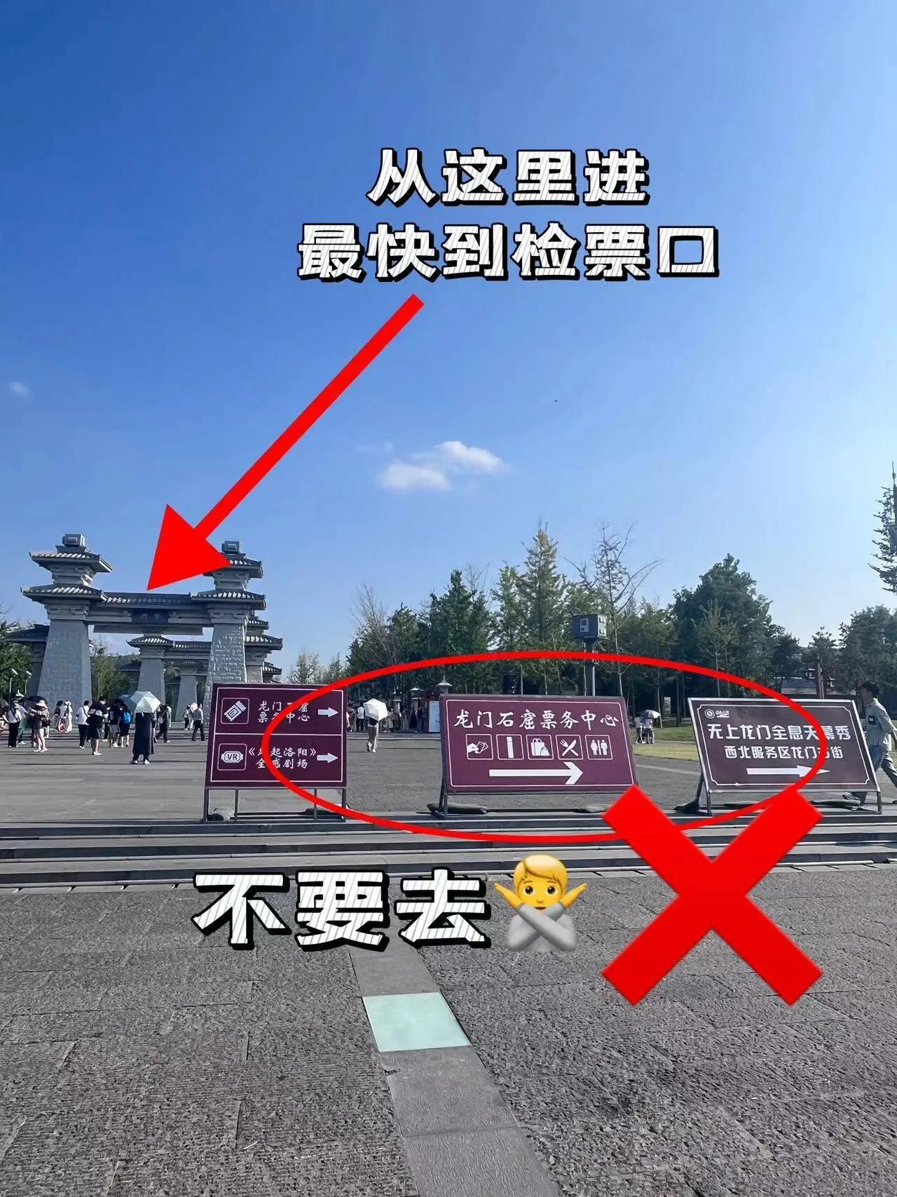 景区指示牌会引导你到龙门古街,但如果不需要存包,可以直接从西北服务区的门头下面直走到大石门检票口,或者选择票务中心边上的电瓶车道直行。这样可以节省时间,避免绕路。