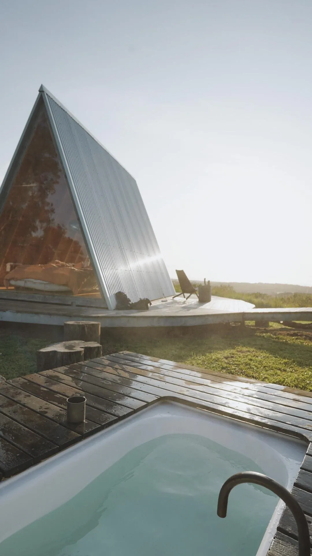 傍晚时分,夕阳正好穿过小木屋,在里面拍剪影的效果绝了。第一天到达的比较晚,原本计划的泡着热水看日落只能推迟到第二天早上看日出。早晨天气微凉,泡在热水中欣赏日出,又是另一番体验。