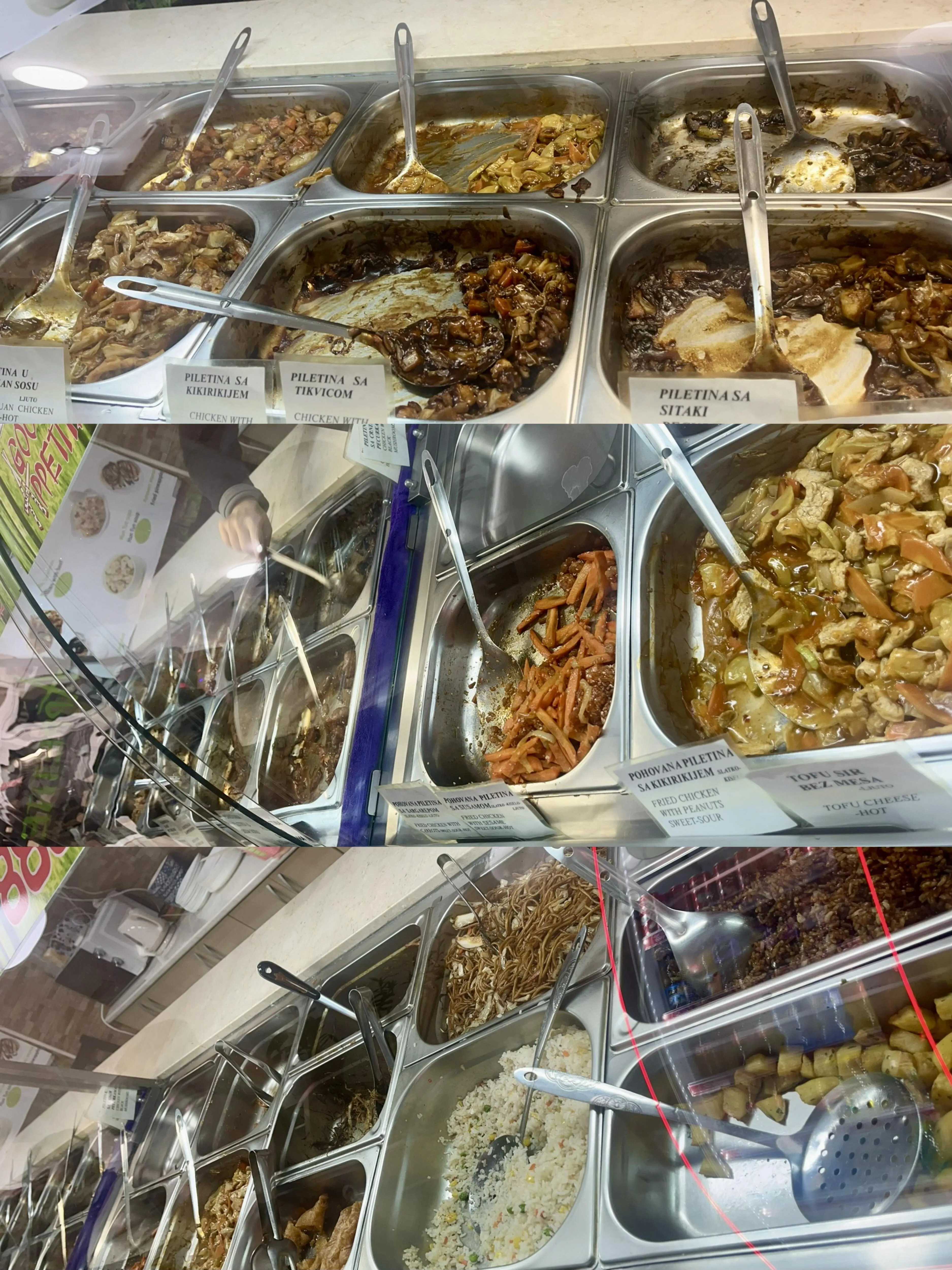 美食方面,贝尔格莱德的中餐选择很多。除了第一晚品尝当地美食外,其他时间主要选择中餐。经济实惠的选择是中餐自助,可以自选一份主食和2-3个菜,味道不错,价格约合人民币37元。