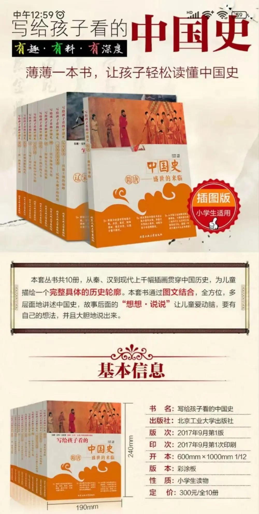 记者搜索发现,该系列历史读物名为《写给孩子看的中国史》,官方简介为“本套丛书共10册,从秦汉到现代上千幅插画贯穿中国历史,为儿童描绘一个完整具体的历史轮廓。”