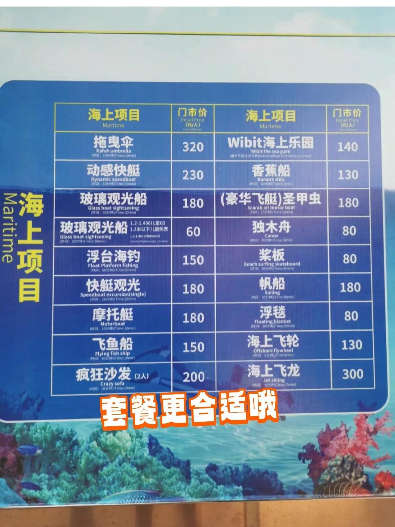 如果不想湿身,可以选择:摩托艇、海上飞艇、海上跑车、彩虹拖伞、海棠游、平台海钓、半潜观光船、帆船和水上飞龙。这些项目即使在特殊时期也可以玩。