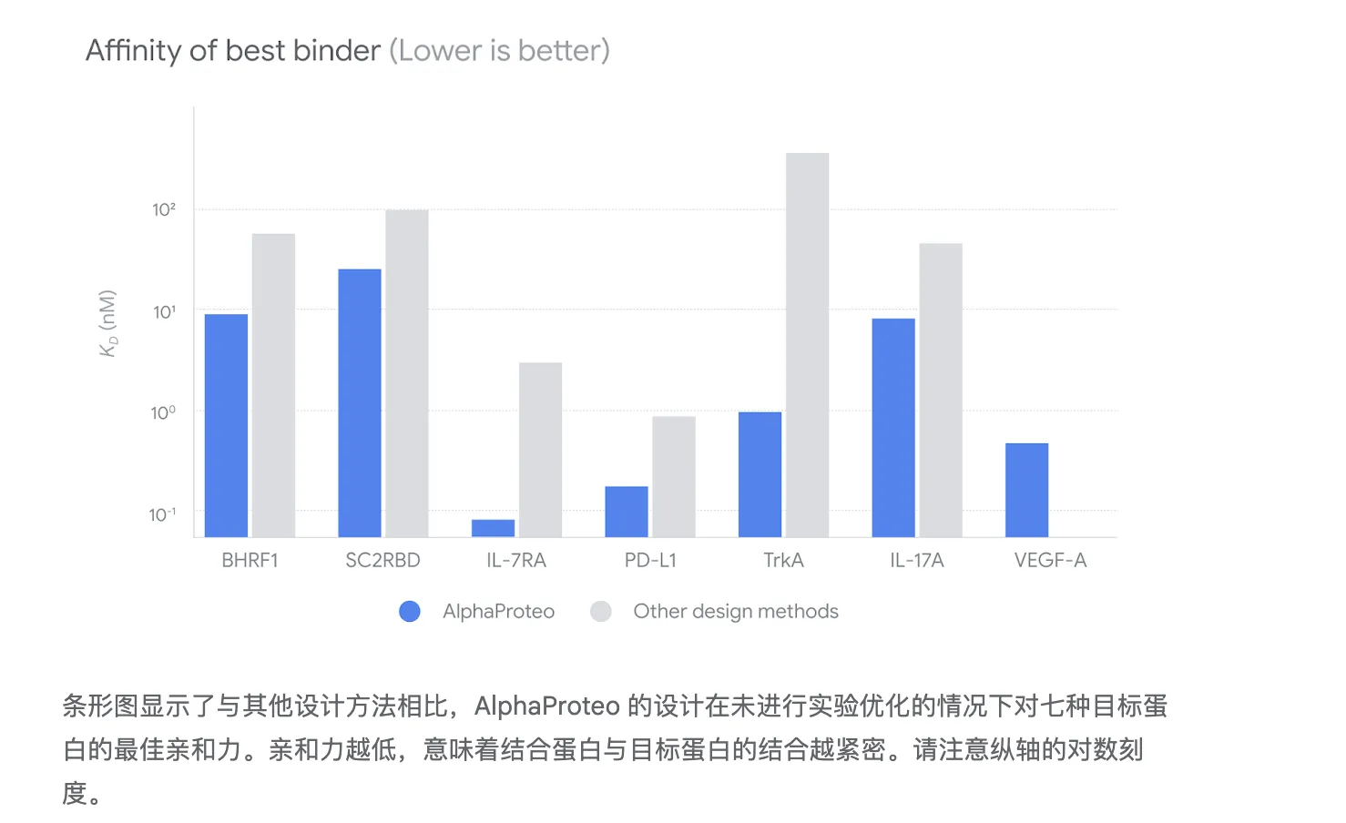 在测试的 7 种靶蛋白上,AlphaProteo 比现有最佳方法的蛋白结合亲和力高出 3 到 300倍。