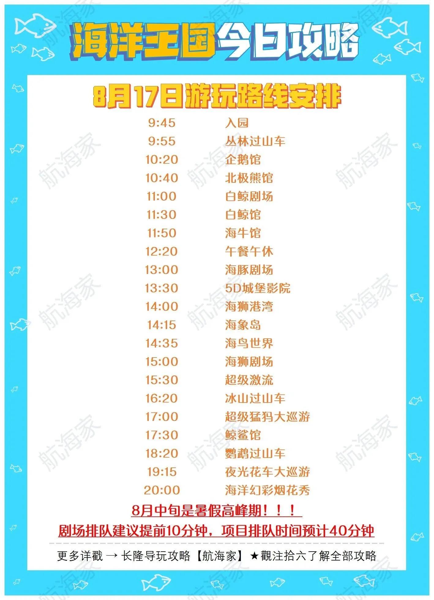 9:45入园后,先体验刺激的丛林过山车,然后依次参观企鹅馆、北极熊馆。11点观看白鲸剧场表演,之后游览白鲸馆和海牛馆。午餐后,13:00观看海豚剧场表演,接着体验5D城堡影院。下午继续游览海狮港湾、海象岛和海鸟世界,15:00观看海狮剧场表演。之后可以体验刺激的超级激流和冰山过山车。17:00欣赏猛犸大巡游,然后参观鲸鲨馆。晚上不要错过19:15的花车大巡游和20:00的幻彩烟花秀,完美结束一天的游玩。