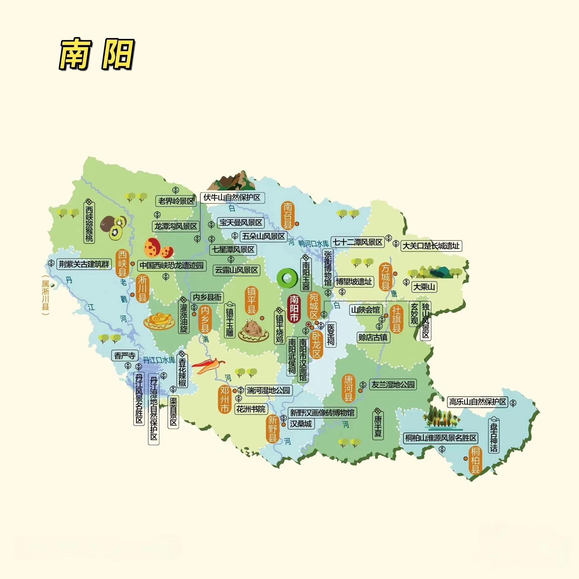 南阳景点分布广泛,除了市区的武侯祠、医圣祠、南阳博物馆等,还有西峡的老界岭、恐龙遗迹园,淅川的丹江大观苑、香严寺,方城的七峰山、七十二谭,南召的宝天曼、五朵山,邓州的花州书院,镇平的国际玉城,社旗的赊店古镇,新野的白河公园,以及桐柏的水帘洞等。每个地方都有其独特的魅力,值得细细品味。