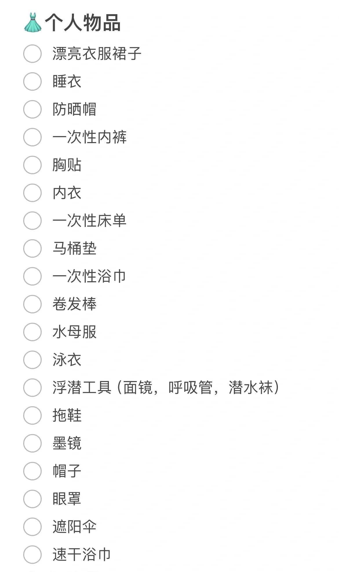 衣物方面,除了日常穿着,别忘了带上漂亮的裙子和睡衣。防晒帽、墨镜和遮阳伞都是防晒必备品。泳装、水母服和浮潜装备(面镜、呼吸管、潜水袜)也要带上,为海上活动做好准备。