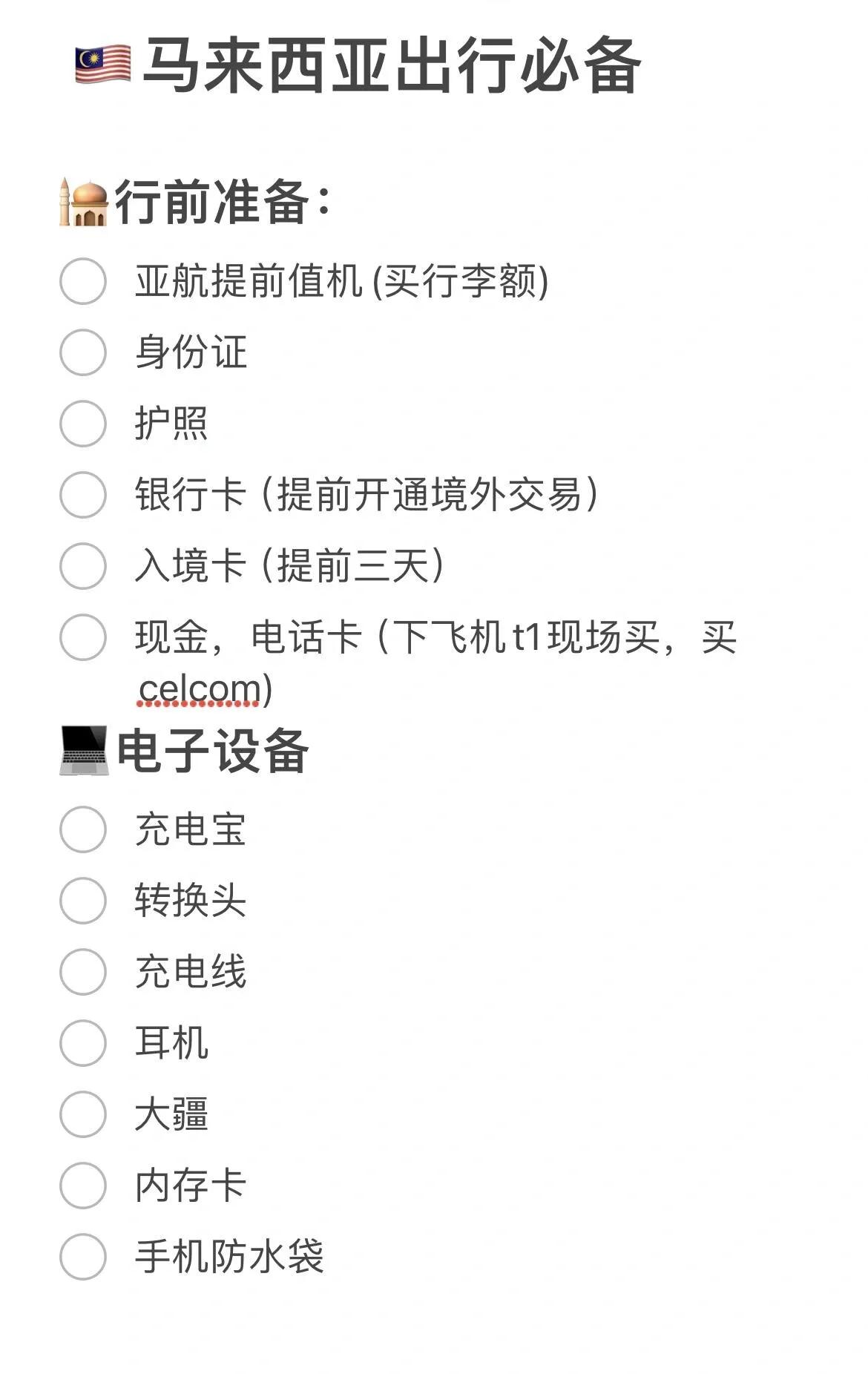 希望这份清单能帮助你为马来西亚之旅做好充分准备。祝你旅途愉快,收获满满!