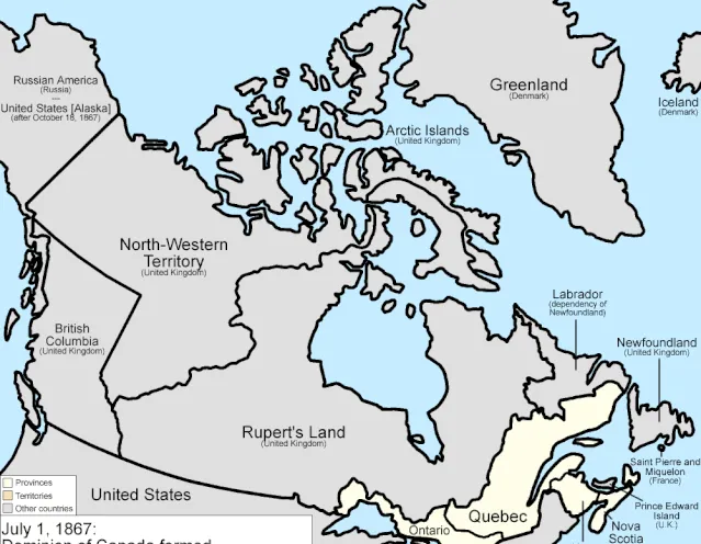 1867至1871年间,英国将多个北美地区划入加拿大,面积扩增八倍,成为面积达960万平方公里的国家。