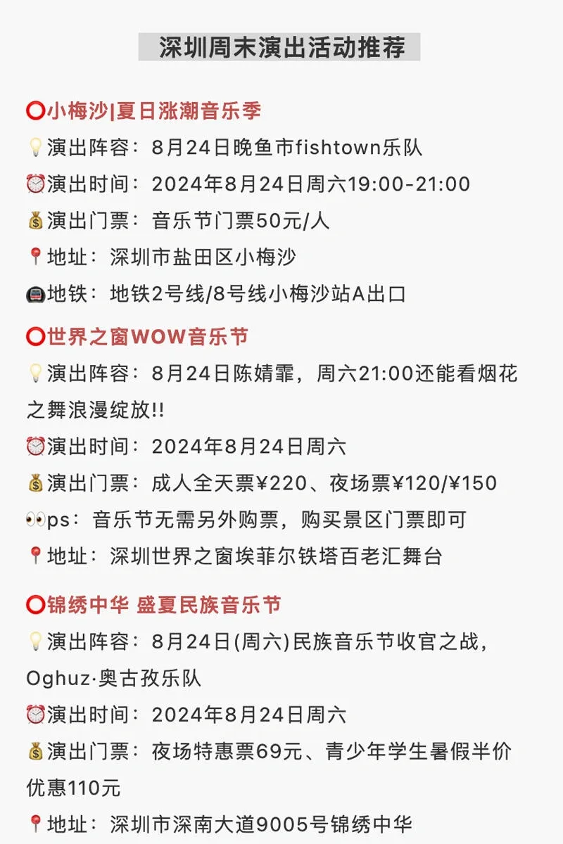 世界之窗WOW音乐节,8月24日有陈婧霏演出,周六21:00还有烟花表演。