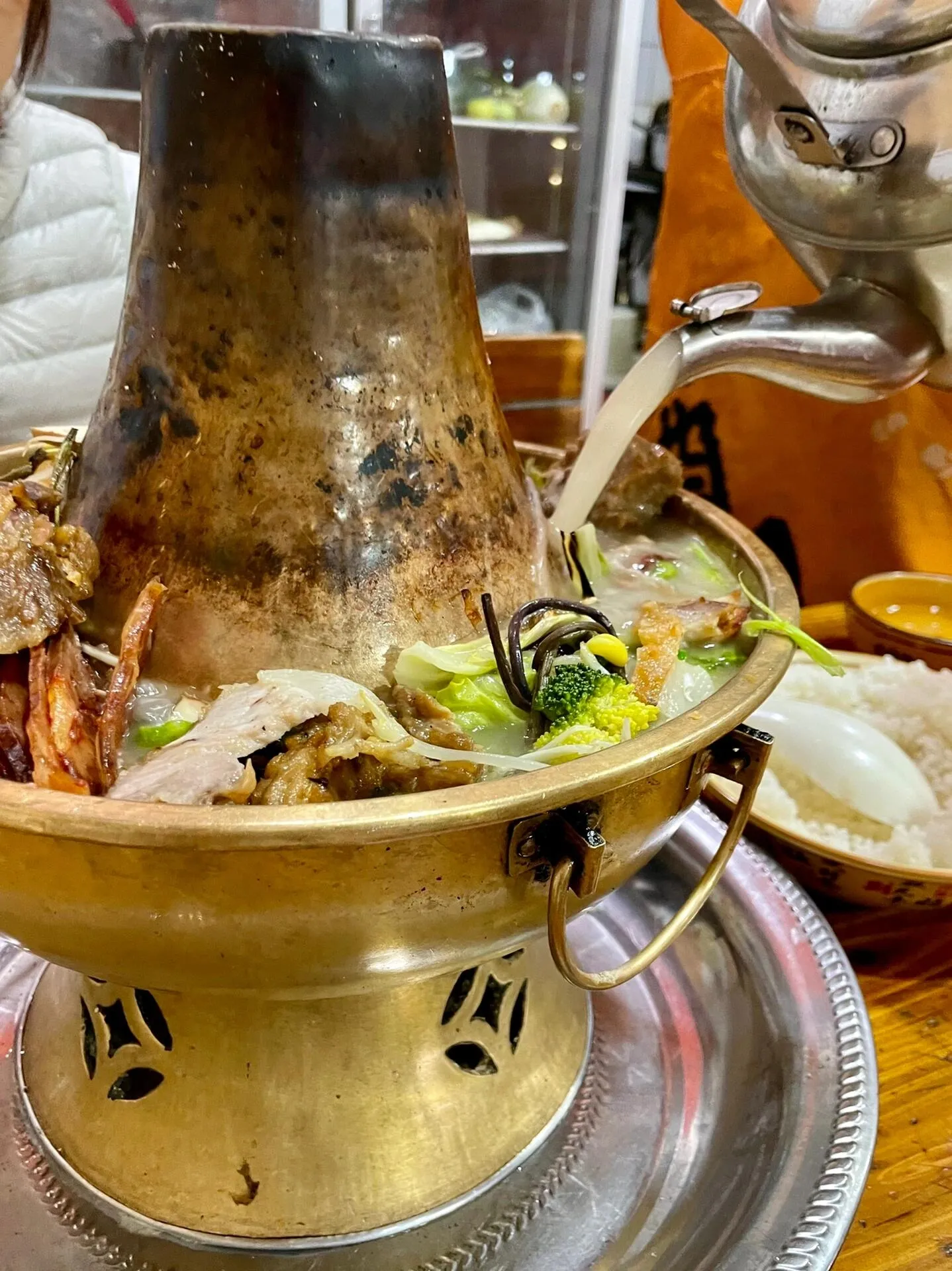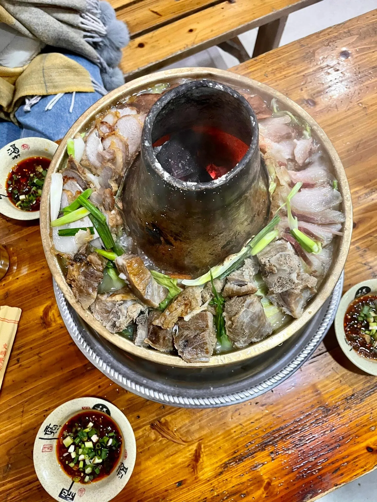 来到马尔康市,我们品尝了乡村印象土火锅。三个人点一个小锅就够了,里面有腊香肠、腊排骨、腊五花、酥肉,还有20种配菜,丰富多样。