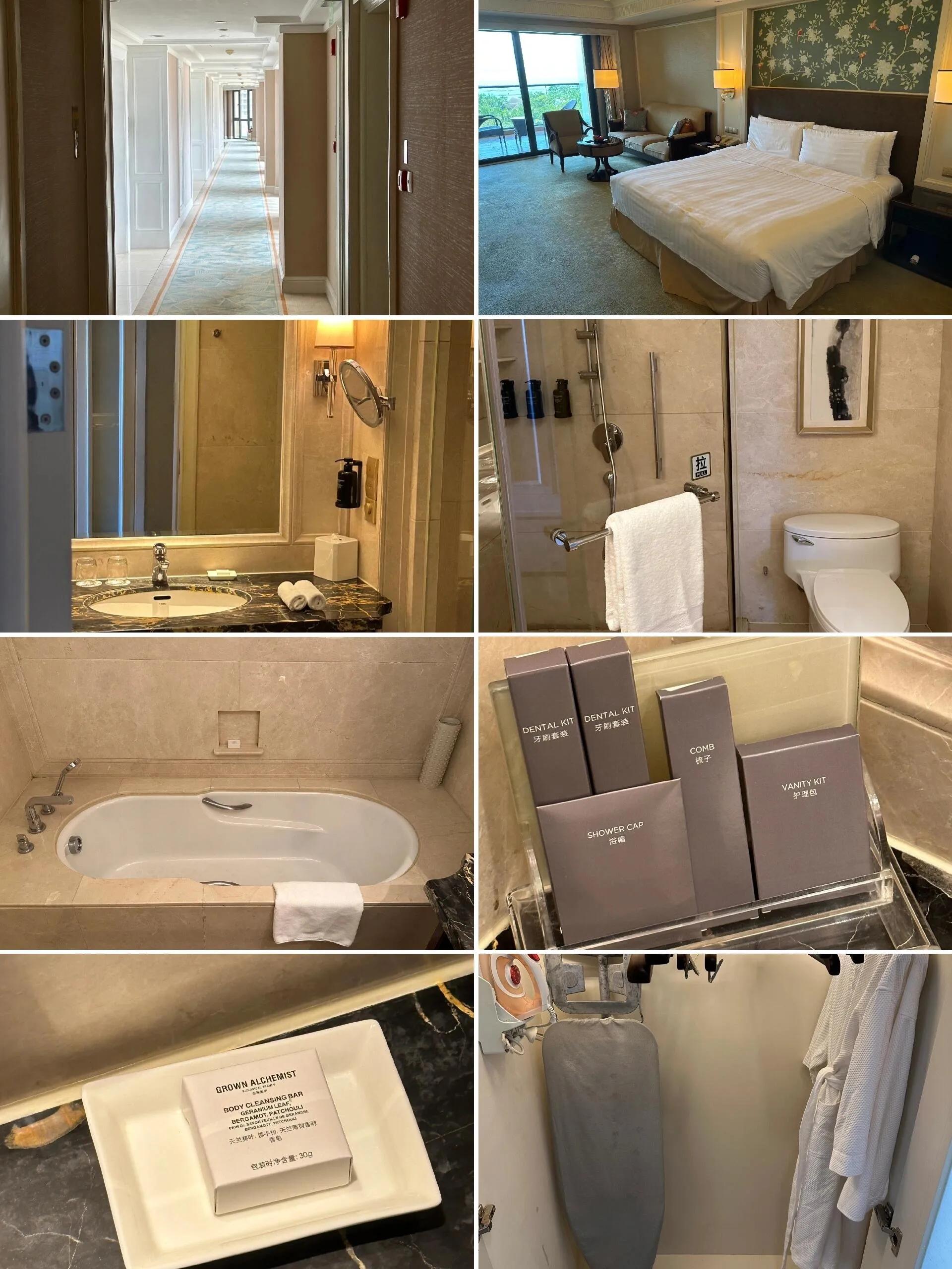 房间为45平方米的高级海景大床房,带阳台。整体装修略显陈旧,有些细节需要改进,如毛巾架位置不佳,马桶没有隔门。开阳台门时空调会自动断电,锁上才运转。隔音效果一般,能听到楼道声音。但房间也有亮点,如GrownAlchemist品牌的大瓶洗漱用品,木质牙刷和梳子,舒适的拖鞋等。minibar提供免费的可乐、雪碧和小瓶茶π。房间景观极佳,正对大海,天气好时可以看到对面的湛江。