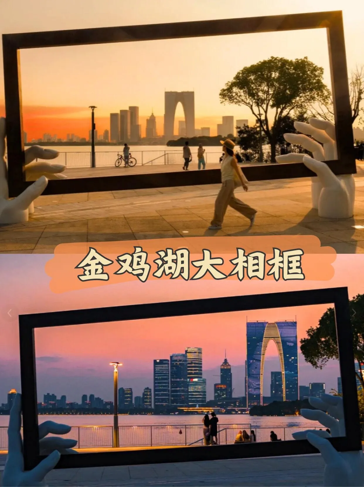 步行10分钟即可到达月光码头,途中会经过一个大相框打卡点。 傍晚时分,通过相框可以将金鸡湖日落与东方之门完美构图 ,十分上镜。