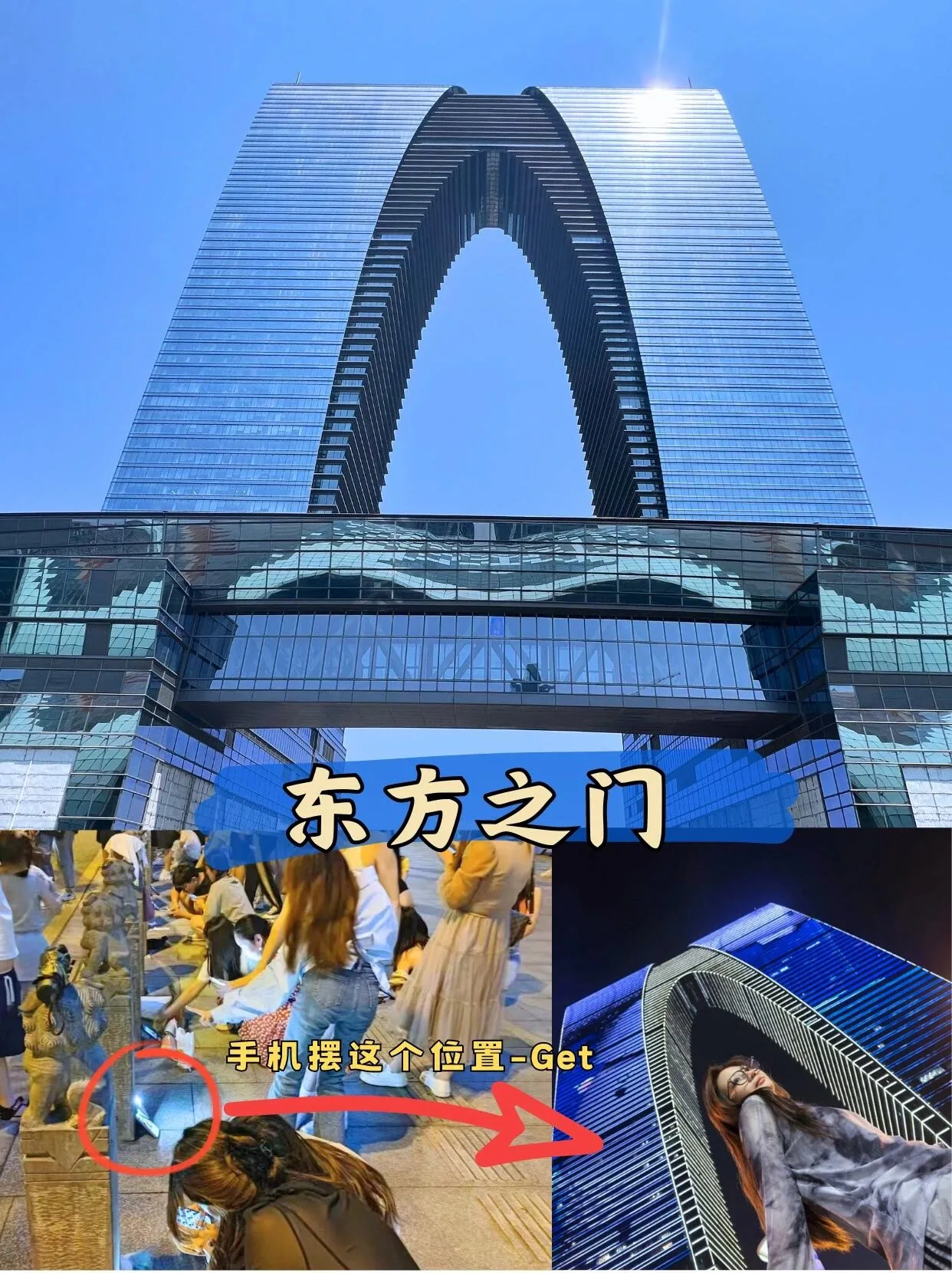 东方之门是此行的重点 ,从望湖阁码头步行几百米即可到达。这里有个小技巧:将手机放在小石狮子柱子上,开启0.5倍广角,就能拍出网红同款照片。