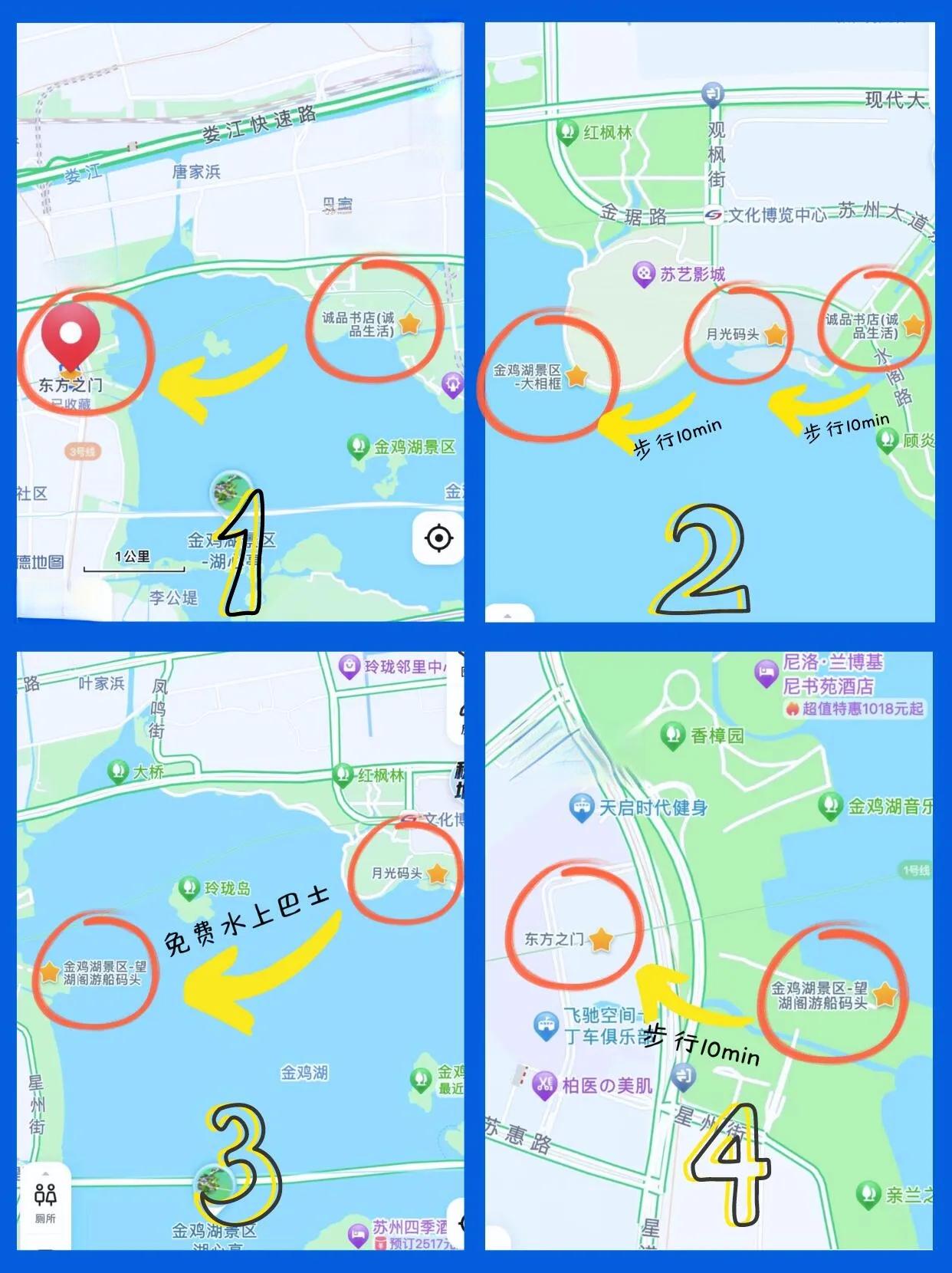 这条路线串联了诚品书店、大相框、月光码头、水上巴士、东方之门等多个景点,既能欣赏美景,又能品尝美食,是体验苏州金鸡湖区域的绝佳选择。