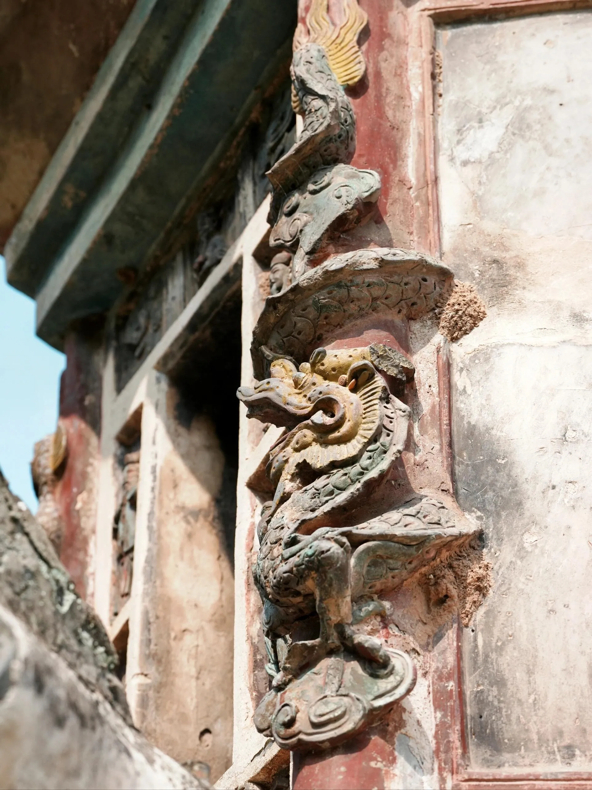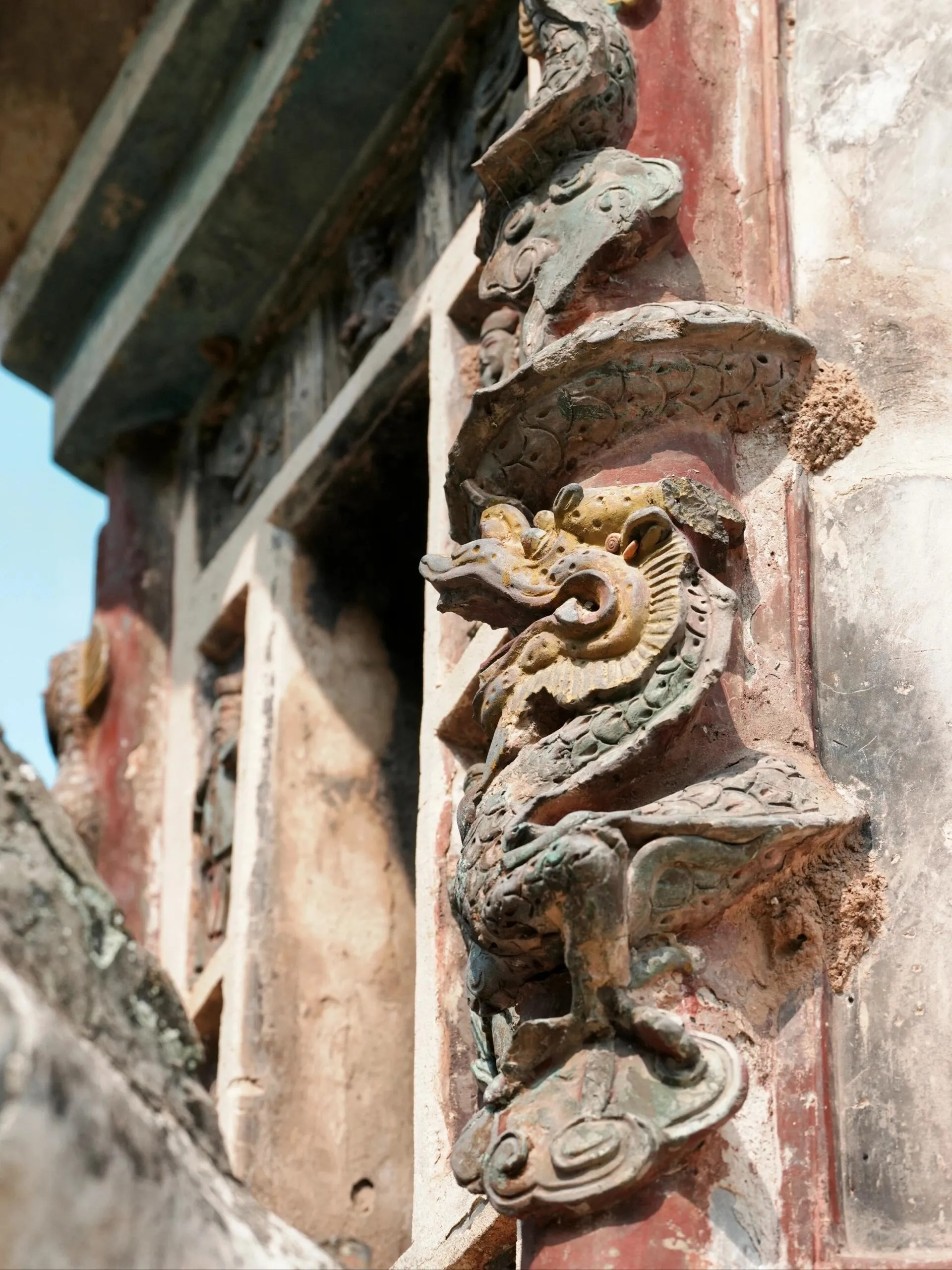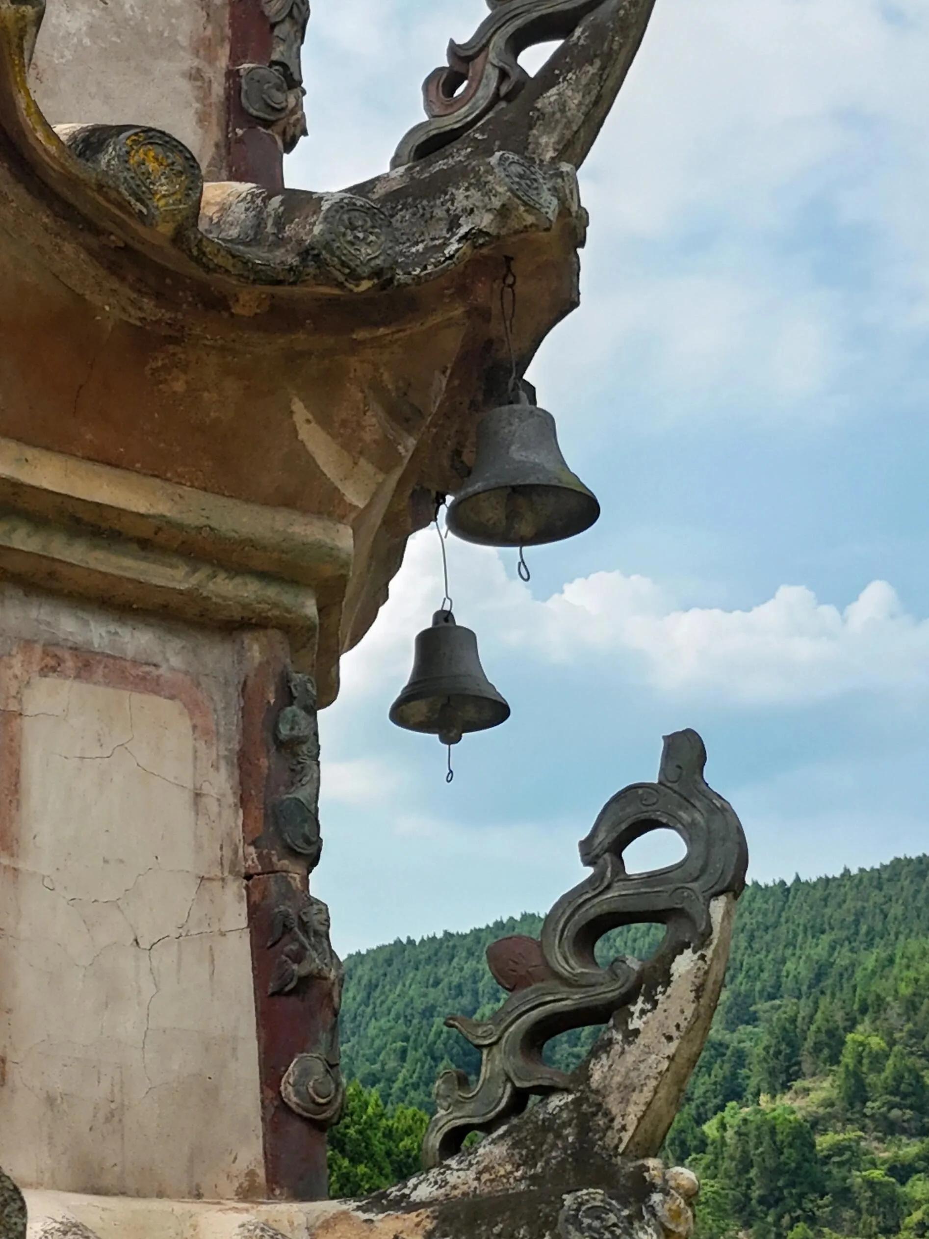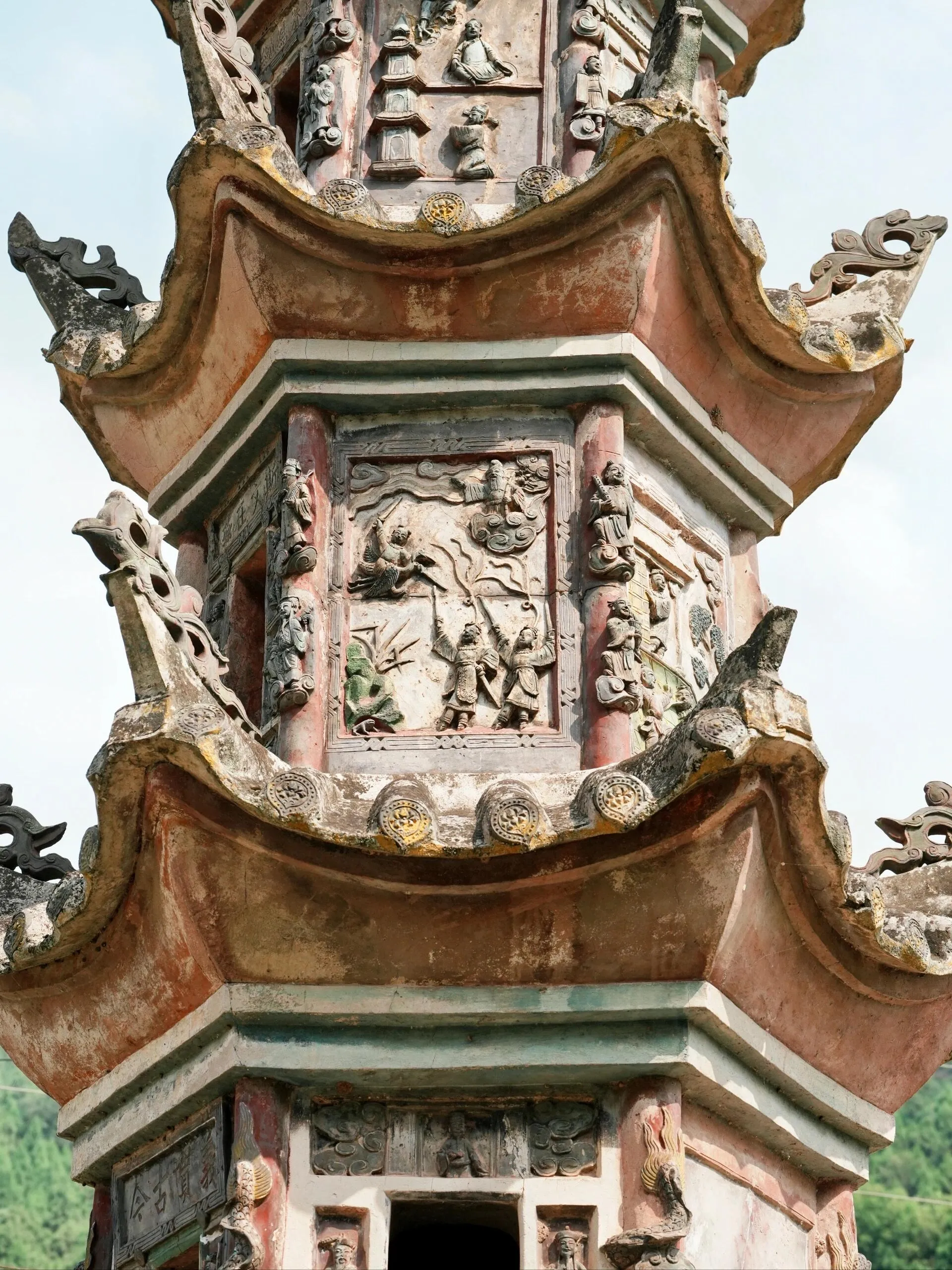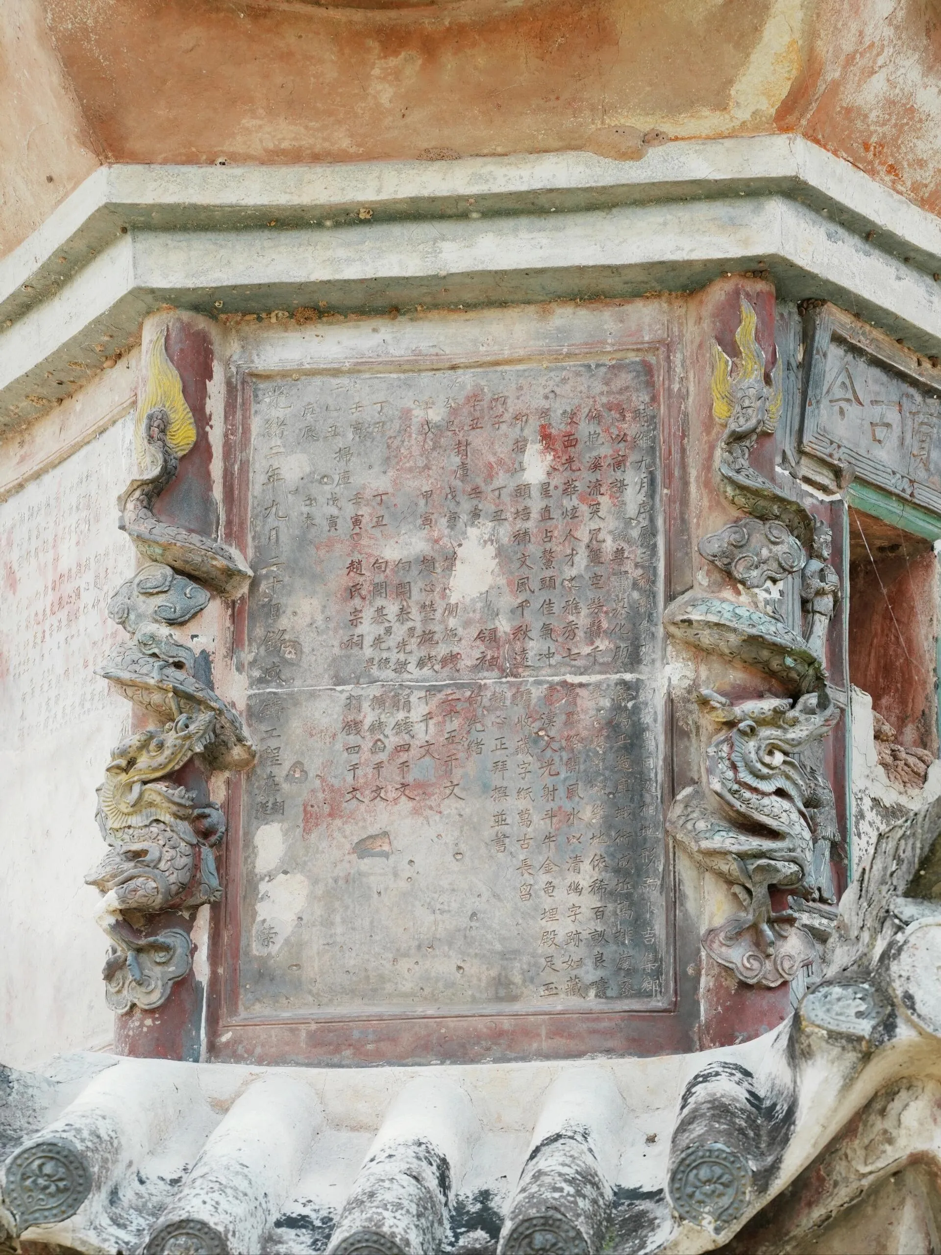 最为独特的是塔刹部分,塔顶雕刻有文武二魁像,脚踏莲花座,这在其他古塔中很少见到。整座塔远看气势磅礴,近看细节精美。塔身上的彩绘虽然略有斑驳,但整体保存完好。站在塔下,仿佛能想象当年这座七彩古塔矗立在青山绿田之中的壮观景象。