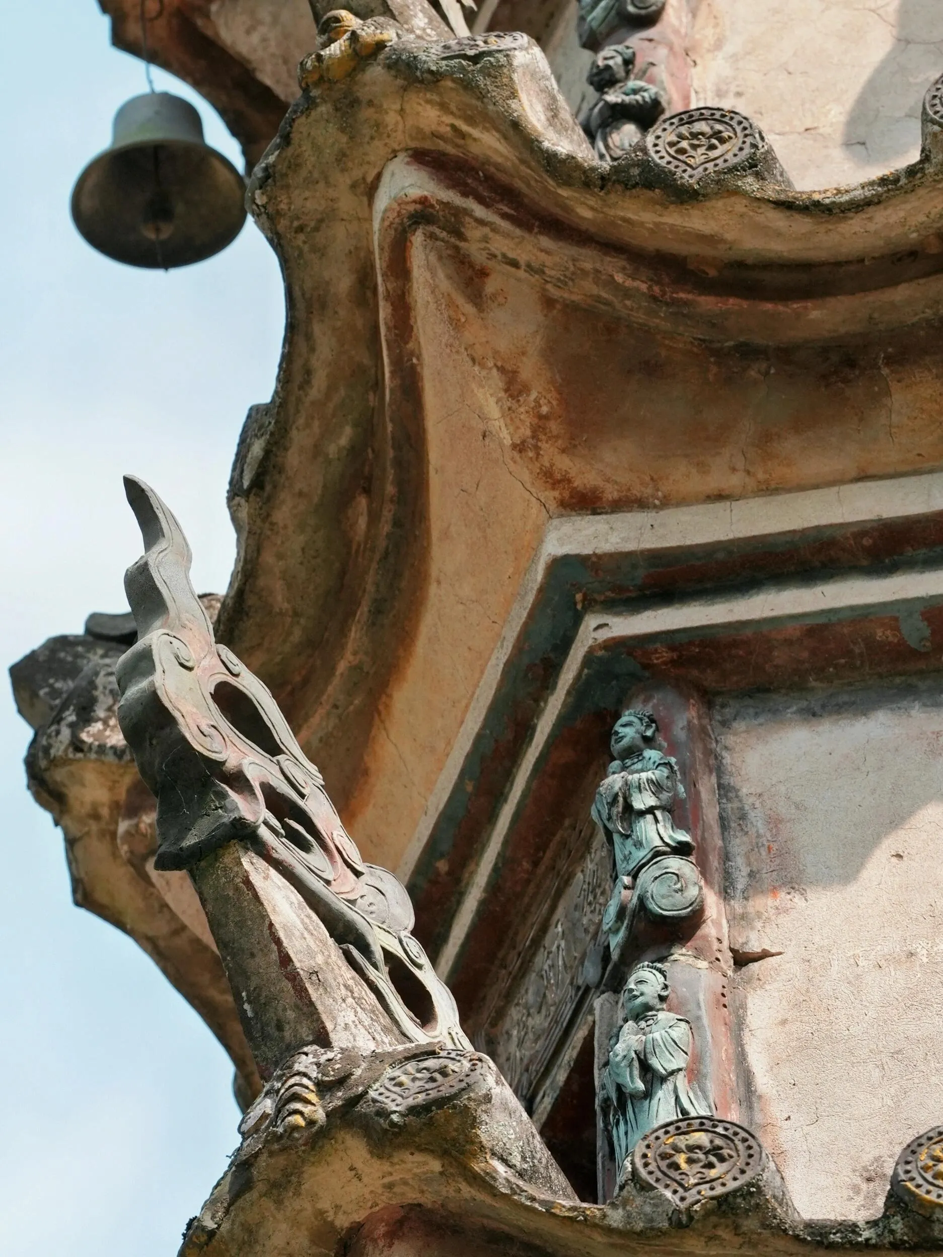 塔身第一层为石制,每个角落都有石撑耳,用以稳固高耸的塔身。二层以上的每一层都有伪饰门窗,或开孔焚字,或设置龛位,或雕刻篆体题名,或砖雕典故,细节丰富多样。第二至六层各有六根立体镂空石柱,上面雕刻有滚龙报柱、云蒸霞蔚等图案,形态各异,栩栩如生。各层塔檐飞檐桃角,如金凤欲飞,檐角悬挂着18口铜质小钟。