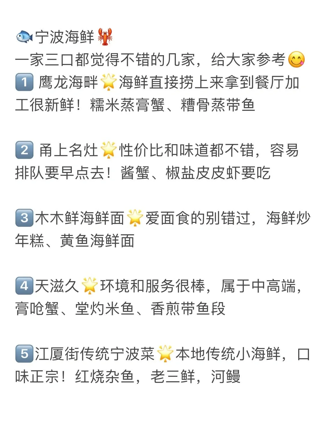 海鲜美食:宁波海鲜种类丰富,味道鲜美,值得一试。