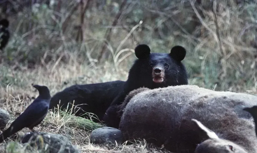 在克什米尔地区,一只黑熊正在准备享用美味的鹿尸。