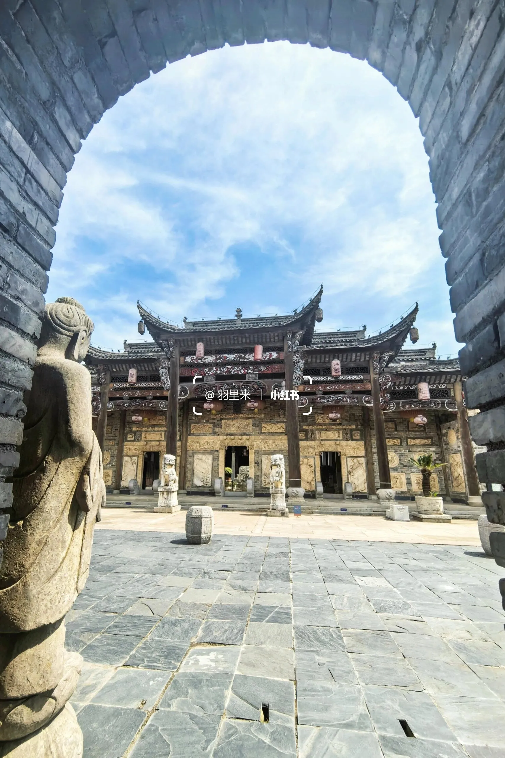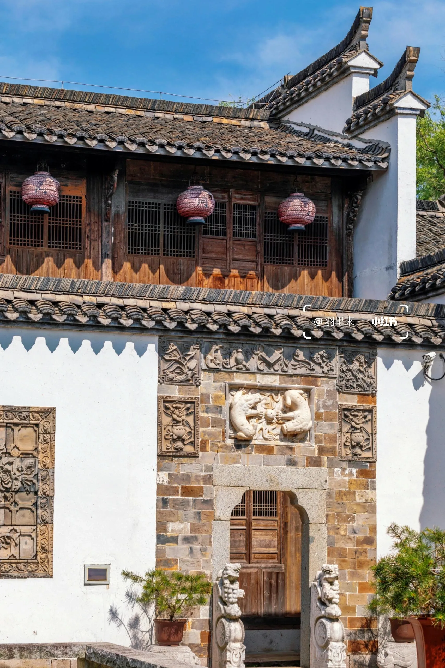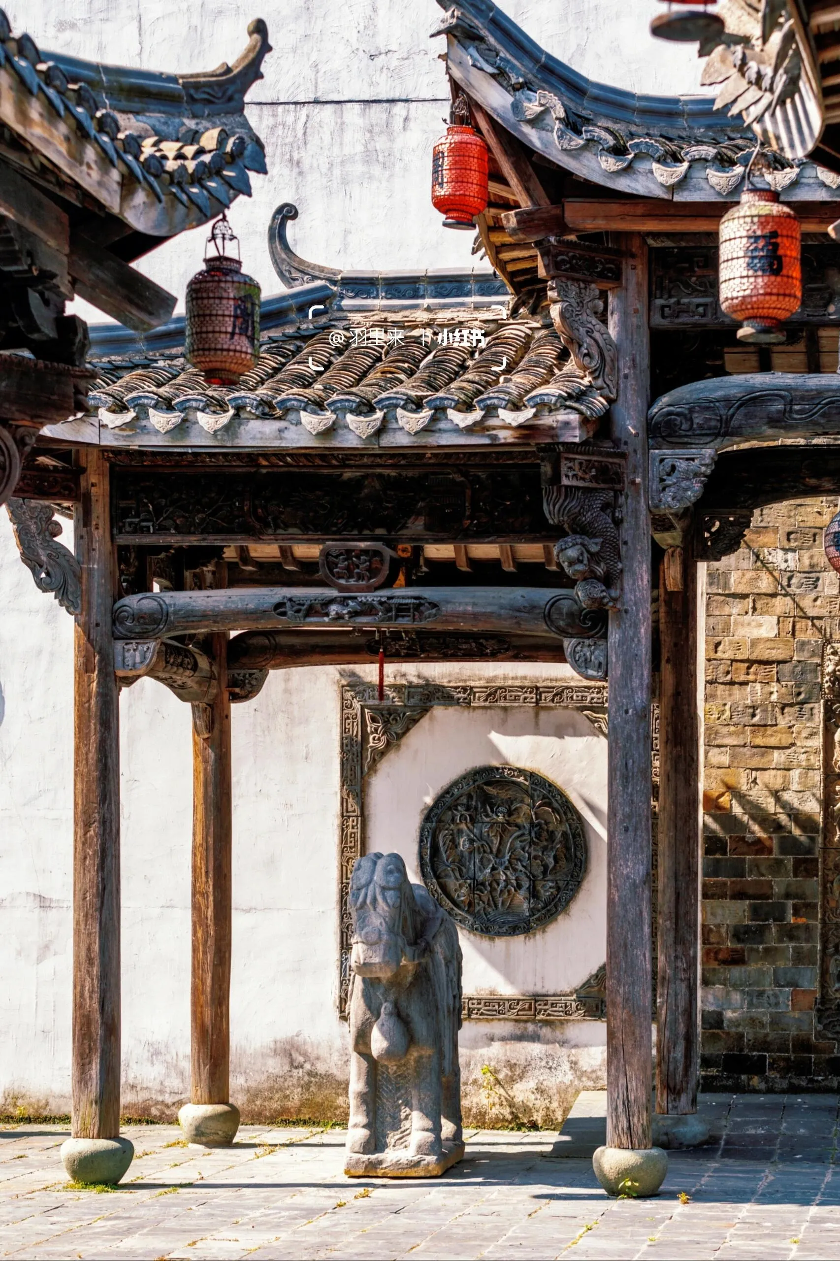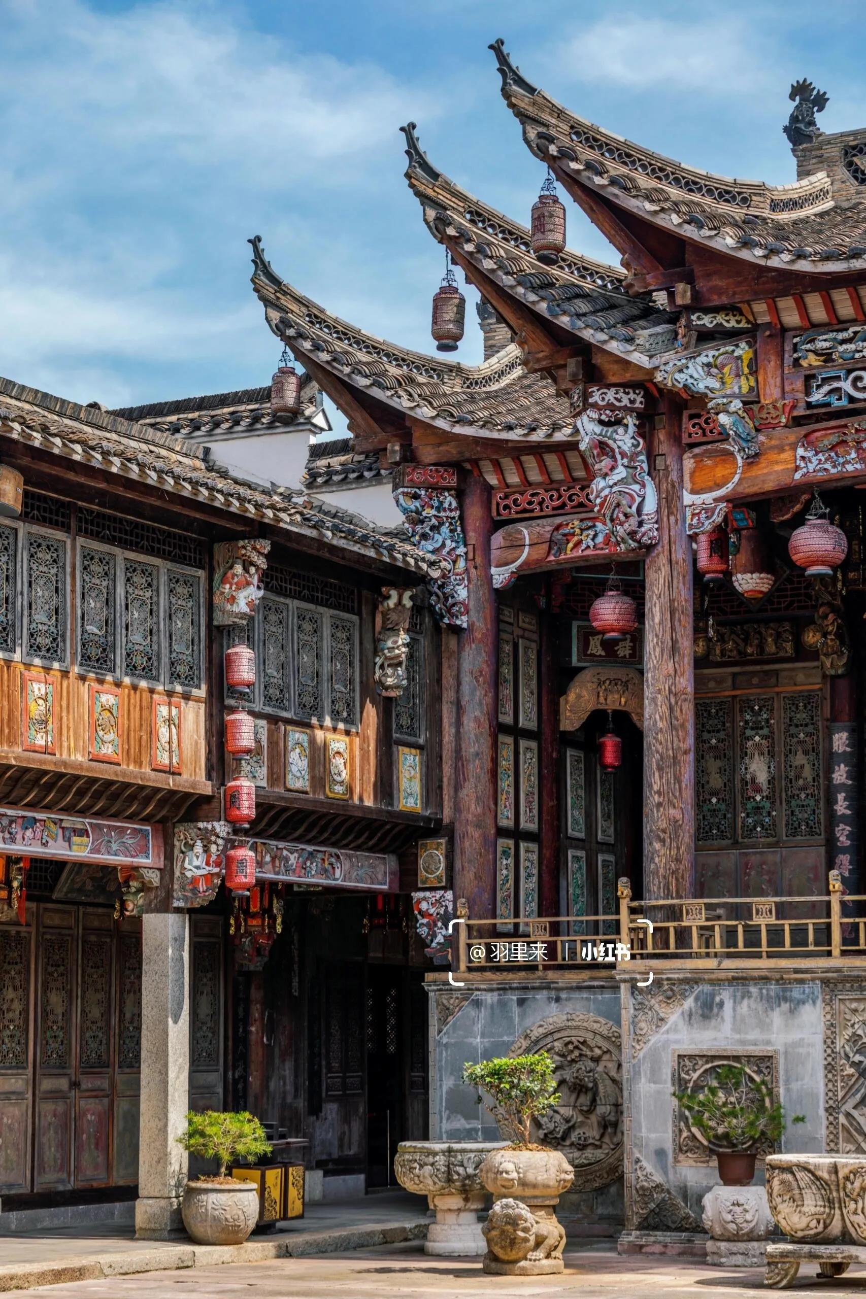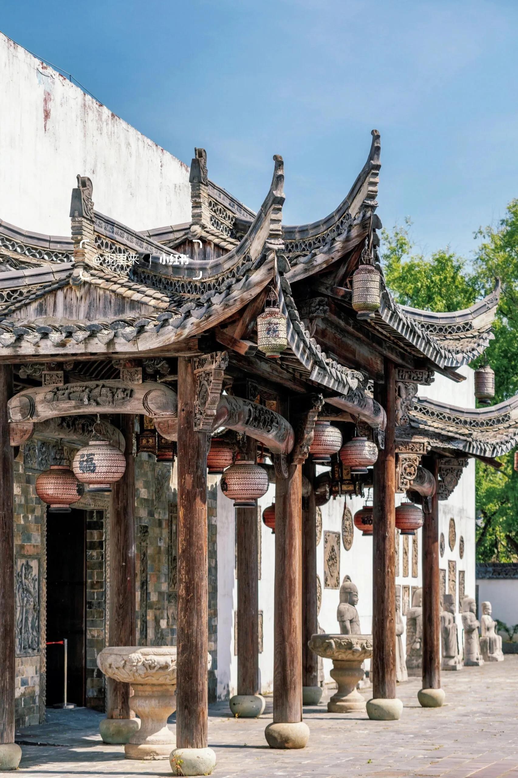 我最喜欢的是周家大院。能在南京一览“青砖小瓦马头墙,回廊挂落花格窗”的徽派古建之美,真的让人欣喜若狂。这些建筑是从皖南及皖赣边界整体搬迁而来,由上百名工匠按原样异地复建的。这里非常适合拍摄汉服人像,而且因为游客稀少,可以尽情拍摄。