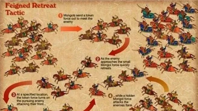 蒙古人作战有两种非常重要的战术,第一种是“迂回包抄”,第二种是“退兵回袭”。