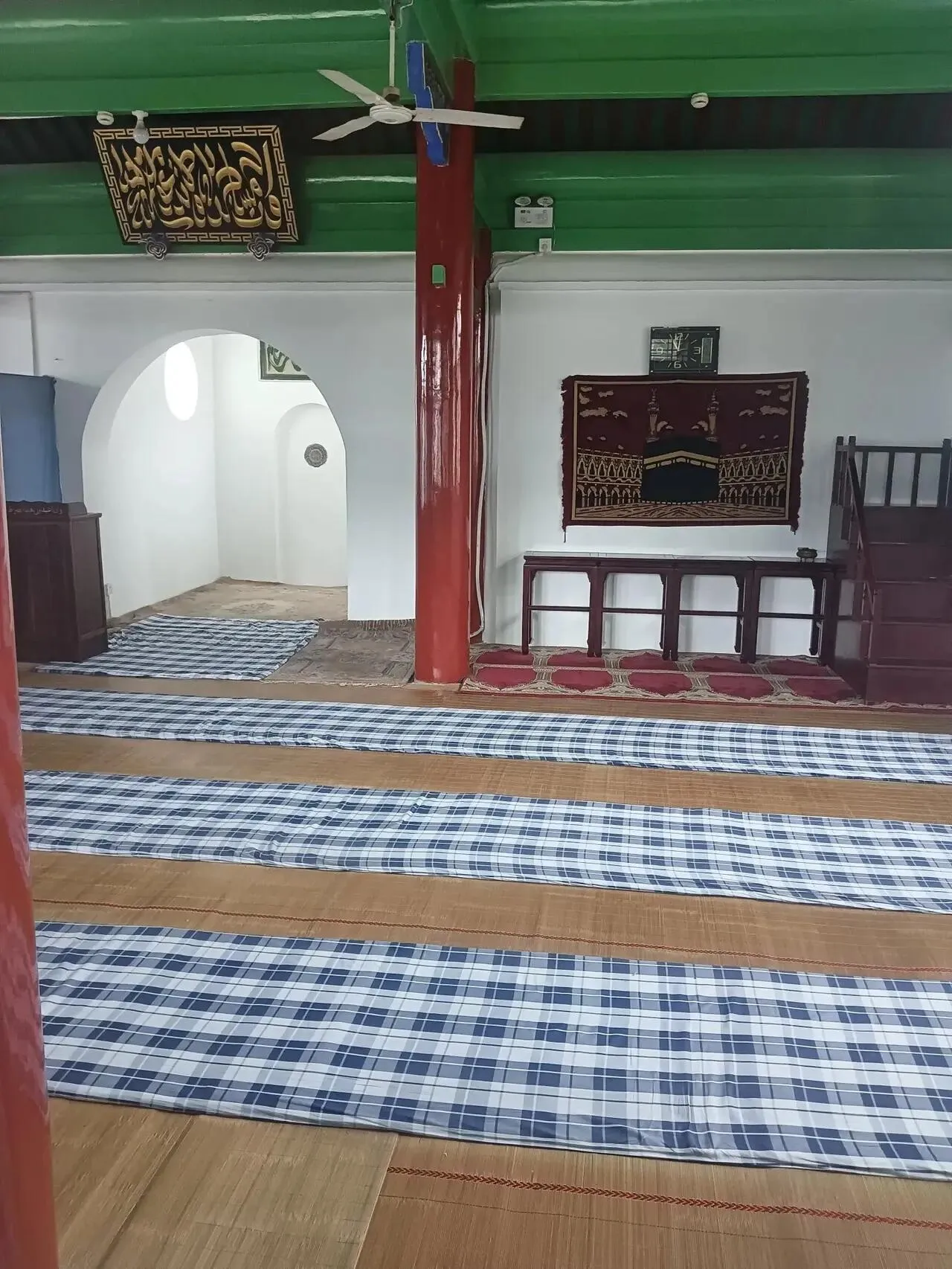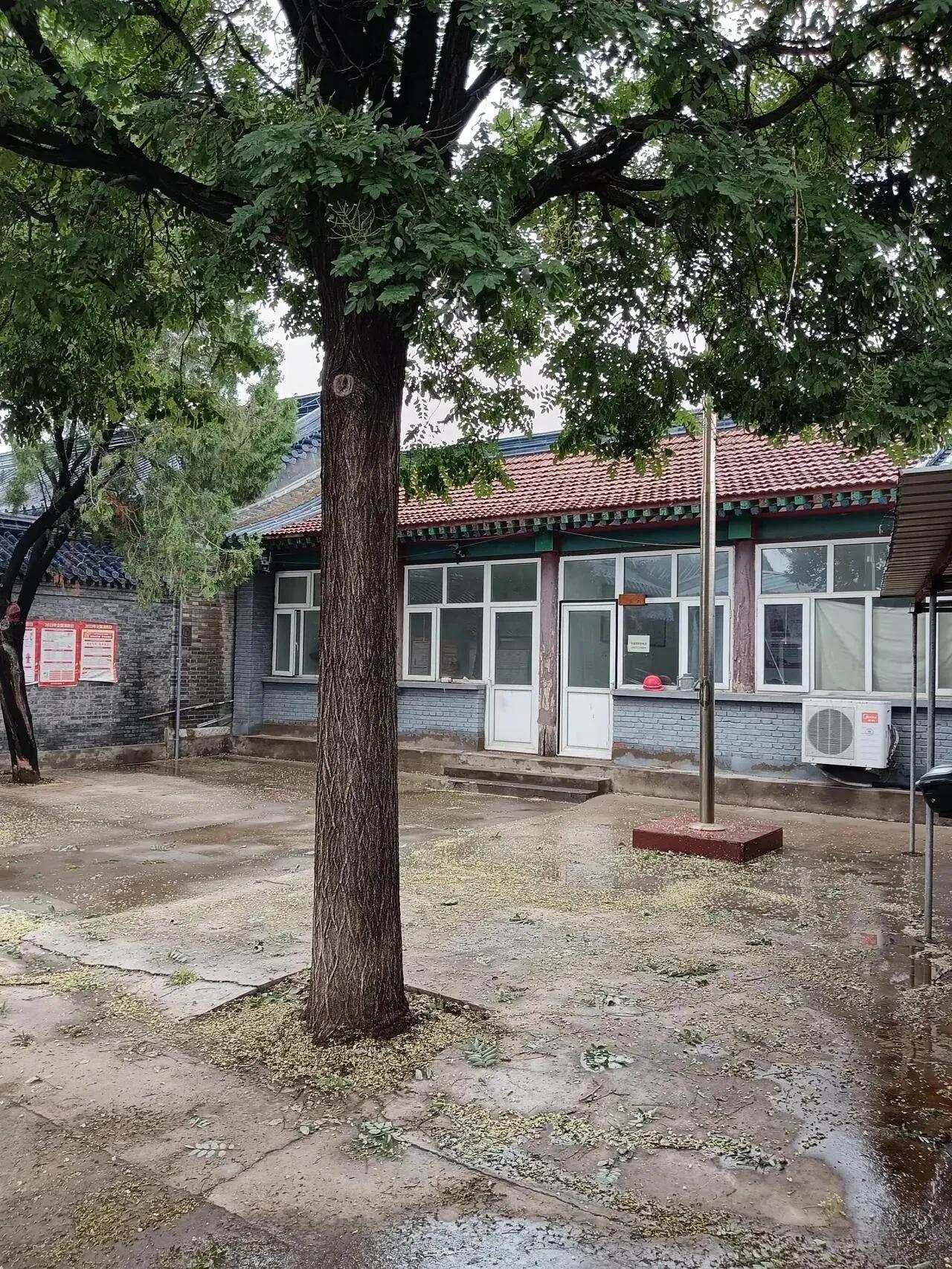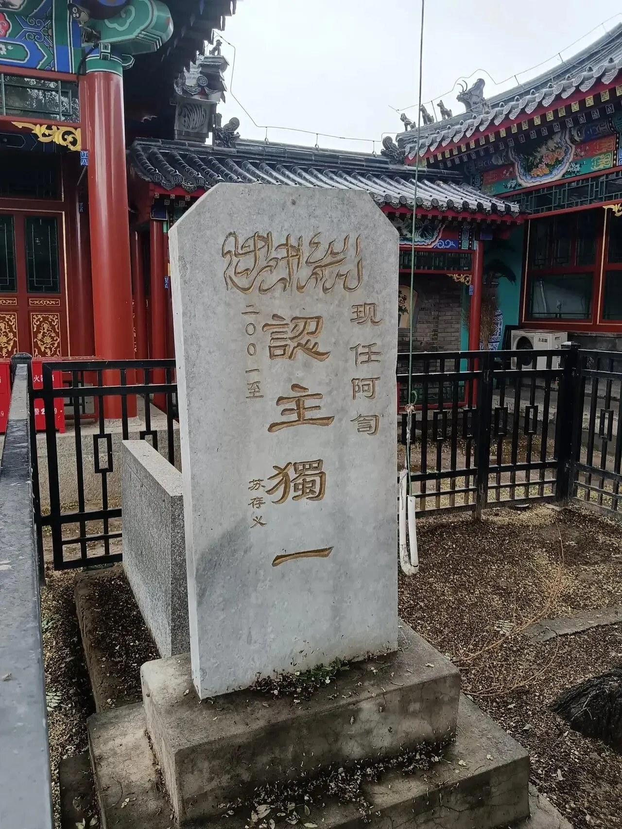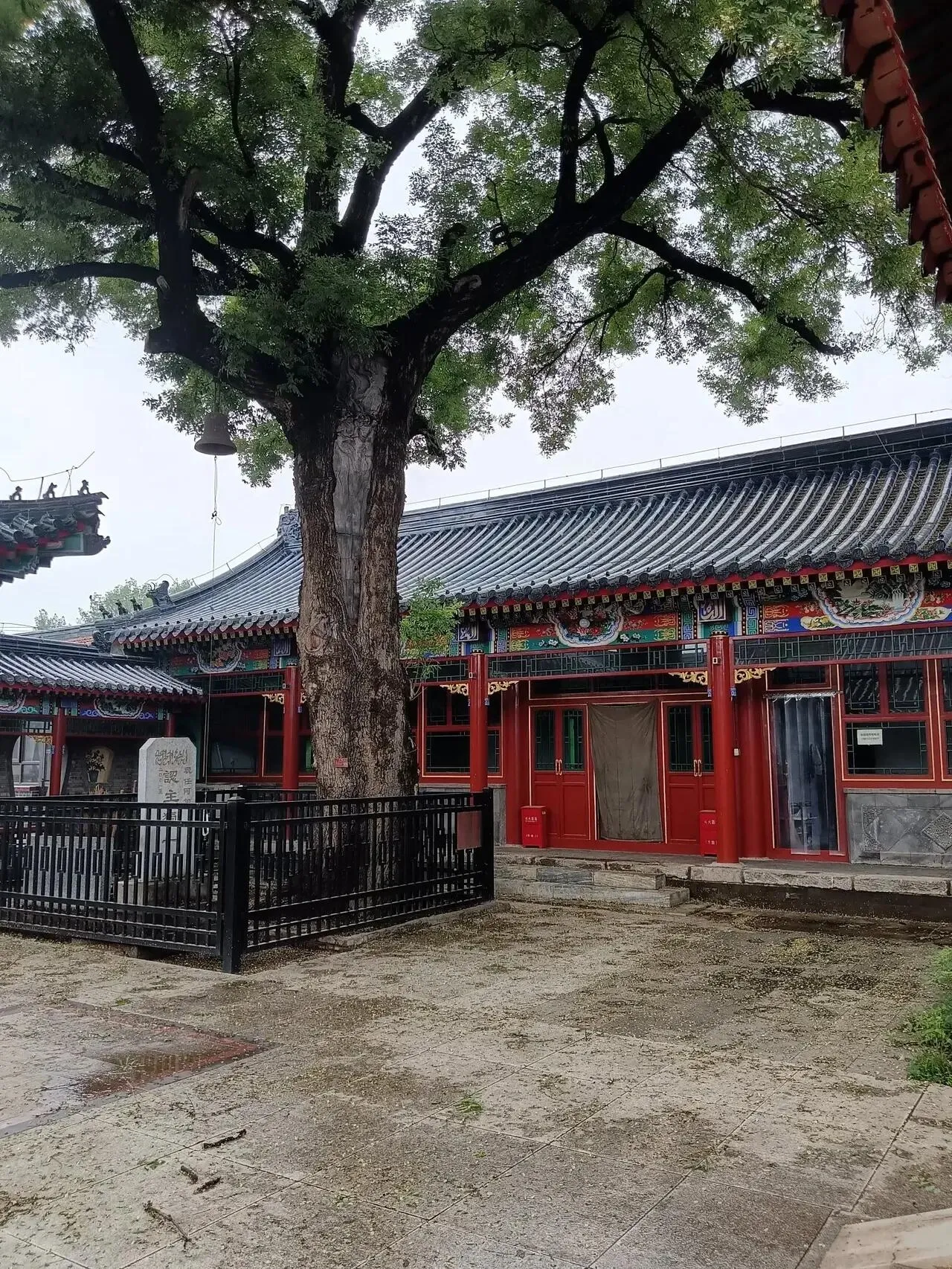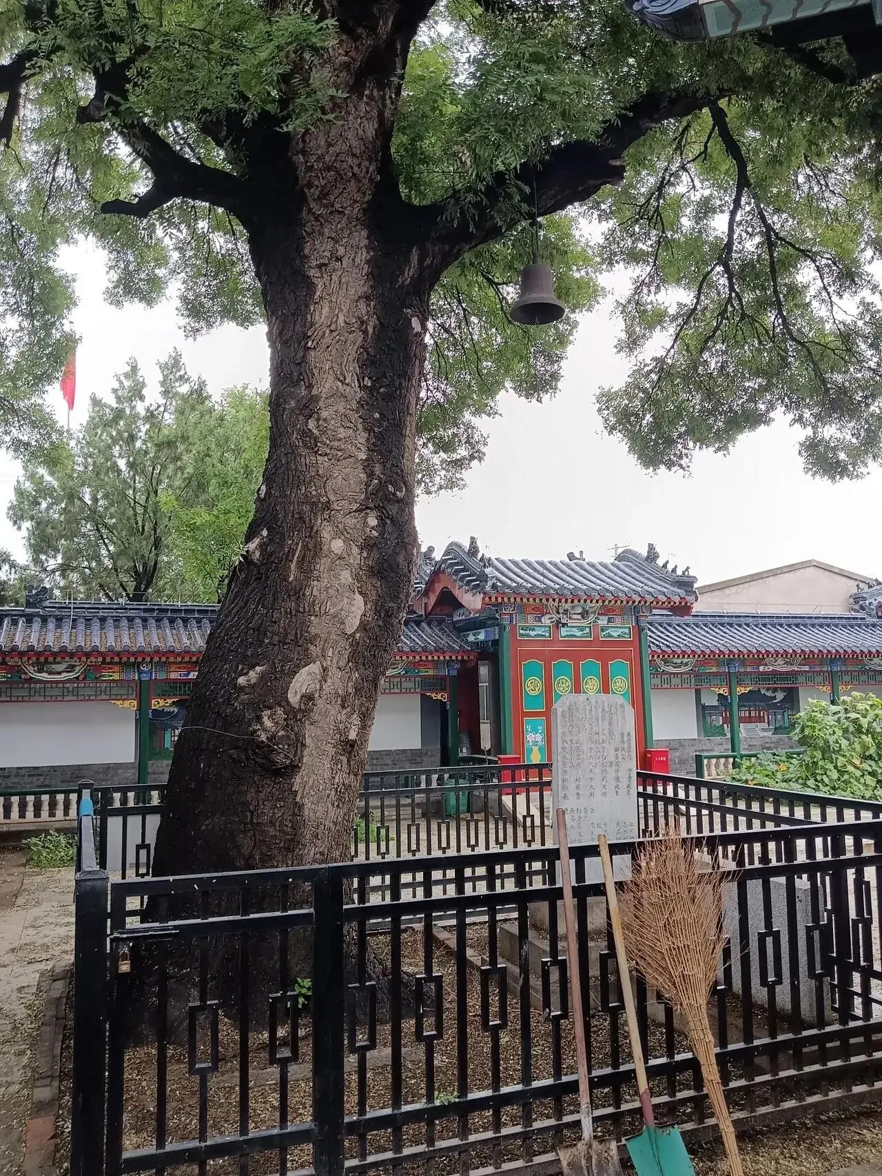 礼拜殿前方两侧各立有一座石碑。南侧的石碑上刻有重修清真寺的碑记,而北侧石碑上则写着“认主独一”四个字。在北侧石碑旁,有 一棵令人惊叹的古槐树 。 这棵树胸径超过一米 ,被列为国家一级古树。它枝繁叶茂,生机勃勃,为这座古老的清真寺增添了几分生气。