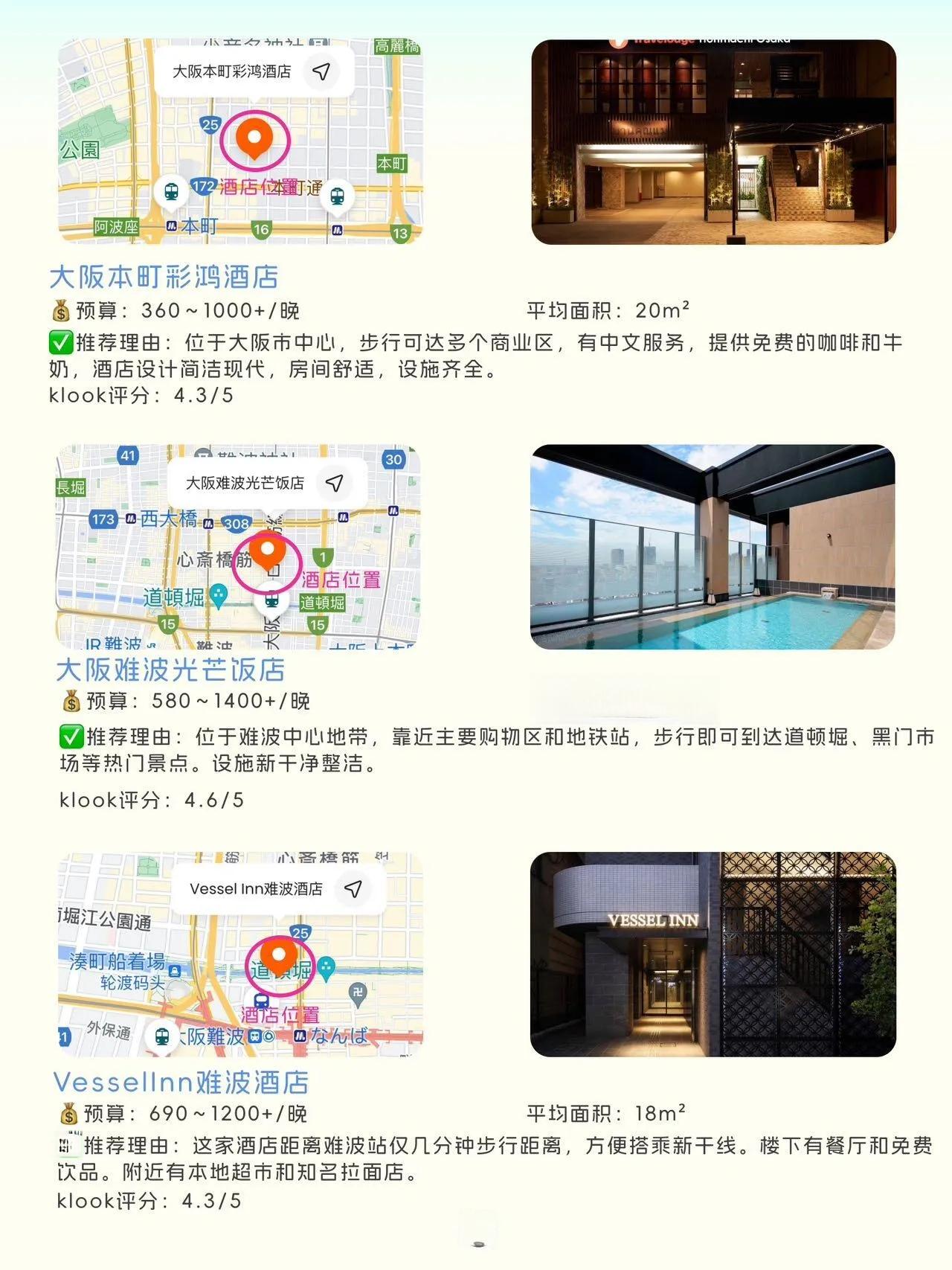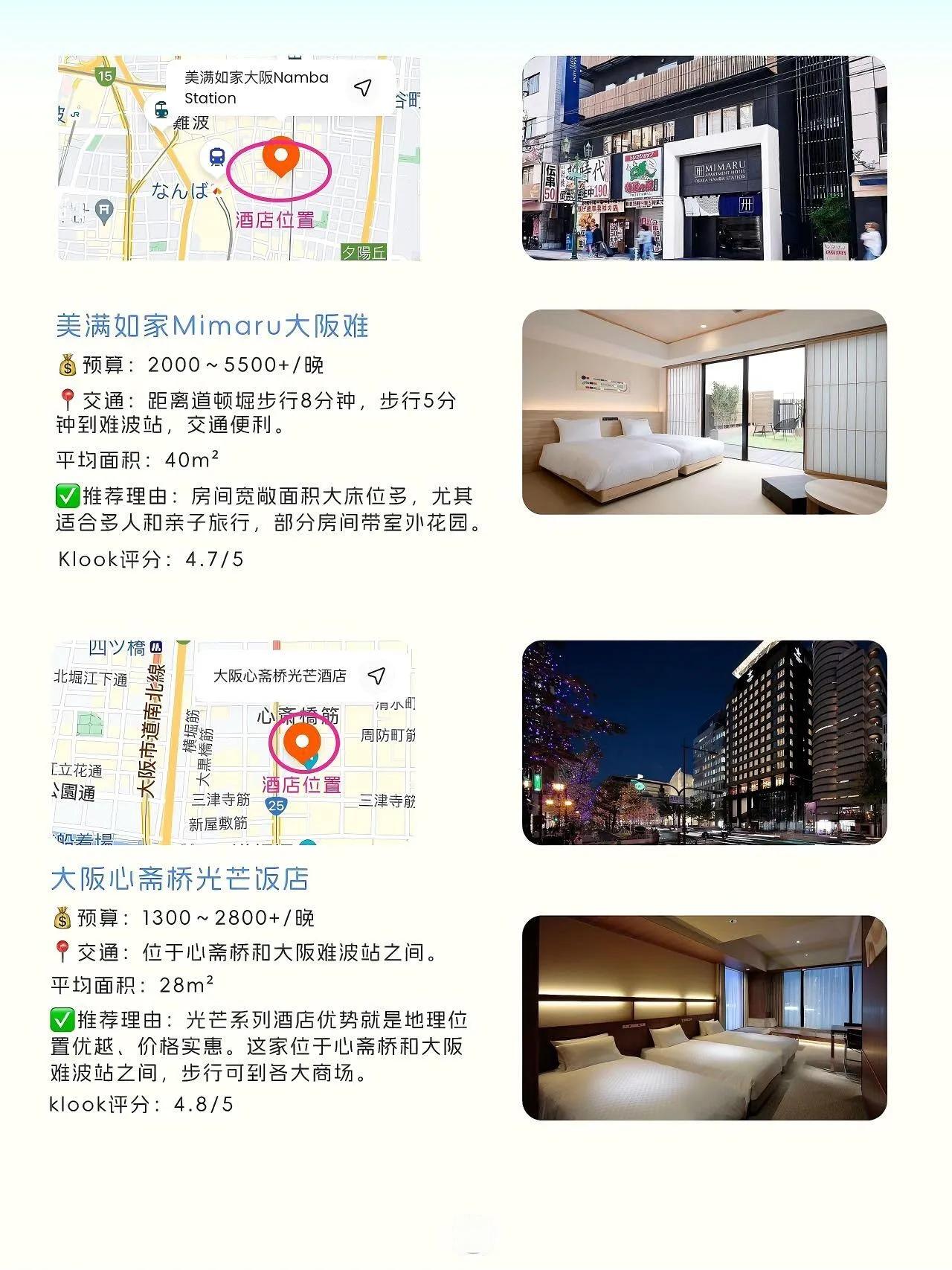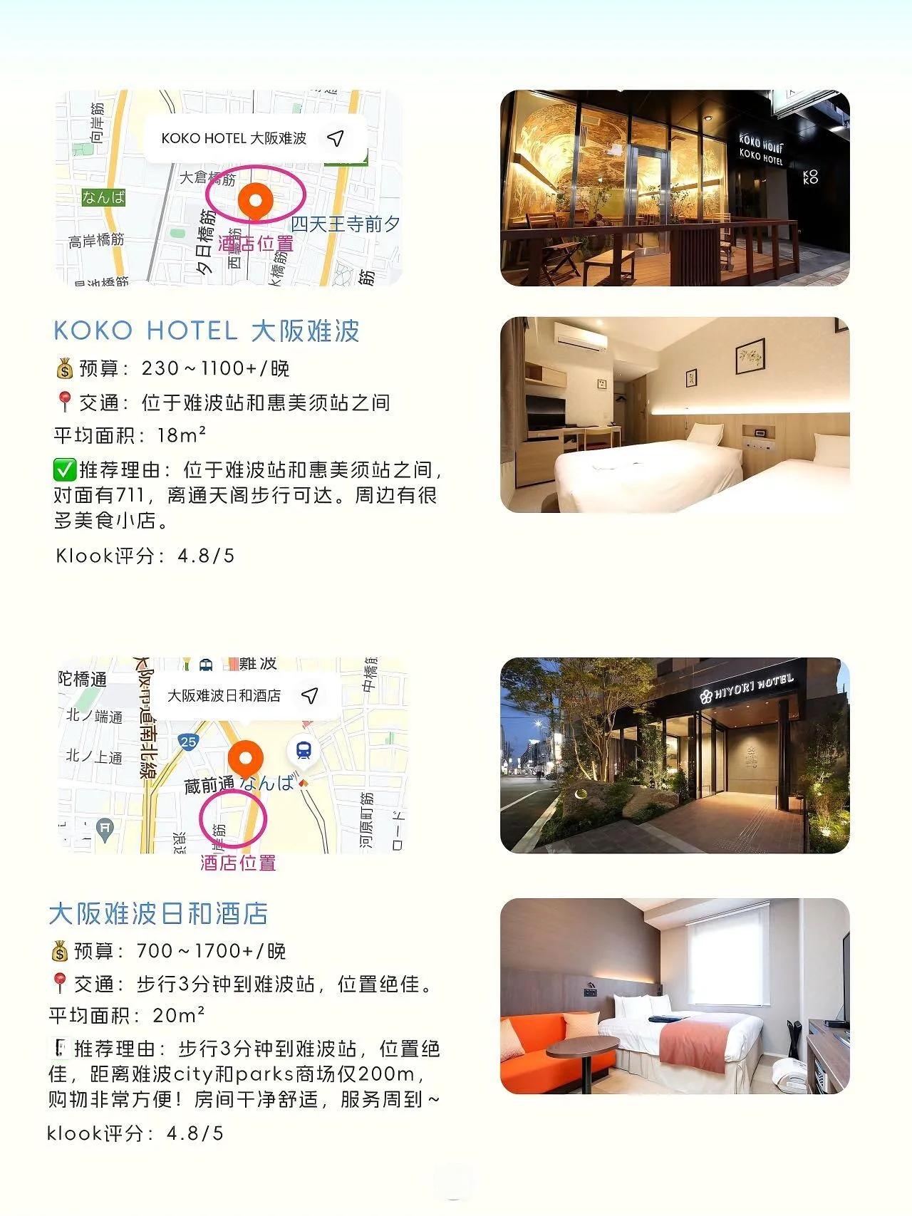 这些酒店都位于交通便利的位置,靠近难波站或其他主要车站,方便游客探索大阪的各个景点。无论是预算有限的背包客,还是寻求舒适住宿的旅行者,都能在这里找到适合的选择。