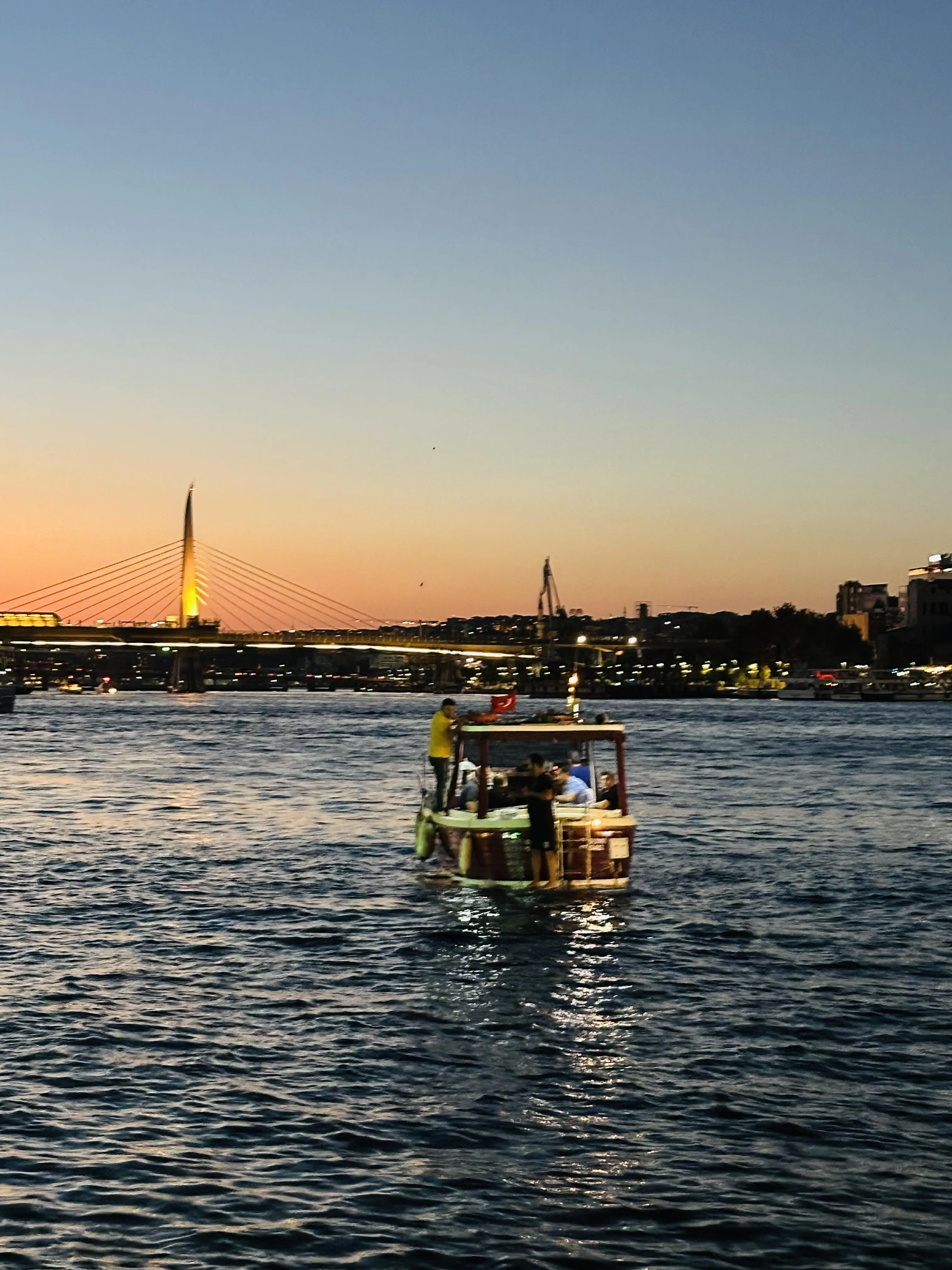 19:00在Eminönü码头乘船(约每20分钟一班),找到前往亚洲区Kadıköy的入口。用公交卡可以直接上船,航程约25分钟。建议坐在二楼甲板右侧,正对精华区域,可以欣赏日落时的美丽光景。